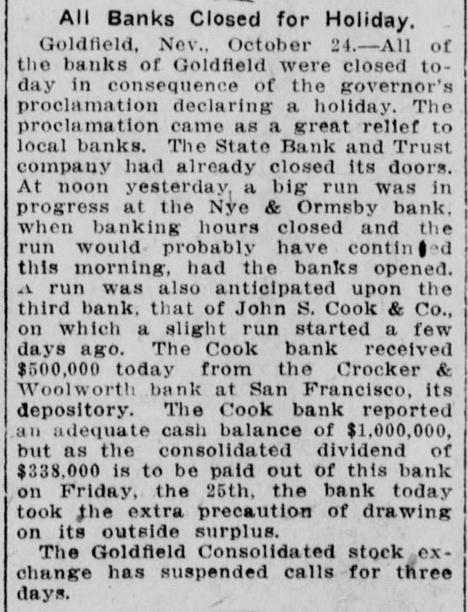 All Banks Closed for Holiday. Goldfield, Nev., October 24.-All of the banks of Goldfield were closed today in consequence of the governor's proclamation declaring a holiday. The proclamation came as a great rellef to local banks. The State Bank and Trust company had already closed its doors. At noon yesterday, a big run was in progress at the Nye & Ormsby bank, when banking hours closed and the run would probably have contin ed this morning, had the banks opened. A run was also anticipated upon the third bank. that of John S. Cook & Co., on which a slight run started a few days ago. The Cook bank received $500,000 today from the Crocker & Woolworth bank at San Francisco, its depository. The Cook bank reported an adequate cash balance of $1,000,000, but as the consolidated dividend of $338,000 is to be paid out of this bank on Friday, the 25th, the bank today took the extra precaution of drawing on its outside surplus. The Goldfield Consolidated stock exchange has suspended calls for three days.