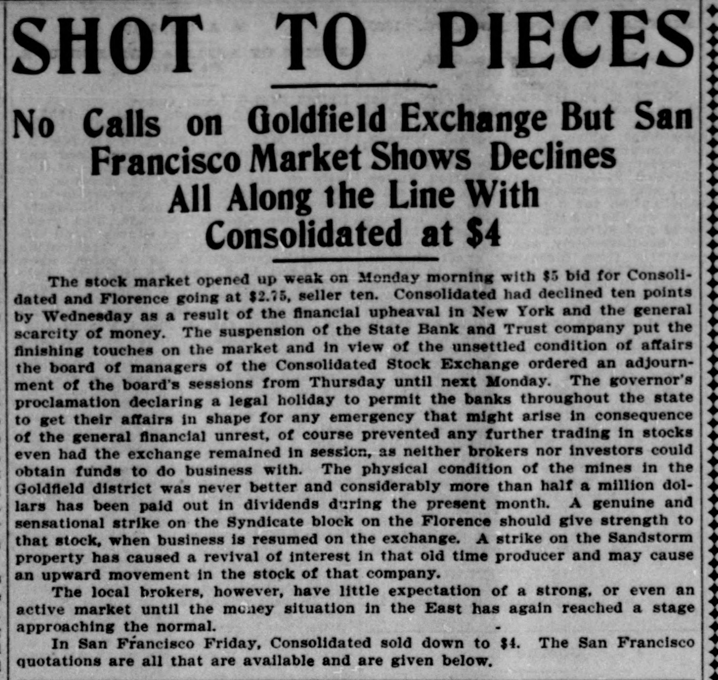 SHOT TO PIECES No Calls on Goldfield Exchange But San Francisco Market Shows Declines All Along the Line With Consolidated at $4 The stock market opened up weak on Monday morning with $5 bid for Consolidated and Florence going at $2.75, seller ten. Consolidated had declined ten points by Wednesday as a result of the financial upheaval in New York and the general scarcity of money. The suspension of the State Bank and Trust company put the finishing touches on the market and in view of the unsettled condition of affairs the board of managers of the Consolidated Stock Exchange ordered an adjournment of the board's sessions from Thursday until next Monday. The governor's proclamation declaring a legal holiday to permit the banks throughout the state to get their affairs in shape for any emergency that might arise in consequence of the general financial unrest, of course prevented any further trading in stocks even had the exchange remained in session, as neither brokers nor investors could obtain funds to do business with. The physical condition of the mines in the Goldfield district was never better and considerably more than half a million dollars has been paid out in dividends during the present month. A genuine and sensational strike on the Syndicate block on the Florence should give strength to that stock, when business is resumed on the exchange. A strike on the Sandstorm property has caused a revival of interest in that old time producer and may cause an upward movement in the stock of that company. The local brokers, however, have little expectation of a strong, or even an active market until the money situation in the East has again reached a stage approaching the normal. In San Francisco Friday, Consolidated sold down to $4. The San Francisco quotations are all that are available and are given below.