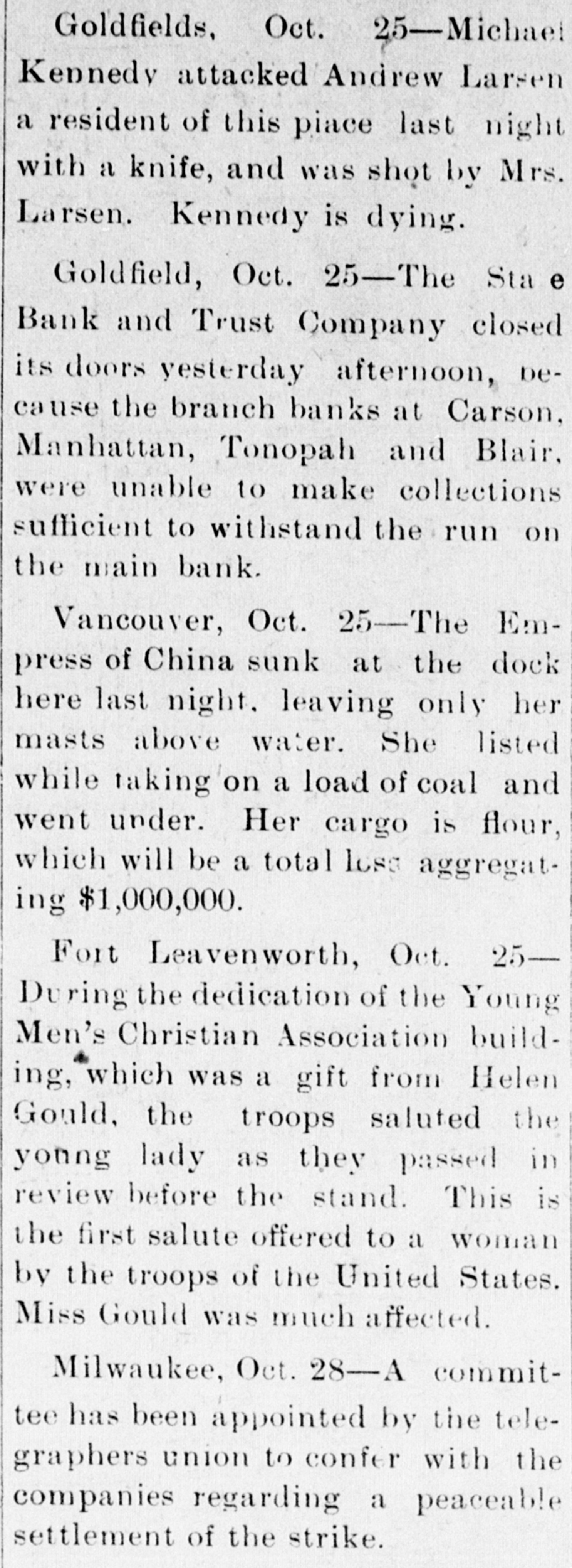 Oct. Goldfields, 25-Michael Kennedy attacked Andrew Larsen a resident of this piace last night with a knife, and was shot by Mrs. Larsen. Kennedy is dying. Goldfield, Oct. 25-The Sta e Bank and Trust Company closed its doors yesterday afternoon, because the branch banks at Carson, Manhattan, Tonopah and Blair, were unable to make collections sufficient to withstand the run on the main bank. Vancouver, Oct. 25-The Empress of China sunk at the dock here last night. leaving only her masts above water. She listed while taking on a load of coal and went under. Her cargo is flour, which will be a total less aggregating $1,000,000. Fort Leavenworth, Oct. 25During the dedication of the Young Men's Christian Association building, which was a gift from Helen Gould, the troops saluted the young lady as they passed in review before the stand. This is the first salute offered to a woman by the troops of the United States. Miss Gould was much affected. Milwaukee, Oct. 28-A committee has been appointed by the telegraphers union to confer with the companies regarding a peaceable settlement of the strike.