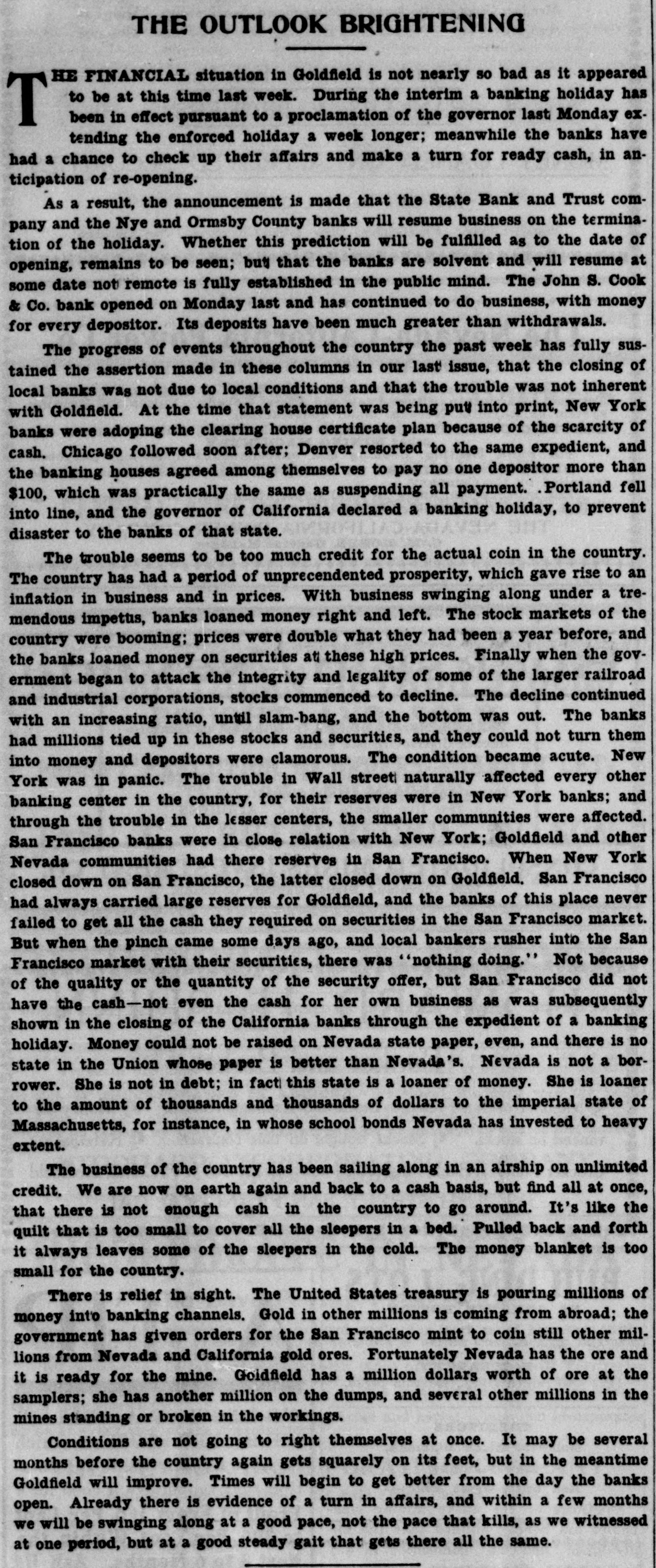 HE FINANCIAL situation in Goldfield is not nearly so bad as it appeared to be at this time last week. During the interim a banking holiday has been in effect pursuant to a proclamation of the governor last Monday extending the enforced holiday a week longer; meanwhile the banks have had a chance to check up their affairs and make a turn for ready cash, in anticipation of re-opening.