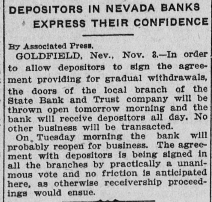 DEPOSITORS IN NEVADA BANKS EXPRESS THEIR CONFIDENCE By Associated Press. GOLDFIELD, Nev., Nov. 3.-In order to allow depositors to sign the agreement providing for gradual withdrawals, the doors of the local branch of the State Bank and Trust company will be thrown open tomorrow morning and the bank will receive depositors all day. No other business will be transacted. On. Tuesday morning the bank will probably reopen for business. The agreement with depositors is being signed in all the branches by practically a unanimous vote and no friction is anticipated here, as otherwise receivership proceedings would ensue.