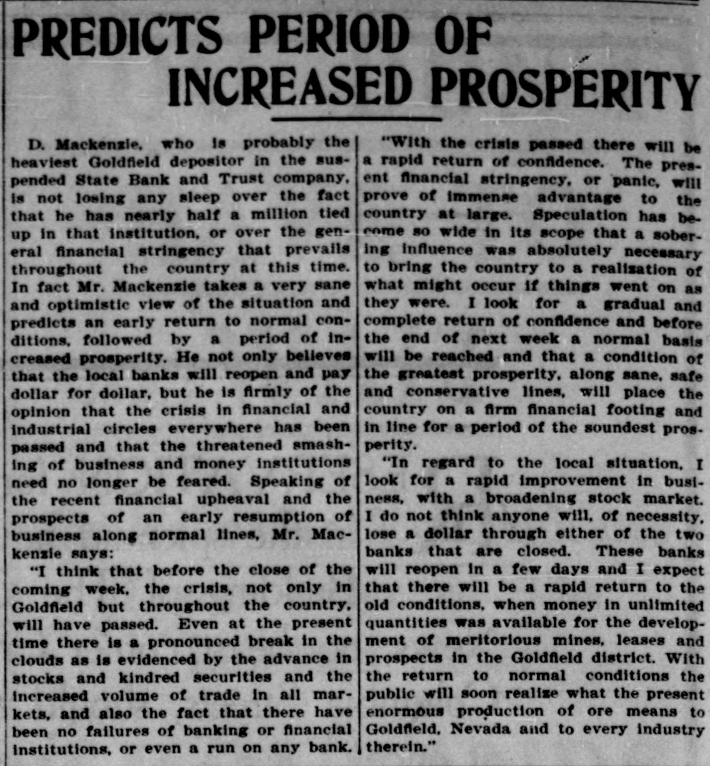 PREDICTS PERIOD OF INCREASED PROSPERITY D. Mackenzie, who is probably the "With the crisis passed there will be heaviest Goldfield depositor in the susa rapid return of confidence. The prespended State Bank and Trust company, ent financial stringency, or panic, will is not losing any sleep over the fact prove of immense advantage to the that he has nearly half a million tied country at large. Speculation has beup in that institution, or over the gencome so wide in its scope that a sobereral financial stringency that prevails ing influence was absolutely necessary throughout the country at this time. to bring the country to a realization of In fact Mr. Mackenzie takes a very sane what might occur if things went on as they were. I look for a gradual and and optimistic view of the situation and complete return of confidence and before predicts an early return to normal conthe end of next week a normal basis ditions, followed by a period of inwill be reached and that a condition of creased prosperity. He not only believes the greatest prosperity, along sane, safe that the local banks will reopen and pay and conservative lines, will place the dollar for dollar, but he is firmly of the country on a firm financial footing and opinion that the crisis in financial and industrial circles everywhere has been in line for a period of the soundest prosperity. passed and that the threatened smash"In regard to the local situation, I ing of business and money institutions look for a rapid improvement in busineed no longer be feared. Speaking of ness, with a broadening stock market. the recent financial upheaval and the I do not think anyone will, of necessity, prospects of an early resumption of lose a dollar through either of the two business along normal lines, Mr. Macbanks that are closed. These banks kenzie says: "I think that before the close of the will reopen in a few days and I expect that there will be a rapid return to the coming week, the crisis, not only in old conditions, when money in unlimited Goldfield but throughout the country, quantities was available for the developwill have passed. Even at the present ment of meritorious mines, leases and time there is a pronounced break in the prospects in the Goldfield district. With clouds as is evidenced by the advance in the return to normal conditions the stocks and kindred securities and the public will soon realize what the present increased volume of trade in all marenormous production of ore means to kets, and also the fact that there have been no failures of banking or financial Goldfield, Nevada and to every industry therein." institutions, or even a run on any bank.