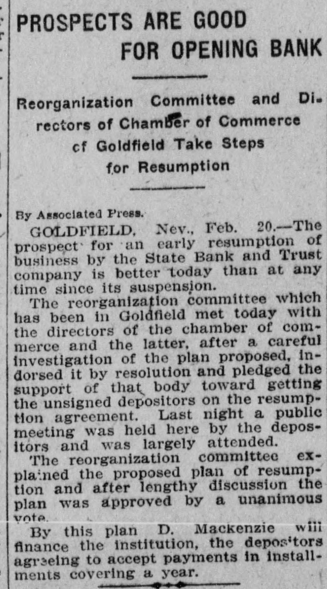 PROSPECTS ARE GOOD FOR OPENING BANK Reorganization Committee and Directors of Chamber of Commerce cf Goldfield Take Steps for Resumption By Associated Press. GOLDFIELD. Nev., Feb. 20.-The prospect for an early resumption of business by the State Bank and Trust company is better today than at any time since its suspension. The reorganization committee which has been in Goldfield met today with the directors of the chamber of commerce and the latter, after a careful investigation of the plan proposed, indorsed it by resolution and pledged the support of that body toward getting the unsigned depositors on the resumpNon agreement. Last night a public meeting was held here by the depositors and was largely attended. The reorganization committee explained the proposed plan of resumption and after lengthy discussion the plan was approved by a unanimous vote. By this plan D. Mackenzie will finance the institution, the depositors agreeing to accept payments in installments covering a year.