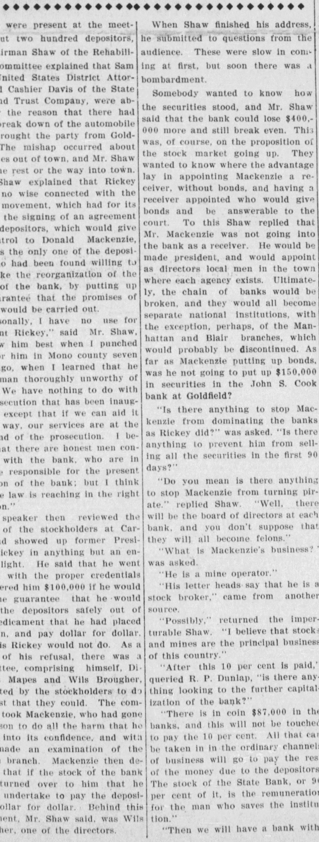 When Shaw finished his address, were present at the meethe submitted to questions from the ut two hundred depositors, audience. These were slow in conirman Shaw of the Rehabiliing at first, but soon there was a ommittee explained that Sam nited States District Attorbombardment. I Cashier Davis of the State Somebody wanted to know how d Trust Company, were abthe securities stood, and Mr. Shaw the reason that there had said that the bank could lose $400,reak down of the automobile 000 more and still break even. This rought the party from Goldwas, of course, on the proposition of The mishap occurred about the stock market going up. They es out of town, and Mr. Shaw wanted to know where the advantage e rest or the way into town. lay in appointing Mackenzie a reShaw explained that Rickey ceiver, without bonds, and having a no wise connected with the receiver appointed who would give movement. which had for its bonds and be answerable to the the signing of an agreement court. To this Shaw replied that depositors, which would give Mr. Mackenzie was not going into trol to Donald Mackenzie, the bank as a receiver. He would be S the only one of the deposimade president, and would appoint o had been found willing to as directors local men in the town ke the reorganization of the where each agency exists. Ultimate of the bank, by putting up ly, the chain of banks would be ranteé that the promises of broken. and they would all become would be carried out. separate national institutions, with sonally, I have no use for the exception, perhaps, of the Mannt Rickey," said Mr. Shaw, hattan and Blair branches, which W him best when I punched would probably be discontinued. As r him in Mono county seven far as Mackenzie putting up bonds, go, when I learned that he was he not going to put up $150,000 man thoroughly unworthy of in securities in the John S. Cook We have nothing to do with bank at Goldfield? secution that has been inaug"Is there anything to stop Macexcept that if we can aid it kenzie from dominating the banks way, our services are at the as Rickey did?" was asked. "Is there d of the prosecution. I beanything to prevent him from sellat there are honest men coning all the securities in the first 90 with the bank. who are in days?" responsible for the present "Do you mean is there anything on of the bank: but I think to stop Mackenzie from turning pire law is reaching in the right ate." replied Shaw "Well, there n." will be the board of directors at each speaker then reviewed the bank. and you don't suppose that of the stockholders at Carthey will all become felons." d showed up former Presi"What is Mackenzie's business? ickey in anything but an enwas asked. light. He said that he went He is a mine operator." with the proper credentials His letter heads say that he is a ered him $100,000 if he would stock broker," came from another e guarantee that he would source. the depositors safely out of Possibly," returned the imper edicament that he had placed turable Shaw. "I believe that stock n. and pay dollar for dollar. and mines are the principal business is Rickey would not do. As a of this country." of his refusal, there was a "After this 10 per cent is paid, ttee, comprising himself, Diqueried R. P. Dunlap, "is there any Mapes and Wils Brougher, thing looking to the further capital ted by the stockholders to do ization of the bank?' st that they could. The comThere is in coin $87,000 in the took Mackenzie, who had gone banks. and this will not be touched son to do all the harm that he into its confidence, and with to pay the 10 per cent. All that ca be taken in in the ordinary channel nade an examination of the branch Mackenzie then deof business will go to pay the res of the money due to the depositors that if the stock of the bank turned over to him that he The stock of the State Bank, or 9 undertake to pay the deposiper cent of it, is the remuneration ollar for dollar. Behind this for the man who saves the institu tion." ient, Mr. Shaw said. was Wils "Then we will have a bank with her, one of the directors.