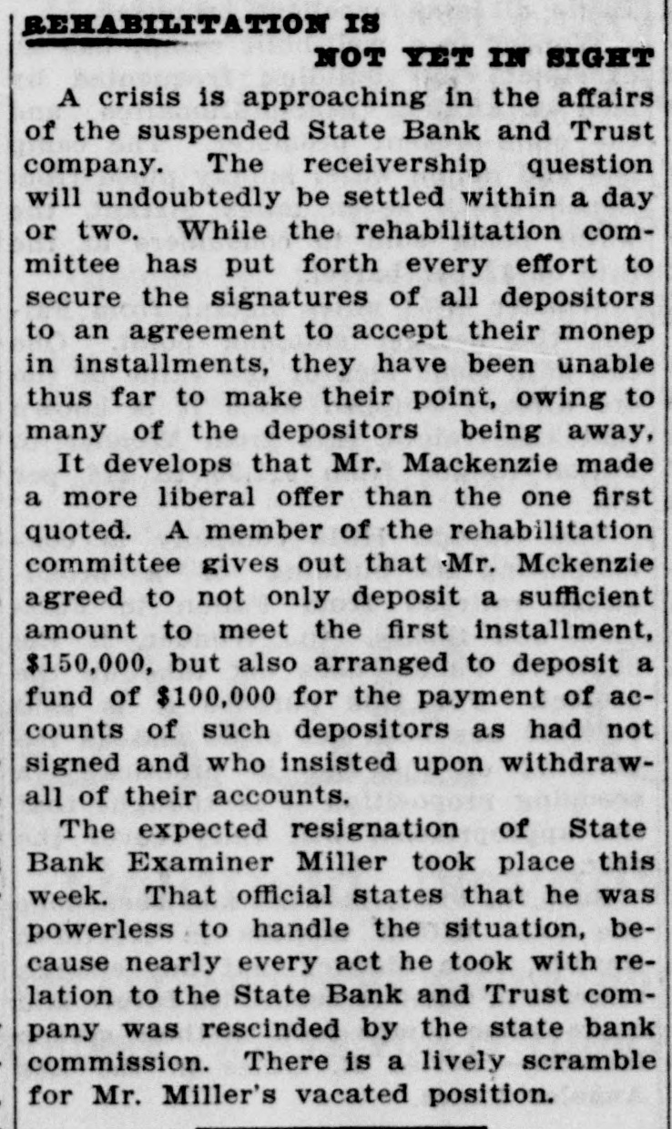 REHABILITATION IS NOT YET IN SIGHT A crisis is approaching in the affairs of the suspended State Bank and Trust company. The receivership question will undoubtedly be settled within a day or two. While the rehabilitation committee has put forth every effort to secure the signatures of all depositors to an agreement to accept their monep in installments, they have been unable thus far to make their point, owing to many of the depositors being away, It develops that Mr. Mackenzie made a more liberal offer than the one first quoted. A member of the rehabilitation committee gives out that Mr. Mckenzie agreed to not only deposit a sufficient amount to meet the first installment, $150,000, but also arranged to deposit a fund of $100,000 for the payment of accounts of such depositors as had not signed and who insisted upon withdrawall of their accounts. The expected resignation of State Bank Examiner Miller took place this week. That official states that he was powerless to handle the situation, because nearly every act he took with relation to the State Bank and Trust company was rescinded by the state bank commission. There is a lively scramble for Mr. Miller's vacated position.