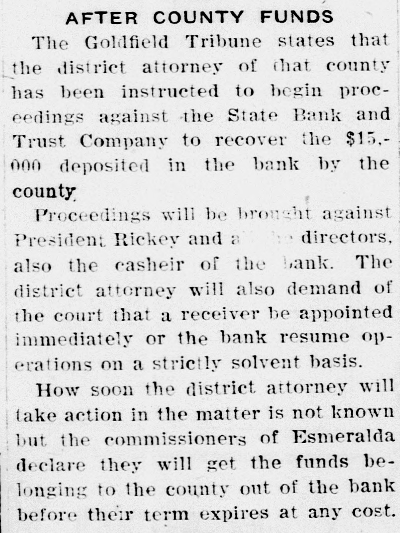 AFTER COUNTY FUNDS The Goldfield Tribune states that the district attorney of that county has been instructed to begin procfeedings against the State Bank and Trust Company to recover the $15.000 deposited in the bank by the county Proceedings will be brought against directors, President Rickey and a also the casheir of the bank. The district attorney will also demand of the court that a receiver be appointed immediately or the bank resume operations on a strictly solvent basis. How soon the district attorney will take action in the matter is not known but the commissioners of Esmeralda declare they will get the funds belonging to the county out of the bank before their term expires at any cost.