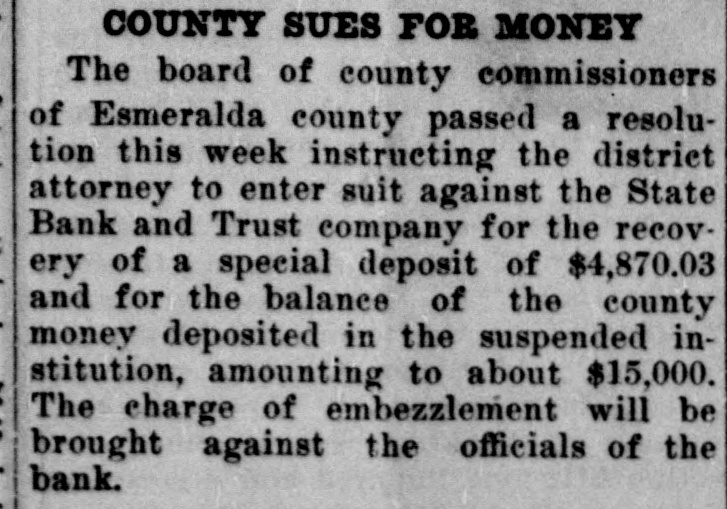COUNTY SUES FOR MONEY The board of county commissioners of Esmeralda county passed a resolution this week instructing the district attorney to enter suit against the State Bank and Trust company for the recovery of a special deposit of $4,870.03 and for the balance of the county money deposited in the suspended institution, amounting to about $15,000. The charge of embezzlement will be brought against the officials of the bank.