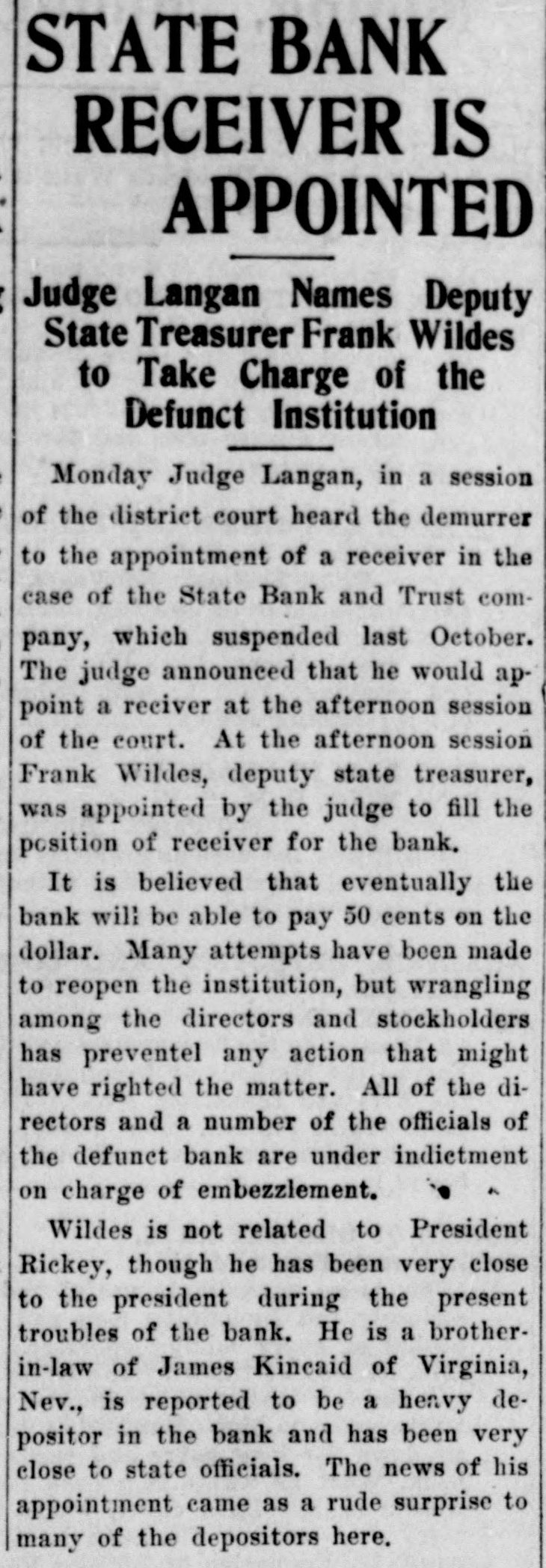 STATE BANK RECEIVER IS APPOINTED Judge Langan Names Deputy State Treasurer Frank Wildes to Take Charge of the Defunct Institution Monday Judge Langan, in a session of the district court heard the demurrer to the appointment of a receiver in the case of the State Bank and Trust company, which suspended last October. The judge announced that he would appoint a reciver at the afternoon session of the court. At the afternoon session Frank Wildes, deputy state treasurer, was appointed by the judge to fill the position of receiver for the bank. It is believed that eventually the bank will be able to pay 50 cents on the dollar. Many attempts have been made to reopen the institution, but wrangling among the directors and stockholders has preventel any action that might have righted the matter. All of the directors and a number of the officials of the defunct bank are under indictment on charge of embezzlement. Wildes is not related to President Rickey, though he has been very close to the president during the present troubles of the bank. He is a brotherin-law of James Kincaid of Virginia, Nev., is reported to be a heavy depositor in the bank and has been very close to state officials. The news of his appointment came as a rude surprise to many of the depositors here.