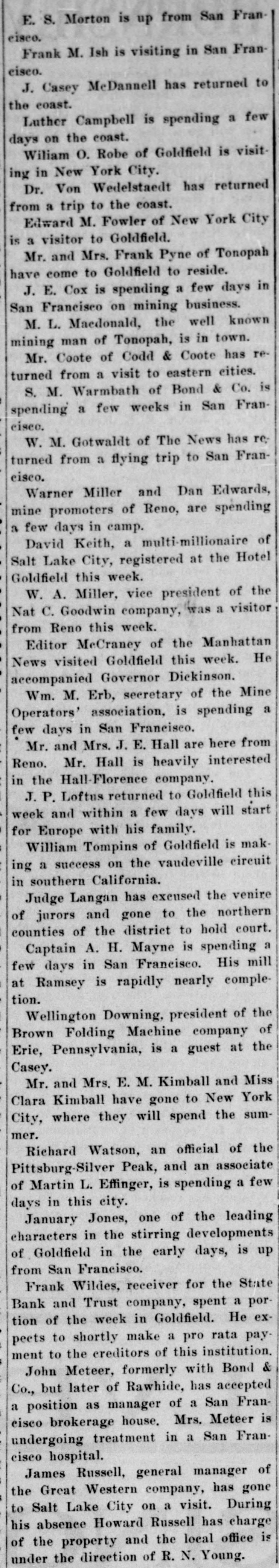 IS Morton S. up E. cisco. Frank M. Ish is visiting in San Francisco. J. Casey McDannell has returned to the coast. Luther Campbell is spending a few days on the coast. Wiliam O. Robe of Goldfield is visiting in New York City. Dr. Von Wedelstaedt has returned from a trip to the coast. Edward M. Fowler of New York City is a visitor to Goldfield. Mr. and Mrs. Frank Pyne of Tonopah have come to Goldfield to reside. J. E. Cox is spending a few days in San Francisco on mining business. M. L. Maedonald, the well known mining man of Tonopah, is in town. Mr. Coote of Codd & Coote has returned from a visit to eastern cities. S. M. Warmbath of Bond & Co. is spending a few weeks in San Francisco. W. M. Gotwaldt of The News has re: turned from a flying trip to San Francisco. Warner Miller and Dan Edwards, mine promoters of Reno, are spending a few days in camp. David Keith, a multi-millionaire of Salt Lake City, registered at the Hotel Goldfield this week. W. A. Miller, vice president of the Nat C. Goodwin company, was a visitor from Reno this week. Editor McCraney of the Manhattan News visited Goldfield this week. He accompanied Governor Dickinson. Wm. M. Erb, secretary of the Mine Operators' association, is spending a few days in San Francisco. Mr. and Mrs. J. E. Hall are here from Reno. Mr. Hall is heavily interested in the Hall-Florence company. J. P. Loftus returned to Goldfield this week and within a few days will start for Europe with his family. William Tompins of Goldfield is making a success on the vaudeville circuit in southern California. Judge Langan has exeused the venire of jurors and gone to the northern counties of the district to hold court. Captain A. H. Mayne is spending a few days in San Francisco. His mill at Ramsey is rapidly nearly completion. Wellington Downing, president of the Brown Folding Machine company of Erie, Pennsylvania, is a guest at the Casey. Mr. and Mrs. E. M. Kimball and Miss Clara Kimball have gone to New York City, where they will spend the summer. Richard Watson, an official of the Pittsburg-Silver Peak, and an associate of Martin L. Effinger, is spending a few days in this city. January Jones, one of the leading characters in the stirring developments of Goldfield in the early days, is up from San Francisco. Frank Wildes, receiver for the State Bank and Trust company, spent a portion of the week in Goldfield. He expeets to shortly make a pro rata payment to the creditors of this institution. John Meteer, formerly with Bond &