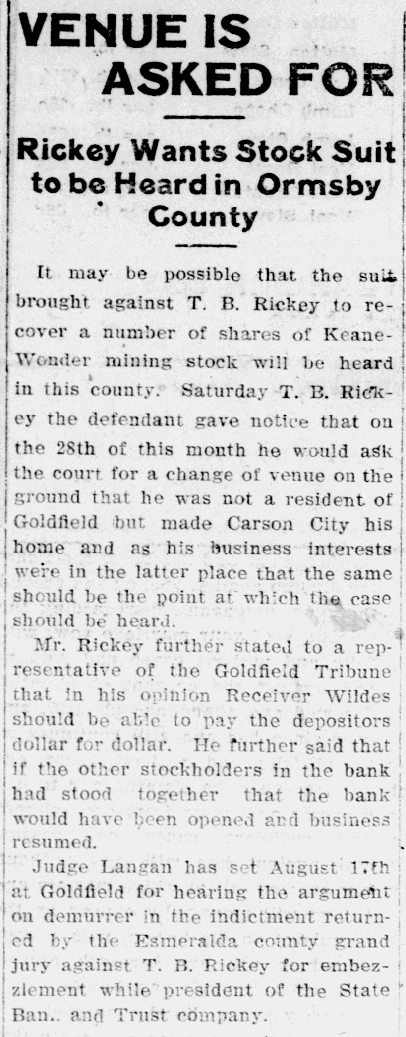 VENUE IS ASKED FOR Rickey Wants Stock Suit to be Heard in Ormsby lang County It may be possible that the suit brought against T. B. Rickey to recover a number of shares of KeaneWonder mining stock will be heard in this county. Saturday T. B. Rickey the defendant gave notice that on the 28th of this month he would ask the court for a change of venue on the ground that he was not a resident of Goldfield but made Carson City his home and as his business interests were in the latter place that the same should be the point at which the case should be heard. Mr. Rickey further stated to a representative of the Goldfield Tribune that in his opinion Receiver Wildes should be able to pay the depositors dollar for dollar. He further said that if the other stockholders in the bank had stood together that the bank would have been opened and business resumed. Judge Langan has set August 17th at Goldfield for hearing the argument on demurrer in the indictment returned by the Esmeralda county grand jury against T. B. Rickey for embezzlement while president of the State Ban. and Trust company.