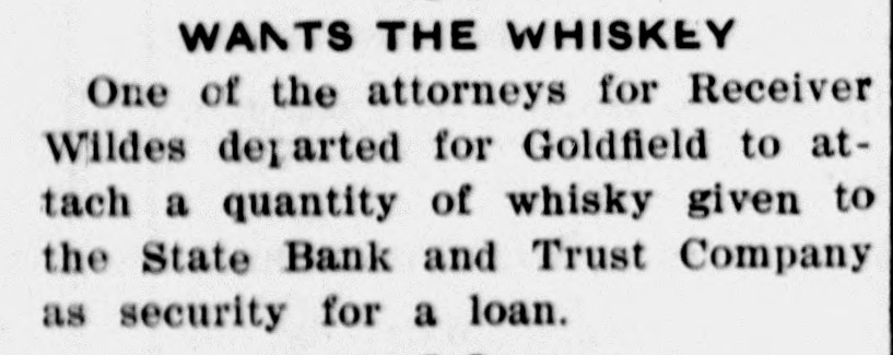 WANTS THE WHISKEY One of the attorneys for Receiver Wildes departed for Goldfield to attach a quantity of whisky given to the State Bank and Trust Company as security for a loan.