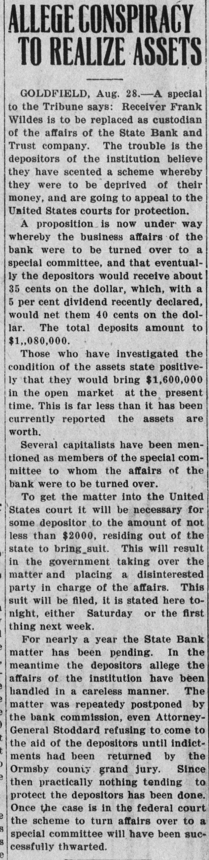 ALLEGE CONSPIRACY TO REALIZE ASSETS GOLDFIELD, Aug. 28.-A special to the Tribune says: Receiver Frank Wildes is to be replaced as custodian of the affairs of the State Bank and Trust company. The trouble is the depositors of the institution believe they have scented a scheme whereby they were to be deprived of their money, and are going to appeal to the United States courts for protection. A proposition is now under way whereby the business affairs of the bank were to be turned over to a special committee, and that eventually the depositors would receive about 35 cents on the dollar, which, with a 5 per cent dividend recently declared, would net them 40 cents on the dollar. The total deposits amount to $1,,080,000. Those who have investigated the condition of the assets state positively that they would bring $1,600,000 in the open market at the present time. This is far less than it has been currently reported the assets are worth. Several capitalists have been mentioned as members of the special committee to whom the affairs of the bank were to be turned over. To get the matter into the United States court it will be necessary for some depositor to the amount of not less than $2000, residing out of the state to bring_suit. This will result in the government taking over the matter and placing a disinterested party in charge of the affairs. This suit will be filed, it is stated here tonight, either Saturday or the first thing next week. For nearly a year the State Bank matter has been pending. In the meantime the depositors allege the affairs of the institution have been handled in a careless manner. The matter was repeatedy postponed by the bank commission, even AttorneyGeneral Stoddard refusing to come to the aid of the depositors until indictments had been returned by the Ormsby county grand jury. Since then practically nothing tending to protect the depositors has been done. Once the case is in the federal court the scheme to turn affairs over to a special committee will have been successfully thwarted.