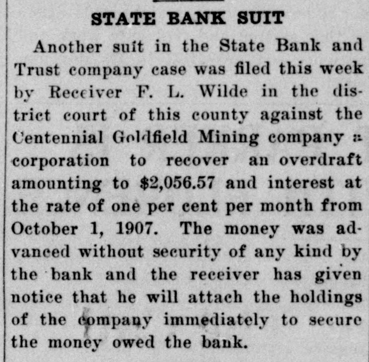 STATE BANK SUIT Another suit in the State Bank and Trust company case was filed this week by Receiver F. L. Wilde in the district court of this county against the Centennial Goldfield Mining company = corporation to recover an overdraft amounting to $2,056.57 and interest at the rate of one per cent per month from October 1, 1907. The money was advanced without security of any kind by the bank and the receiver has given notice that he will attach the holdings of the company immediately to secure the money owed the bank.