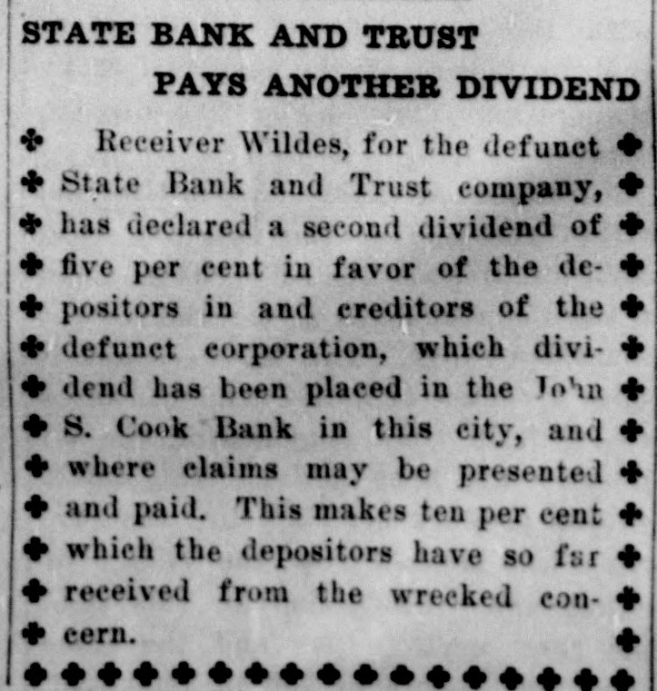 STATE BANK AND TRUST PAYS ANOTHER DIVIDEND Receiver Wildes, for the defunct State Bank and Trust company, has declared a second dividend of five per cent in favor of the depositors in and creditors of the defunct corporation, which dividend has been placed in the John S. Cook Bank in this city, and where claims may be presented and paid. This makes ten per cent which the depositors have so far received from the wrecked concern.