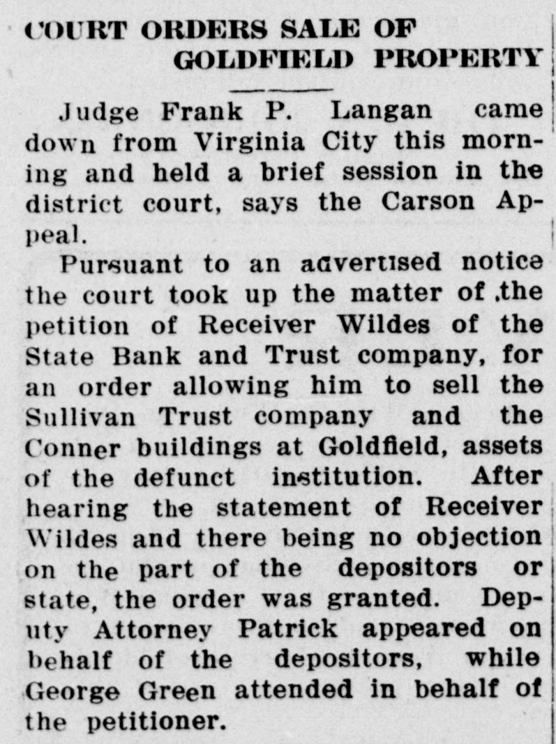 ORDER TO SELL GOLDFIELD BANK BUILDINGS Judge Frank P. Langan came down from Virginia City this morning and held a brief session in the district court. In the case of Hahn against Hahn, a divorce proceeding, the petititioner was granted a decree as prayed for on the grounds of desertion. Pursuant to the advertised notice the, court took up the matter of the petition of Receiver Wildes of the State aBnk and Trust Company, for an order allowing him to sell the Sullivan Trust Company's and the Connor's buildings at Goldfield, assests of the defunct institution. After hearing the statement of Receiver Wildes and there being no objection on the part of the depositers or state, the order was granted. Deputy Attorney Gemeral Patrick appeared on behalf of the depositors, while George Green attended in behalf of the petitioner. -Appeal.