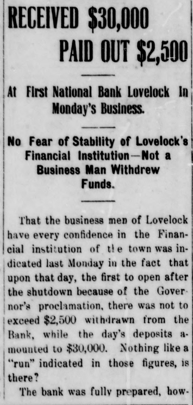 RECEIVED $30,000 PAID OUT $2,500 At First National Bank Lovelock In Monday's Business. No Fear of Stability of Lovelock's Financial Institution-Not a Business Man Withdrew Funds. That the business men of Lovelock have every confidence in the Financial institution of the town was indicated last Monday in the fact that upon that day, the first to open after the shutdown because of the Governor's proclamation, there was not to exceed $2,500 withdrawn from the Bank, while the day's deposits a. mounted to $30,000. Nothing like a "run" indicated in those figures, is there? The bank was fully prepared, how-
