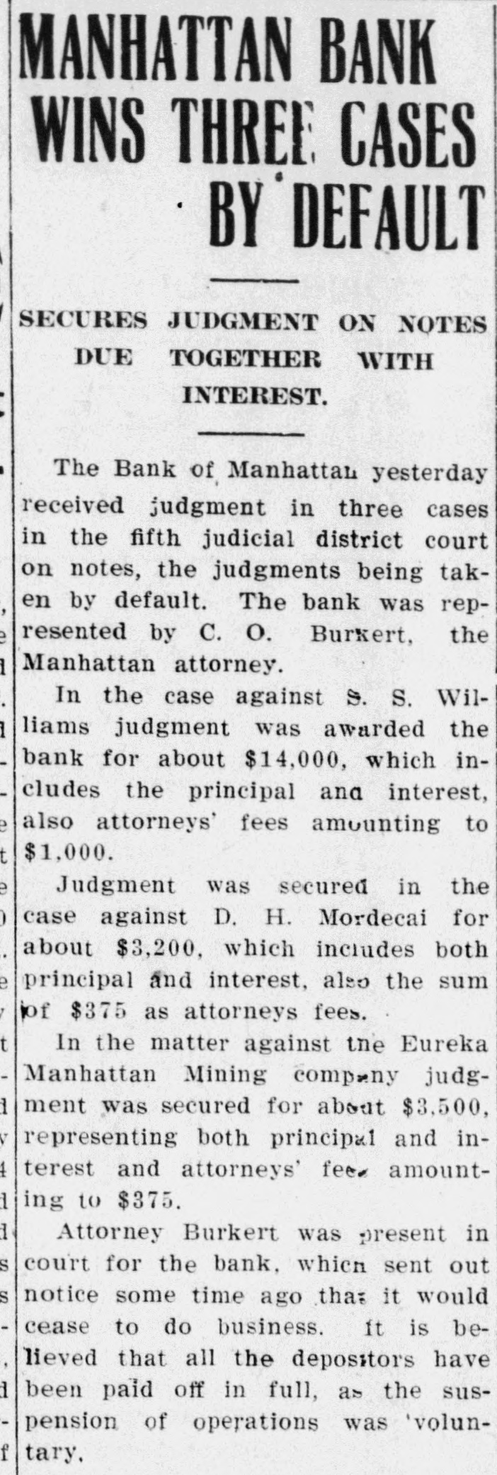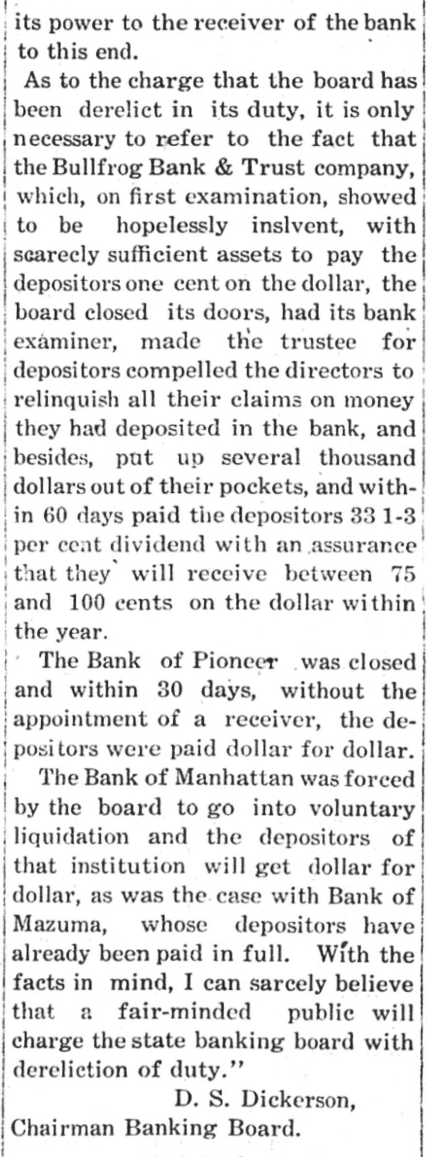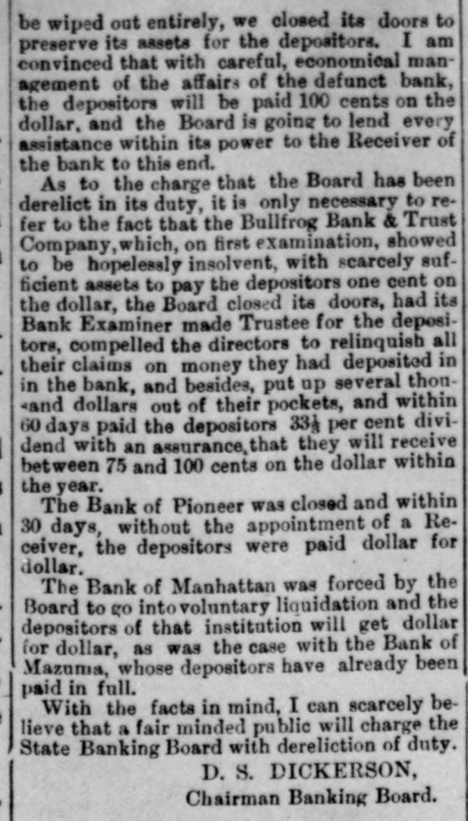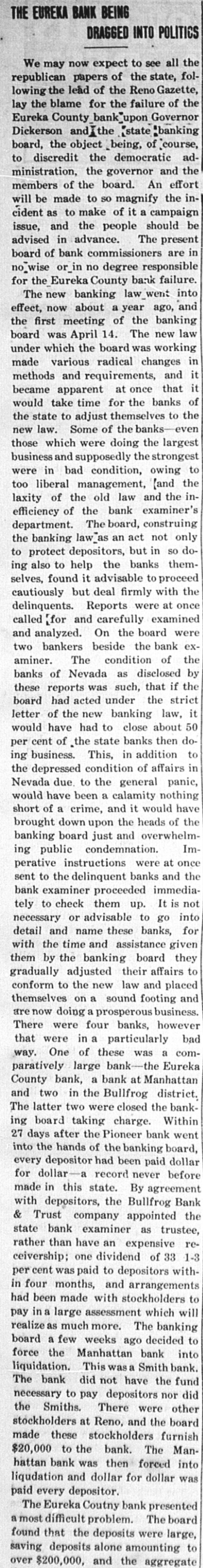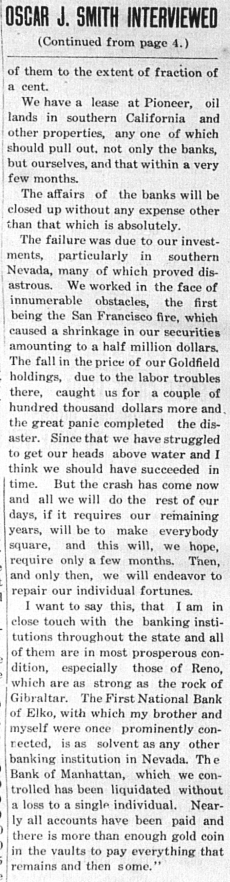 # OSCAR J. SMITH INTERVIEWED (Continued from page 4.) of them to the extent of fraction of a cent. We have a lease at Pioneer, oil lands in southern California and other properties, any one of which should pull out, not only the banks, but ourselves, and that within a very few months. The affairs of the banks will be closed up without any expense other than that which is absolutely. The failure was due to our investments, particularly in southern Nevada, many of which proved disastrous. We worked in the face of innumerable obstacles, the first being the San Francisco fire, which caused a shrinkage in our securities amounting to a half million dollars. The fall in the price of our Goldfield holdings, due to the labor troubles there, caught us for a couple of hundred thousand dollars more and, the great panic completed the disaster. Since that we have struggled to get our heads above water and I think we should have succeeded in time. But the crash has come now and all we will do the rest of our days, if it requires our remaining years, will be to make everybody square, and this will, we hope, require only a few months. Then, and only then, we will endeavor to repair our individual fortunes. I want to say this, that I am in close touch with the banking institutions throughout the state and all of them are in most prosperous condition, especially those of Reno, which are as strong as the rock of Gibraltar. The First National Bank of Elko, with which my brother and myself were once prominently connected, is as solvent as any other banking institution in Nevada. The Bank of Manhattan, which we controlled has been liquidated without a loss to a single individual. Nearly all accounts have been paid and there is more than enough gold coin in the vaults to pay everything that remains and then some."