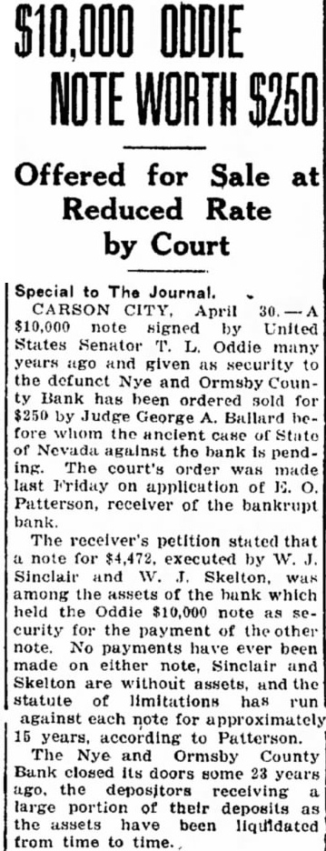 Offered for Sale Reduced Rate by Court Special to The Journal. CARSON April $10,000 note signed United States Senator Oddie many ago and given the defunct Nye and Ormsby CounBank has been ordered sold for $250 by Judge George Ballard fore whom ancient CHHC State Nevada against the bank ing. The court's order was made last Friday on application of E. Patterson, receiver of the bankrupt bank. The receiver's petition that for executed by Sinclair and among the assets of the bank which held the Oddie $10,000 note curity the payment of note. payments have ever been made on either note, Sinclair and Skelton are without and the statute of limitations has against each note for approximately years. according to Patterson. The Nye and Ormsby County Bank closed its doors some years ago. the depositors receiving large portion of their deposits the assets have been liquidated from time to time.