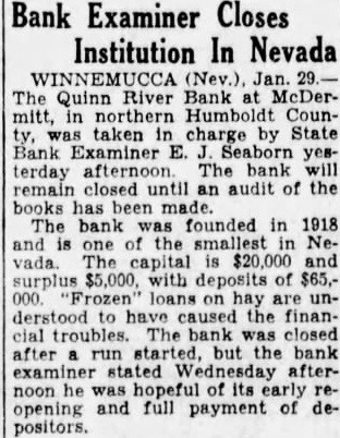 Bank Examiner Closes Institution In Nevada WINNEMUCCA (Nev.). Jan. The Quinn River Bank at McDermitt, northern Humboldt Countaken in charge by State Bank Examiner E. Seaborn terday afternoon. The bank remain closed until an audit of the books has been made. The bank was founded in 1918 and is one of the smallest in Nevada. capital $20,000 and surplus $5,000. with deposits of $65,000 loans on hay are understood to caused the financial troubles. The bank was closed after run started, but the bank examiner stated Wednesday afternoon he was hopeful of its early reopening and full payment of depositors.