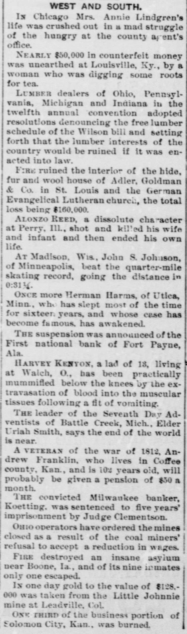 -In a quarrel at Painesville, Ind., Robert Lawson crushed the skull of Effie Arbuckle with a scale weight. Arbuckle will die and Lawson escaped.