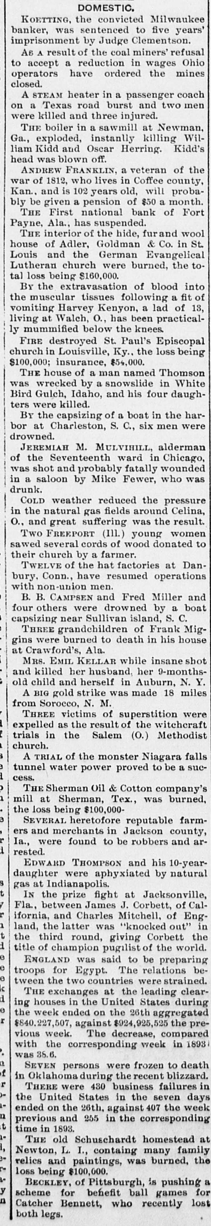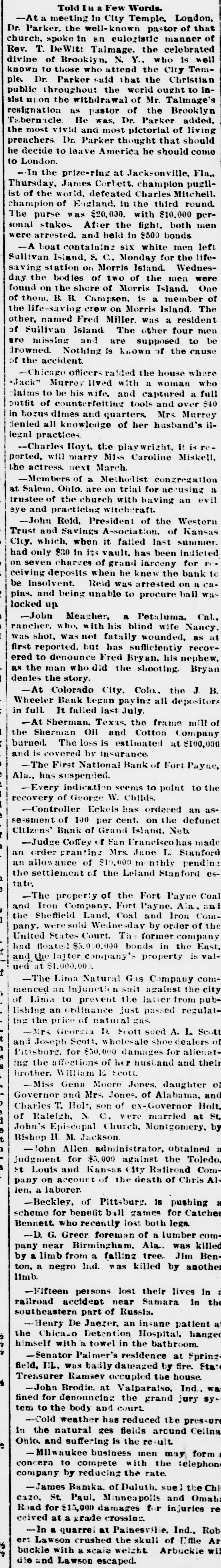 --In the prize-ring at Jacksonville, Fla., Thursday, James Corbett, champion pugilist of the world, defeated Charles Mitchell, champion of England, in the third round. The purse was $20,000, with $10,000 personal stakes. After the fight, both men were arrested, and held in $500 bonds.