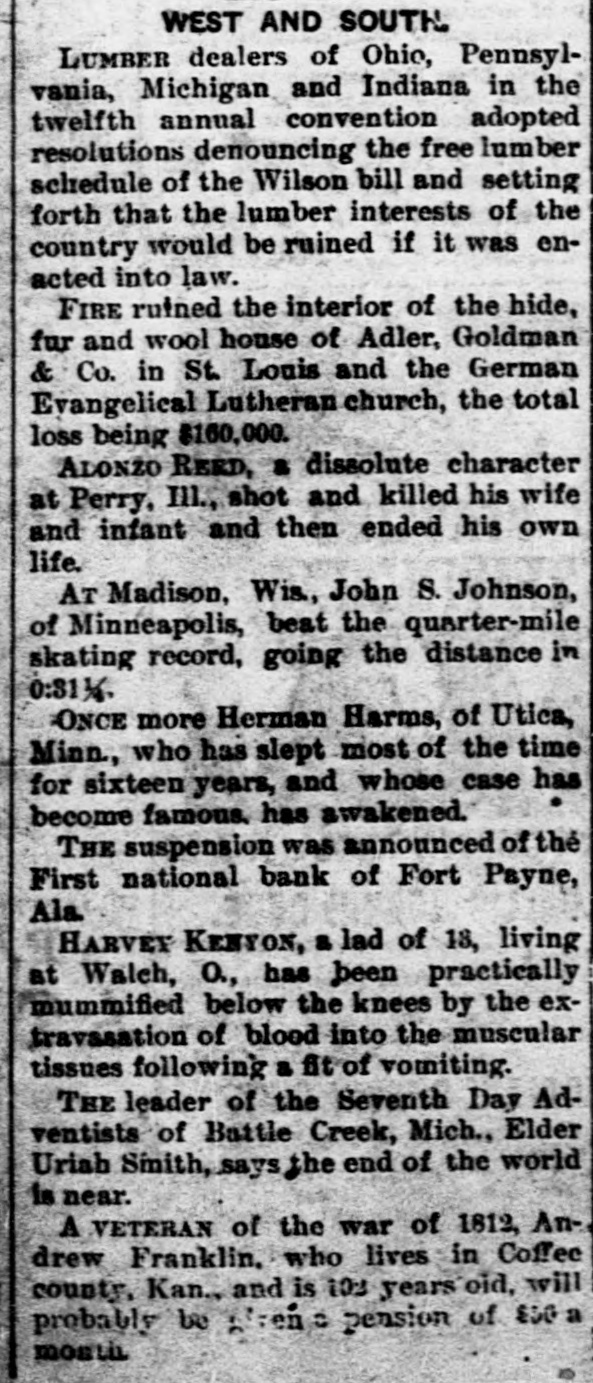 -Henry De Jaezer, an insane patient at the Chicago Detention Hospital, hanged himself with a towel in the bathroom.