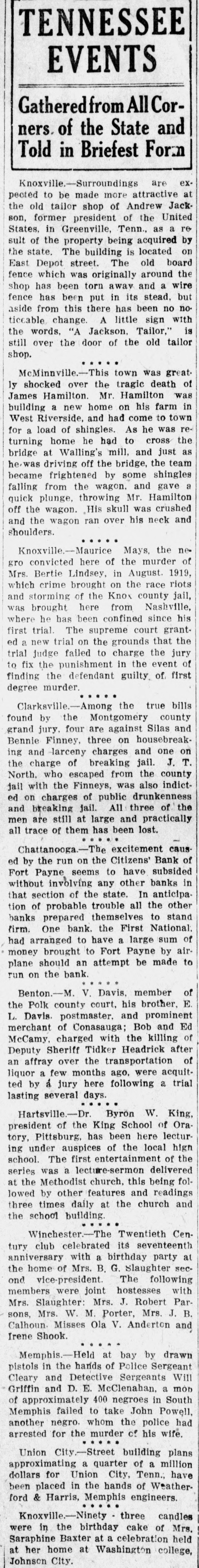 -D. G. Greer, foreman of a lumber company near Birmingham, Ala., was killed by a limb from a falling tree. Jim Benton, a negro lad, was killed by another limb.
