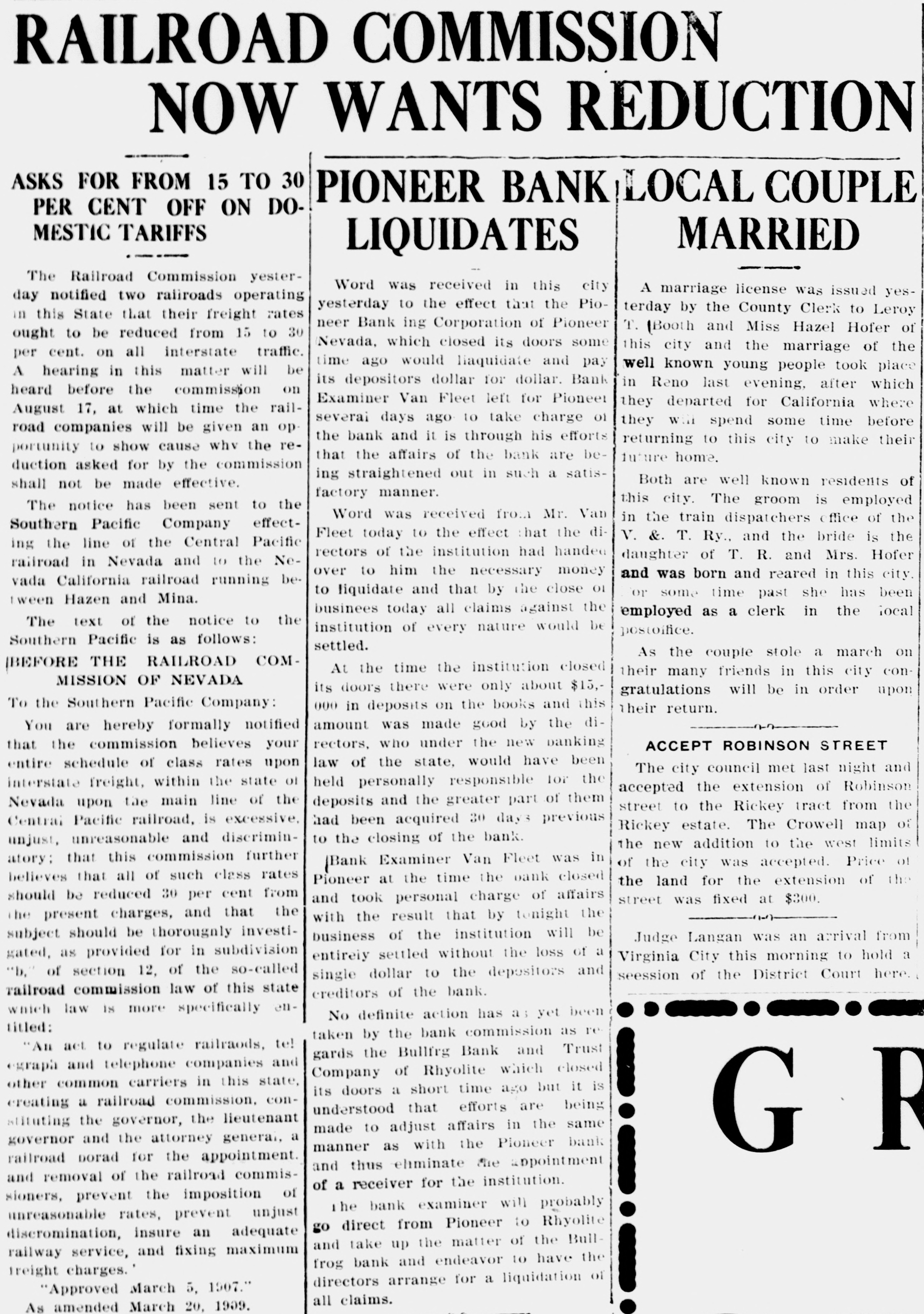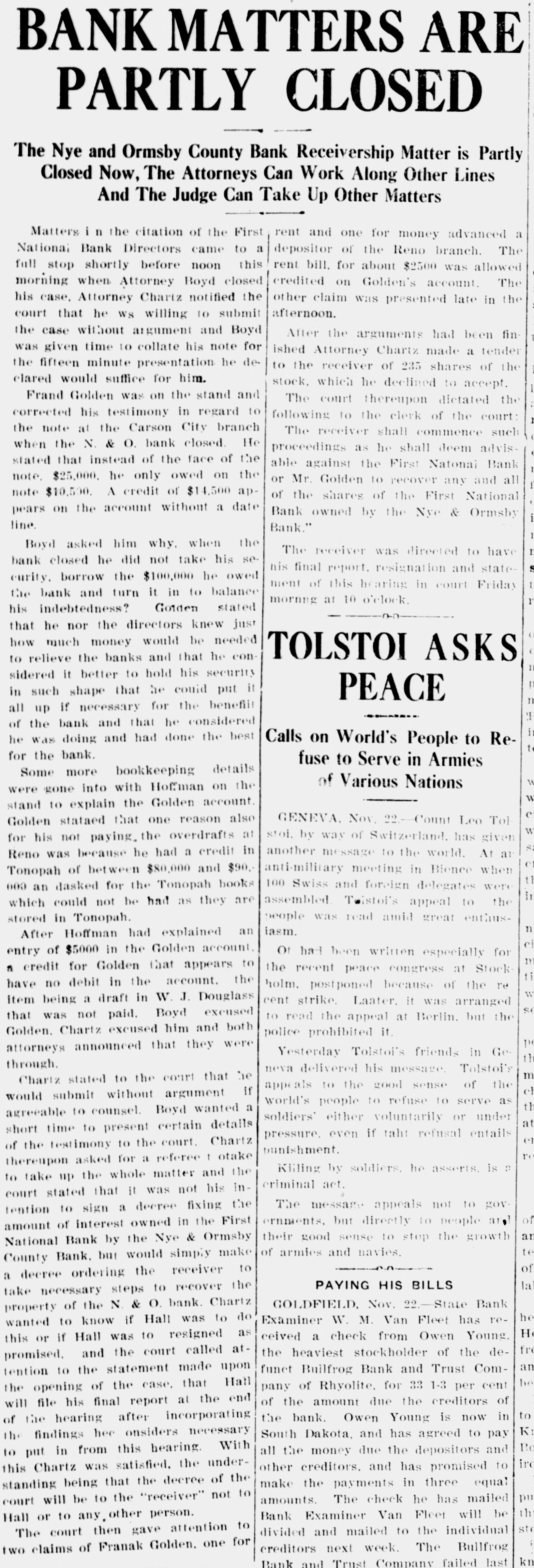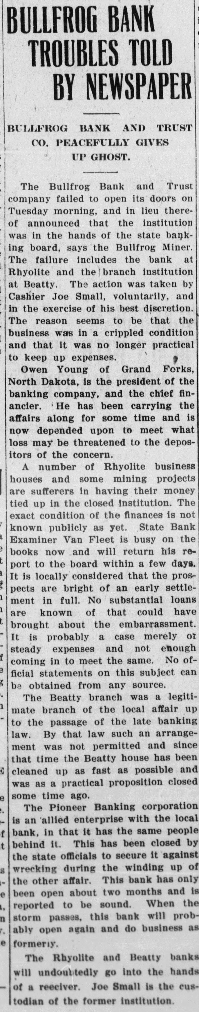 Bullfrog Bank and Trust Co. May Pay Depositors In Full Through the intervention of the State Banking Board, it is altogether likely that the depositors of the Bullfrog Bank and Trust company, recently suspended, will receive dollar for dollar in the wind-up of the bank, and "that the time of the final liquidation will not be long delayed. When the Bullfrog Bank and Trust company was closed by the State Bank Examiner, in July, the affairs of the institution looked hopeless and depositors seemingly, had but little show of getting 10 cents on the dollar of their deposits. Owen Young of South Dakota was the principal stockholder and was the largest depositor; in fact he was practically the owner of the bank. He had a short time previously attempted to get "out from under" the bank by a transfer of his stock interests to J. A. Small and F. L. Warburton, cashier and assistant cashier, respectively, so that he only appeared on the books as a depositor. But when the Banking Board got hold of the bank, it brought about an agreement with Young, Small and Warberton, whereby every asset of the bank was to be turned over to a trustee to be named by the Banking Board, and that as depositors, their claims should be subsequent to the claims of all other depositors. Young's deposit was something like $75,000, but there was practically no money on hand. Young also signed an agreement that after the bank had liquidated should there still be insufficient to pay the creditors of the bank, exclusive of his deposit, he would contribute a further amount, equal to 20 per cent of the claims of the creditors; in other words, Young was to sacrifice his entire deposit and submit to a further assessment of 20 per cent of the claims of creditors, in settlement of his liabilities to creditors of the bank should conditions so require. The Banking Board appointed M. M. Van Fleet, State Bank Examiner, as trustee, to act without pay, receiving only his actual travéling and living expenses while actually engaged in the administration of the trust. Mr. Van Fleet appointed Hon. Clay Tallman as his attorney. A notice, embodying the forgoing, was sent out to all depositors of the bank, together with an agreement for the signature of the depositors, whereby they were to consent to such an arrangement and also agreeing to accept dividends upon their deposits at stated intervals. Under the arrangement made it was stated that a 33 1-3 per cent dividend could be paid at once, and that within a comparatively short time, ever cent due creditors, might be expected. Within the past few days the Banking Board received word from Attorney Tallman, that every depositor of the bank, save one, had signed the agreement; that while the one in question was the largest depositor outside of Owen Young and was in Mexico, he had sent word signifying his acceptance of the terms, SO that there now remains nothing in the way to a speedy liquidation of the bank's affairs. Trustee Van Fleet will proceed to Rhyolite this week, perhaps, and begin his work, and it is altogether likely that before the first of the year, or within six months after its suspension, the Bullfrog Bank and Trust company will have paid every depositor, except Young, a director, every cent owing him. This is the second bank to come into the hands of the State Banking Board in the brief period of its existence. The first one was the Bank of Pioneer, which was closed by the board, but whose depositors were paid in full within 60 days of the bank's suspension. The depositors of the second bank, the Bullfrog Bank and Trust company, will fare equally well, and in marked contrast with those of any other bank that ever suspended business, within the confines of Nevada. The State Banking Board met in Carson City this past week to complete its arrangements for the Bullfrog Bank and Trust company and to consider other matters of importance that came to its attention. The board also appeared in the supreme court as defendant in a mandamus suit brought by a citizen of Reno, who had, as an individual, applied for a charter from the board to do a banking business. As the banking law specifically states that only corporations can do a banking business in Nevada, the individual in question was denied a charter for a private or unincorporated bank. He thereupon brought suit to mandamus the board to issue a charter, on the ground that the provision was unconstitutional, being in restraint of the rights of an individual to engage in business. Although a demurrer was entered, the case will likely be tried upon its merits. While the constitutionality of this particular section of the law is in question, the balance of the law, happily, is unassailed. The State Banking Board of Nevada is composed of Governor D. S. Dickerson, chairman. Former Governor Adams, Samuel W. Belford, A. B. Witcher and Charles S. Sprague; bank examiner and secretary of the board, M. M. Van Fleet.