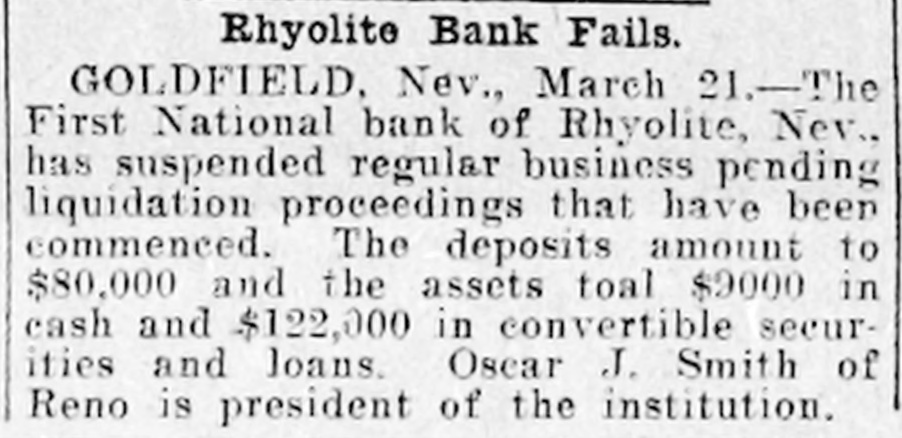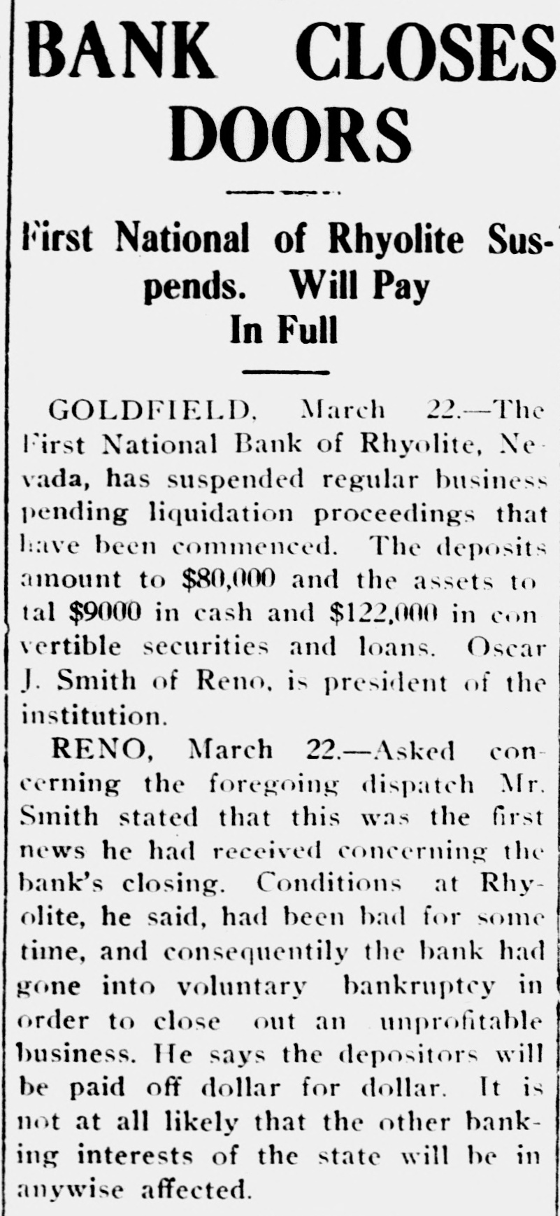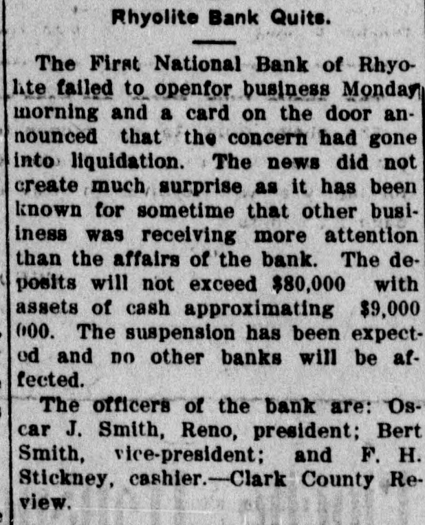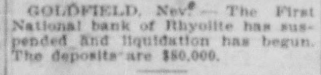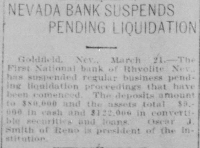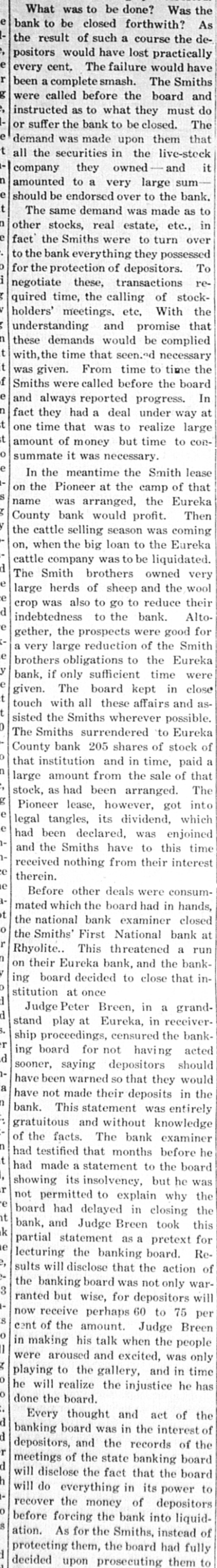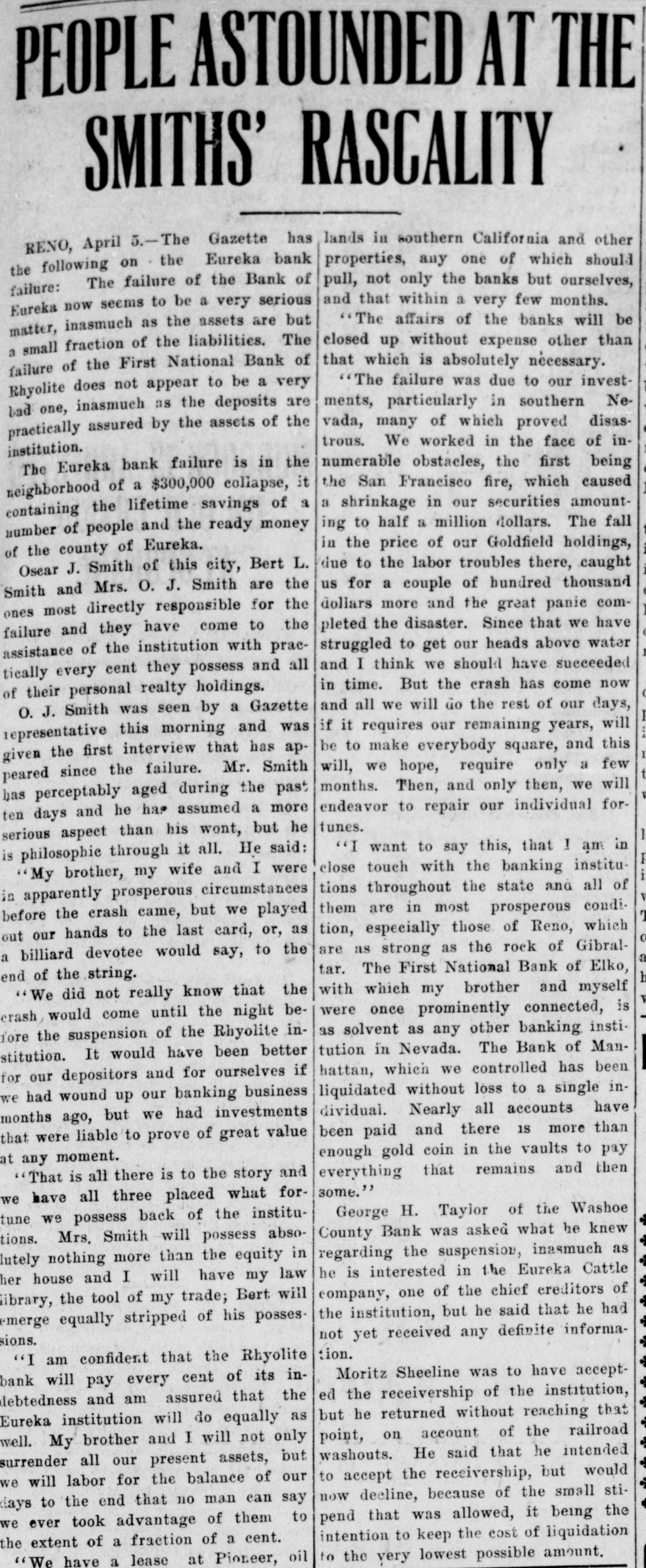 PEOPLE ASTOUNDED AT THE SMITHS' RASCALITY lands in southern California and other RENO, April 5.-The Gazette has properties, any one of which should the following on the Eureka bank pull, not only the banks but ourselves, failure: The failure of the Bank of and that within a very few months. Eureka now seems to be a very serious "The affairs of the banks will be matter, inasmuch as the assets are but closed up without expense other than a small fraction of the liabilities. The that which is absolutely necessary. failure of the First National Bank of The failure was due to our investRhyolite does not appear to be a very ments, particularly in southern Nebad one, inasmuch as the deposits are vada, many of which proved disaspractically assured by the assets of the trous. We worked in the face of ininstitution. numerable obstacles, the first being The Eureka bank failure is in the the San Francisco fire, which caused neighborhood of a $300,000 collapse, it a shrinkage in our securities amountcontaining the lifetime savings of a ing to half a million dollars. The fall number of people and the ready money in the price of our Goldfield holdings, of the county of Eureka. due to the labor troubles there, caught Osear J. Smith of this city, Bert L. us for a couple of bundred thousand Smith and Mrs. O. J. Smith are the dollars more and the great panic comones most directly responsible for the pleted the disaster. Since that we have failure and they have come to the struggled to get our heads above water assistance of the institution with pracand I think we should have succeeded tically every cent they possess and all in time. But the crash has come now of their personal realty holdings. and all we will do the rest of our days, O. J. Smith was seen by a Gazette if it requires our remaining years, will iepresentative this morning and was be to make everybody square, and this given the first interview that has apwill, we hope, require only a few t peared since the failure. Mr. Smith months. Then, and only then, we will has perceptably aged during the past endeavor to repair our individual forten days and he has assumed a more tunes. serious aspect than his wont, but he "I want to say this, that ! am in is philosophie through it all. He said: close touch with the banking institu"My brother, my wife and I were tions throughout the state and all of V in apparently prosperous circumstances them are in most prosperous condibefore the crash came, but we played L. tion, especially those of Reno, which out our hands to the last card, or, as o are as strong as the rock of Gibrala billiard devotee would say, to the tar. The First National Bank of Elko, end of the string. h with which my brother and myself We did not really know that the were once prominently connected, is crash, would come until the night beas solvent as any other banking instifore the suspension of the Rhyolite intution in Nevada. The Bank of Manstitution. It would have been better hattan, which we controlled has been for our depositors and for ourselves if liquidated without loss to a single inwe had wound up our banking business dividual. Nearly all accounts have months ago, but we had investments been paid and there 1S more than that were liable to prove of great value enough gold coin in the vaults to pay at any moment. everything that remains and then "That is all there is to the story and some." we have all three placed what forGeorge H. Taylor of the Washoe tune we possess back of the instituCounty Bank was asked what he knew tions. Mrs. Smith will possess absoregarding the suspension, inasmuch as lutely nothing more than the equity in he is interested in the Eureka Cattle her house and I will have my law company, one of the chief creditors of library, the tool of my trade; Bert will the institution, but he said that he had emerge equally stripped of his posses. not yet received any definite informasions. tion. "I am confident that the Rhyolite Moritz Sheeline was to have acceptbank will pay every cent of its ined the receivership of the institution, debtedness and am assured that the but he returned without reaching that Eureka institution will do equally as point, on account of the railroad well. My brother and I will not only washouts. He said that he intended surrender all our present assets, but to accept the receivership, but would we will labor for the balance of our now decline, because of the small stidays to the end that no man can say pend that was allowed, it being the we ever took advantage of them to intention to keep the cost of liquidation the extent of a fraction of a cent. to the very lowest possible amount. "We have a lease at Pioneer, oil