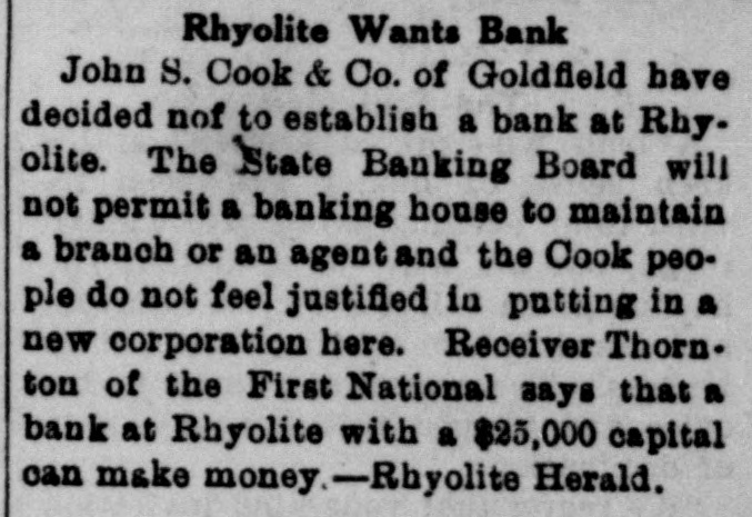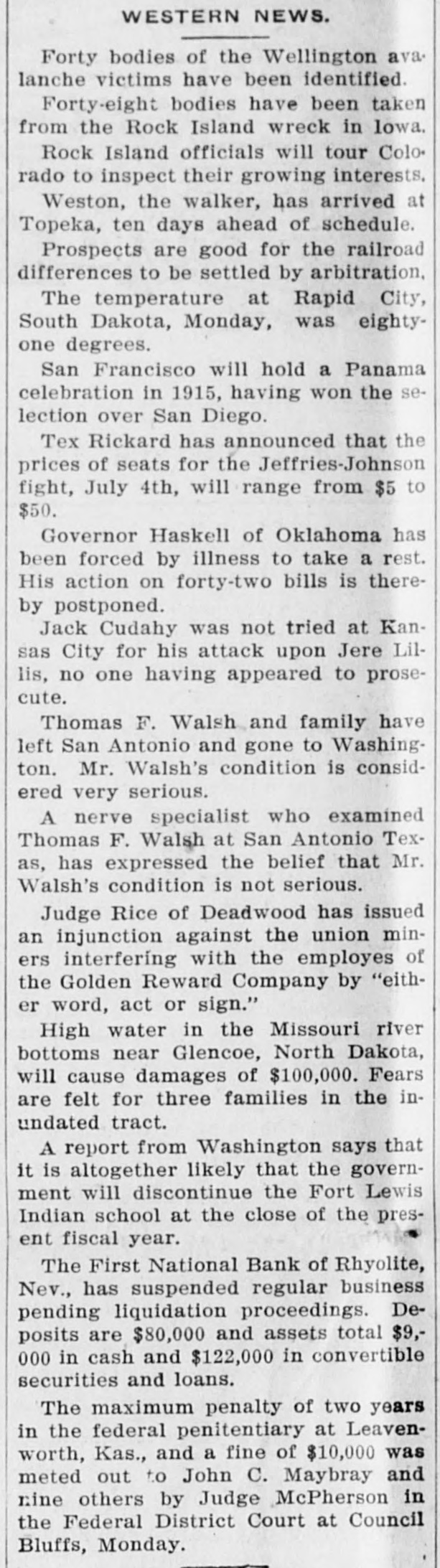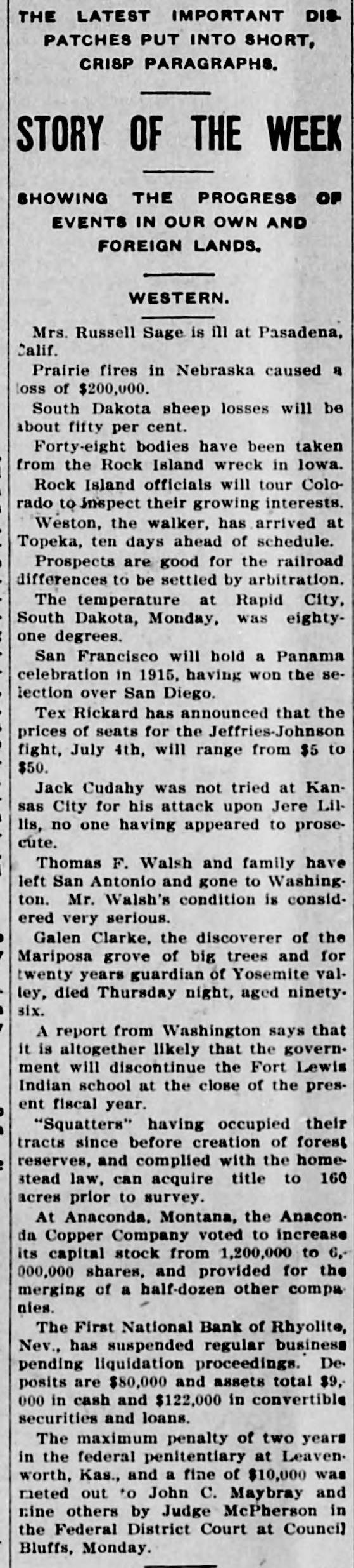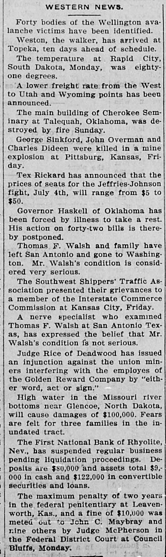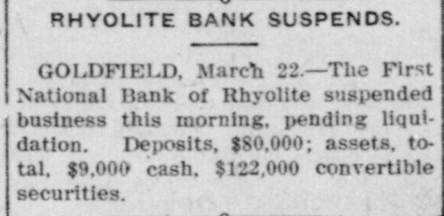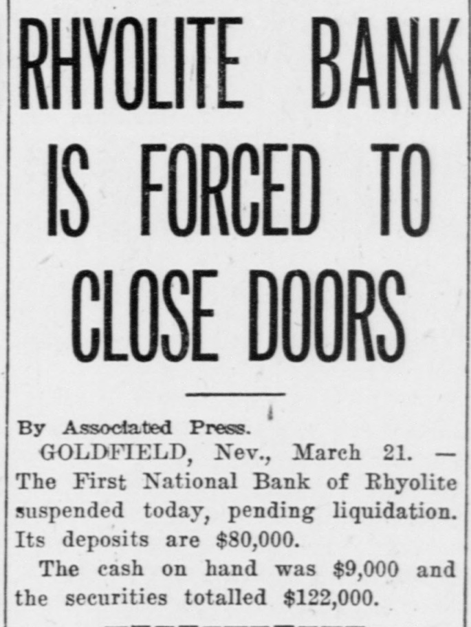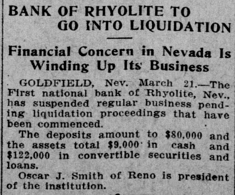 PEOPLE ASTOUNDED AT THE SMITHS' RASCALITY lands in southern California and other RENO, April 5.-The Gazette has properties, any one of which should the following on the Eureka bank pull, not only the banks but ourselves, failure: The failure of the Bank of and that within a very few months. Eureka now seems to be a very serious "The affairs of the banks will be matter, inasmuch as the assets are but closed up without expense other than a small fraction of the liabilities. The that which is absolutely necessary. failure of the First National Bank of The failure was due to our investRhyolite does not appear to be a very ments, particularly in southern Nebad one, inasmuch as the deposits are vada, many of which proved disaspractically assured by the assets of the trous. We worked in the face of ininstitution. numerable obstacles, the first being The Eureka bank failure is in the the San Francisco fire, which caused neighborhood of a $300,000 collapse, it a shrinkage in our securities amountcontaining the lifetime savings of a ing to half a million dollars. The fall number of people and the ready money in the price of our Goldfield holdings, of the county of Eureka. due to the labor troubles there, caught Osear J. Smith of this city, Bert L. us for a couple of bundred thousand Smith and Mrs. O. J. Smith are the dollars more and the great panic comones most directly responsible for the pleted the disaster. Since that we have failure and they have come to the struggled to get our heads above water assistance of the institution with pracand I think we should have succeeded tically every cent they possess and all in time. But the crash has come now of their personal realty holdings. and all we will do the rest of our days, O. J. Smith was seen by a Gazette if it requires our remaining years, will iepresentative this morning and was be to make everybody square, and this given the first interview that has apwill, we hope, require only a few t peared since the failure. Mr. Smith months. Then, and only then, we will has perceptably aged during the past endeavor to repair our individual forten days and he has assumed a more tunes. serious aspect than his wont, but he "I want to say this, that ! am in is philosophie through it all. He said: close touch with the banking institu"My brother, my wife and I were tions throughout the state and all of V in apparently prosperous circumstances them are in most prosperous condibefore the crash came, but we played L. tion, especially those of Reno, which out our hands to the last card, or, as o are as strong as the rock of Gibrala billiard devotee would say, to the tar. The First National Bank of Elko, end of the string. h with which my brother and myself We did not really know that the were once prominently connected, is crash, would come until the night beas solvent as any other banking instifore the suspension of the Rhyolite intution in Nevada. The Bank of Manstitution. It would have been better hattan, which we controlled has been for our depositors and for ourselves if liquidated without loss to a single inwe had wound up our banking business dividual. Nearly all accounts have months ago, but we had investments been paid and there 1S more than that were liable to prove of great value enough gold coin in the vaults to pay at any moment. everything that remains and then "That is all there is to the story and some." we have all three placed what forGeorge H. Taylor of the Washoe tune we possess back of the instituCounty Bank was asked what he knew tions. Mrs. Smith will possess absoregarding the suspension, inasmuch as lutely nothing more than the equity in he is interested in the Eureka Cattle her house and I will have my law company, one of the chief creditors of library, the tool of my trade; Bert will the institution, but he said that he had emerge equally stripped of his posses. not yet received any definite informasions. tion. "I am confident that the Rhyolite Moritz Sheeline was to have acceptbank will pay every cent of its ined the receivership of the institution, debtedness and am assured that the but he returned without reaching that Eureka institution will do equally as point, on account of the railroad well. My brother and I will not only washouts. He said that he intended surrender all our present assets, but to accept the receivership, but would we will labor for the balance of our now decline, because of the small stidays to the end that no man can say pend that was allowed, it being the we ever took advantage of them to intention to keep the cost of liquidation the extent of a fraction of a cent. to the very lowest possible amount. "We have a lease at Pioneer, oil