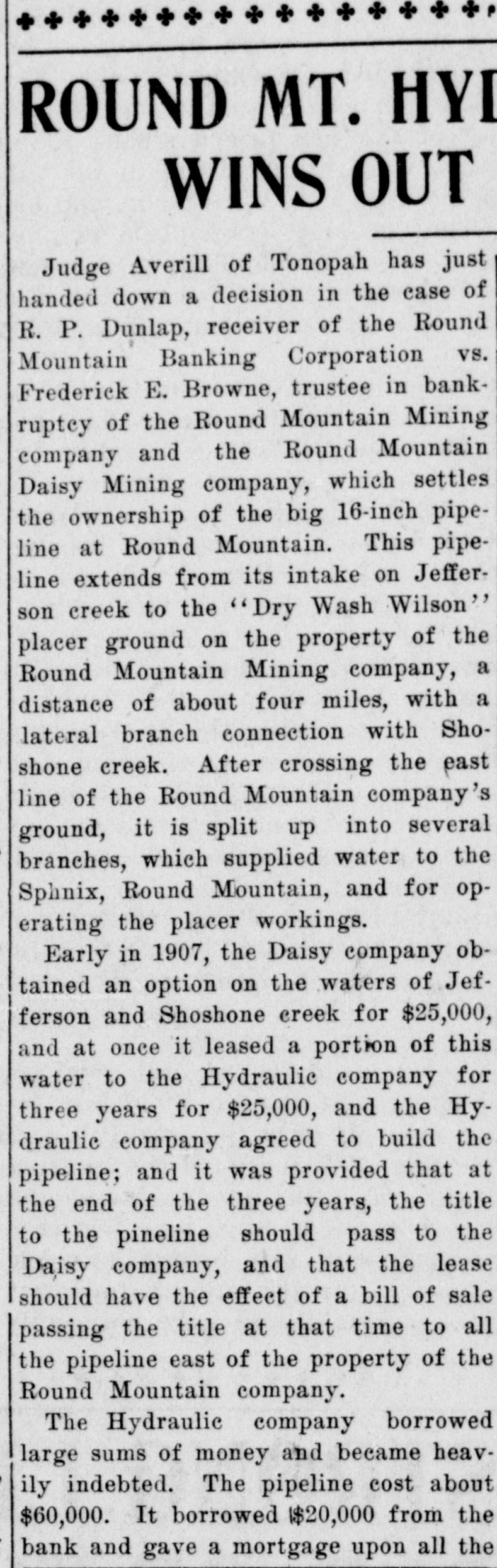 # ROUND MT. HYD # WINS OUT Judge Averill of Tonopah has just handed down a decision in the case of R. P. Dunlap, receiver of the Round Mountain Banking Corporation vs. Frederick E. Browne, trustee in bankruptcy of the Round Mountain Mining company and the Round Mountain Daisy Mining company, which settles the ownership of the big 16-inch pipeline at Round Mountain. This pipeline extends from its intake on Jefferson creek to the "Dry Wash Wilson" placer ground on the property of the Round Mountain Mining company, a distance of about four miles, with a lateral branch connection with Shoshone creek. After crossing the east line of the Round Mountain company's ground, it is split up into several branches, which supplied water to the Sphnix, Round Mountain, and for operating the placer workings. Early in 1907, the Daisy company obtained an option on the waters of Jefferson and Shoshone creek for $25,000, and at once it leased a portion of this water to the Hydraulic company for three years for $25,000, and the Hydraulic company agreed to build the pipeline; and it was provided that at the end of the three years, the title to the pineline should pass to the Daisy company, and that the lease should have the effect of a bill of sale passing the title at that time to all the pipeline east of the property of the Round Mountain company. The Hydraulic company borrowed large sums of money and became heavily indebted. The pipeline cost about $60,000. It borrowed $20,000 from the bank and gave a mortgage upon all the