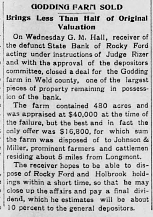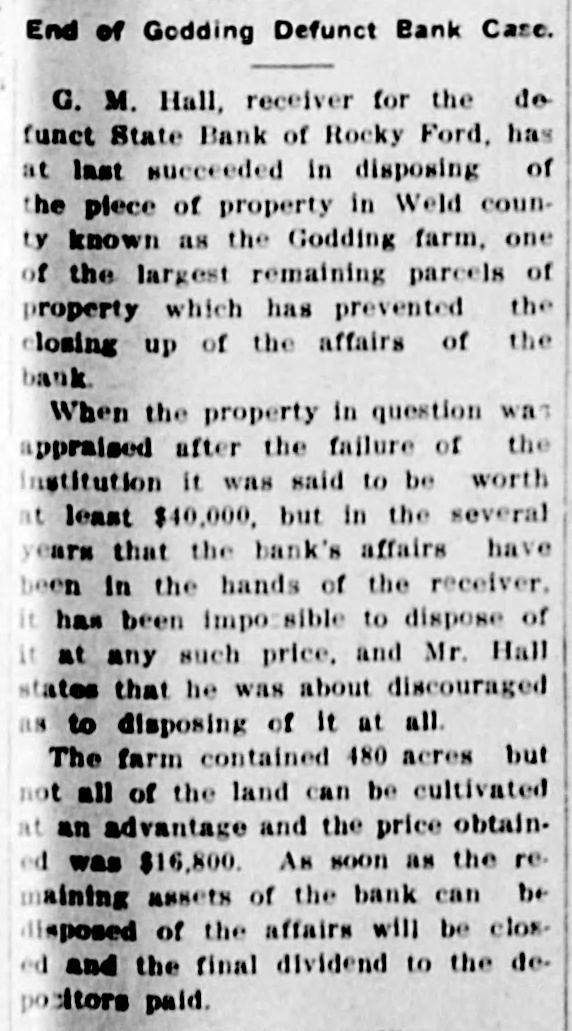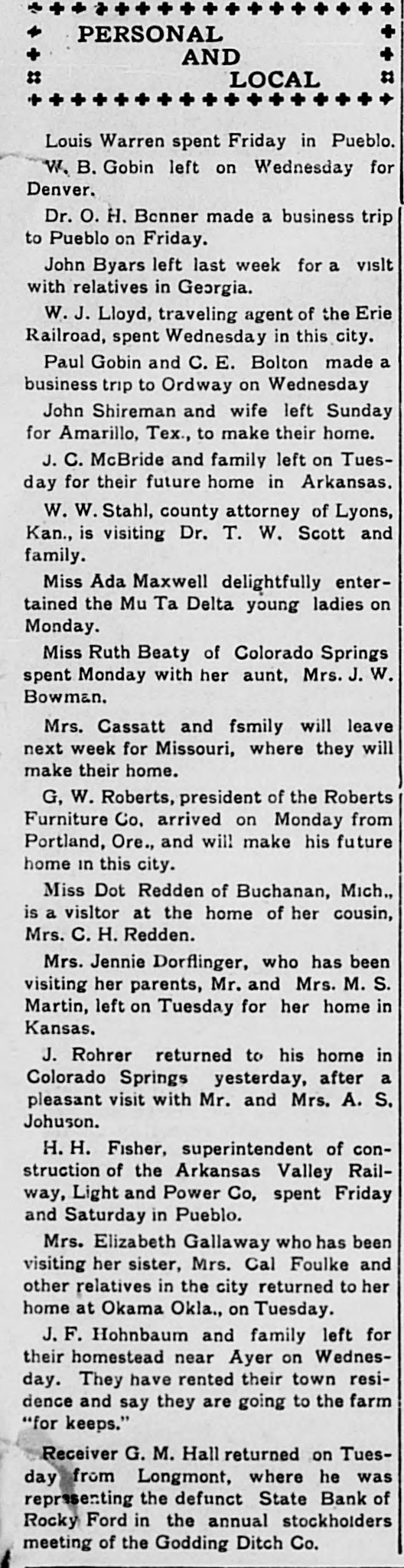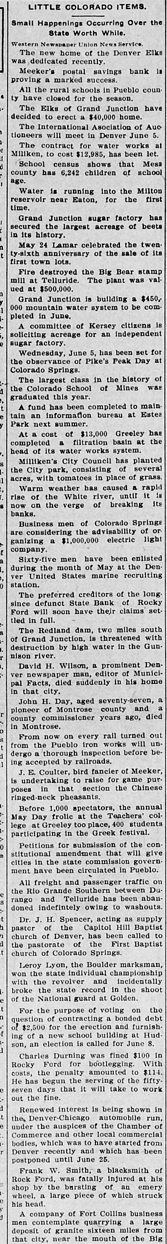LITTLE COLORADO ITEMS. Small Happenings Occurring Over the State Worth While. Western Newspaper Union News Service. The new home of the Denver Elks was dedicated recently. Meeker's postal savings bank is proving a marked success. All the rural schools in Pueblo county have closed for the season. The Elks of Grand Junction have decided to erect a $40,000 home. The International Asociation of Auctioneers will meet in Denver June 5. The contract for water works at Miliken, to cost $12,985, has been let. School census shows that Mesa county has 6,242 children of school age. Water is running into the Milton reservoir near Eaton, for the first time. Grand Junction sugar factory has secured the largest acreage of beets in its history. May 24 Lamar celebrated the twenty-sixth anniversary of the sale of its first town lots. Fire destroyed the Big Bear stamp mill at Telluride. The plant was valued at $500,000. Grand Junction is building a $450,000 mountain water system to be completed in June. A committee of Kersey citizens is soliciting acreage for an independent sugar factory. Wednesday, June 5, has been set for the observance of Pike's Peak Day at Colorado Springs. The largest class in the history of the Colorado School of Mines was graduated this year. A fund has been completed to maintain an information bureau at Estes Park next summer. At a cost of $13,000 Greeley has completed a filtration basin at the head of its water works system. Milliken's City Council has planted the City park, consisting of several acres, with tomatoes in place of grass. Warm weather has caused a rapid rise of the White river, until it is now on the verge of breaking its banks. Business men of Colorado Springs are considering the advisability of organizing a $1,000,000 electric light company. Sixty-five men have been enlisted during the month of May at the Denver United States marine recruiting station. The preferred creditors of the longsince defunct State Bank of Rocky Ford will soon have their claims settled in full. The Redland dam, two miles south of Grand Junction, is threatened with destruction by high water in the Gunnison river. David H. Wilson, a prominent Denver newspaper man, editor of Municipal Facts, died suddenly in his home in that city. John H. Day, aged seventy-seven, a pioneer of Montrose county and a county commissioner years ago, died in Montrose. From now on every rail turned out from the Pueblo iron works will undergo a thorough inspection before being accepted by railroads. J. E. Coulter, bird fancier of Meeker, is undertaking to raise for game purposes in that section the Chinese ringed-neck pheasants. Before 1,000 spectators, the annual May Day frolic at the Teachers' college at Greeley too place, 400 students participating in the Greek festival. Petitions for submission of the constitutional amendment that will give cities in the state commission government have been circulated in Pueblo. All freight and passenger traffic on the Rio Grande Southern between Durango and Telluride has been abandoned indefintely owing to washouts. Dr. J. H. Spencer, acting as supply pastor of the Capitol Hill Baptist church of Denver, has been called to the pastorate of the First Baptist church of Colorado Springs. Leroy Lyon, the Boulder marksman, won the state individual championship with the revolver and incidentally broke the state record in the shoot of the National guard at Golden. For the purpose of voting on the question of contracting a bonded debt of $2,500 for the erection and furnishing of a new school building at Hudson, an election is called for June 8. Charles Durning was fined $100 in Rocky Ford for bootlegging. With costs, the penalty amounted to $114. He has begun the serving of the fiftyseven days that it will take to work out the fine. Renewed interest is being shown in the, Denver-Chicago automobile run, under the auspices of the Chamber of Commerce and other local commercial
