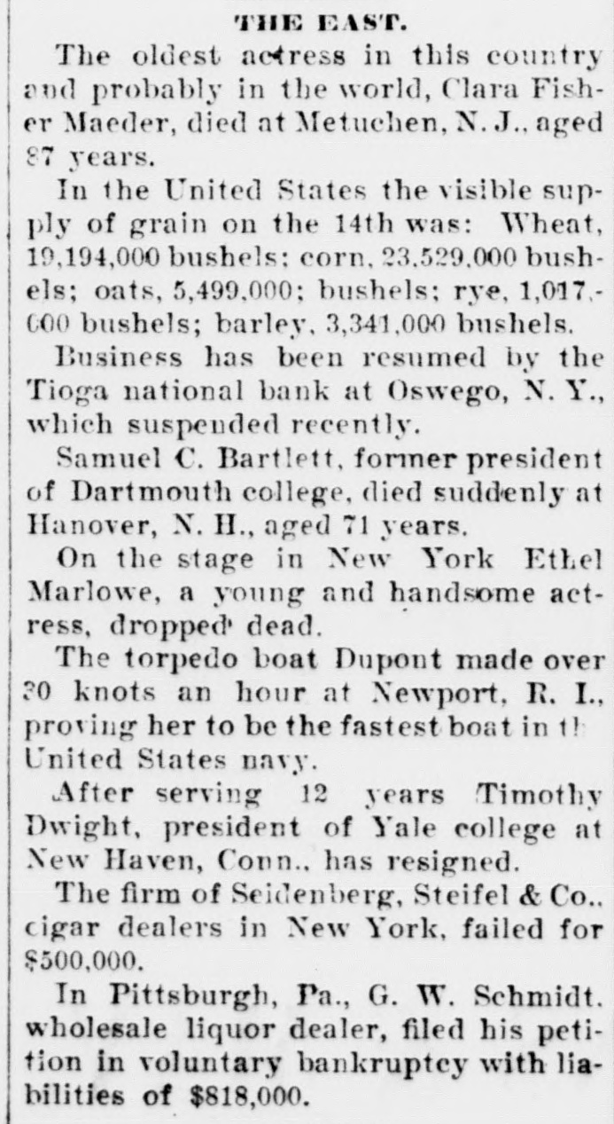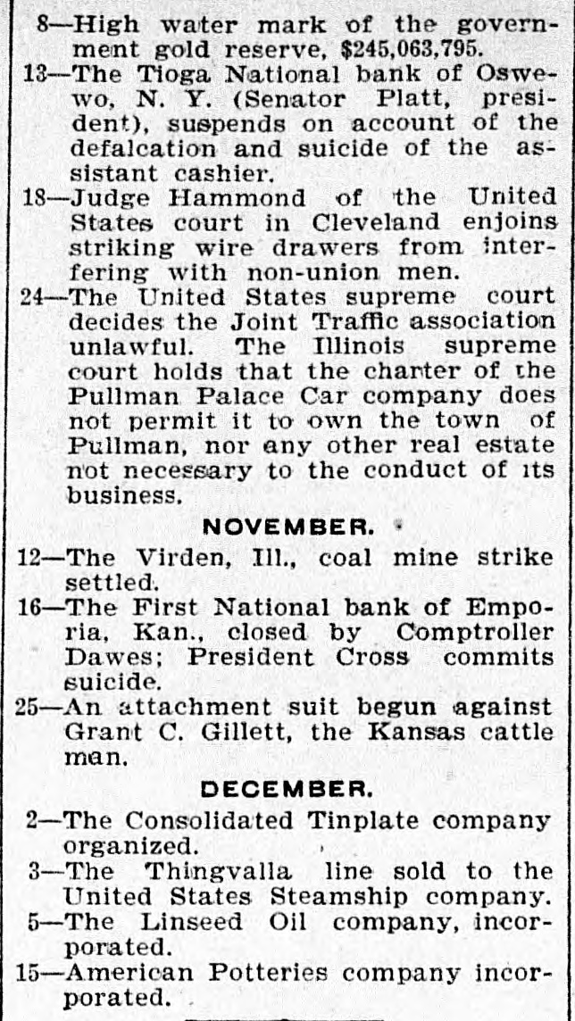 SENATOR T. C. PLATT'S BANK. Bawes Orders the Comptroller Owego Institution Closed. Comptroller of the Currency Charles G. Dawes yesterday ordered the suspension of the Tioga National Bank, of Owego, N. Y., of which Senator T. C. Platt is president, on account of a heavy defalcation by the assistant cashier, Eli W. Stone, who died Wednesday night. Orders closing the bank's doors were wired by Comptroller Dawes to Cashier F. E. Platt, who is a brother of Senator Thomas C. Platt. The text of the comptroller's telegram to Cashier Platt was, "Close the doors of the bank; receive no more deposits. I have placed C. E. Van Brocklin. national bank examiner, in charge of the bank. This action was taken by the comptroller as a result of the recent examination by Examiner Van Brock in, which, as stated. disclosed a large defalcation on the part of Assistant Cashier Stone. Last Tuesday night Examiner Van Brocklin called on Assistant Cashier