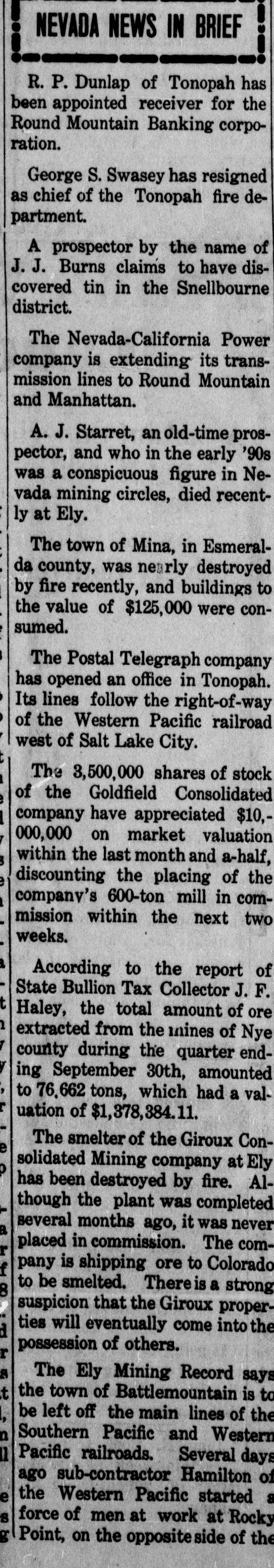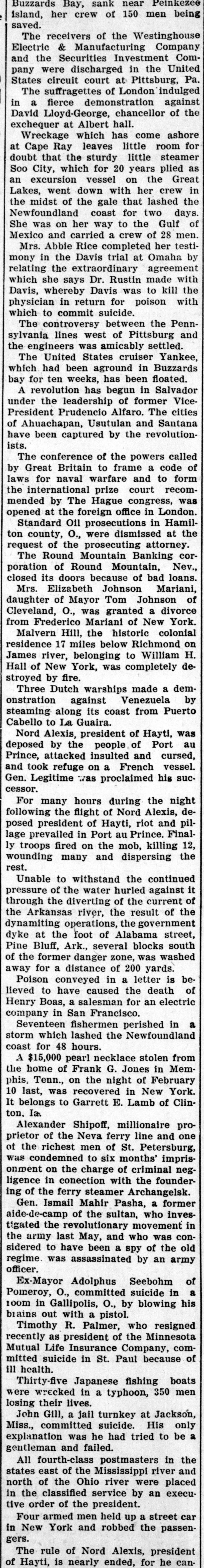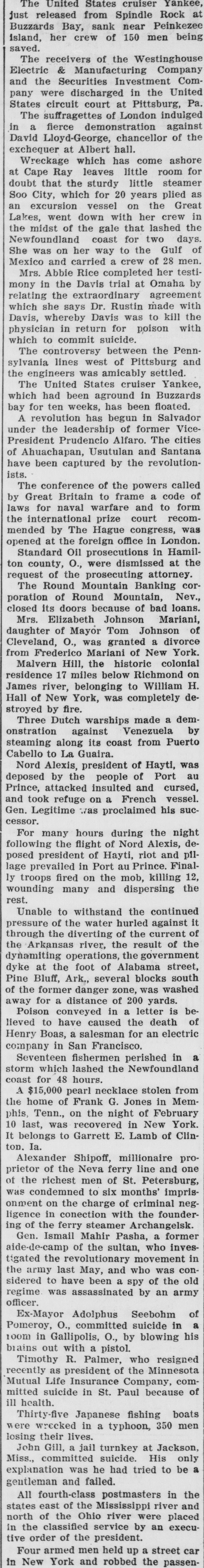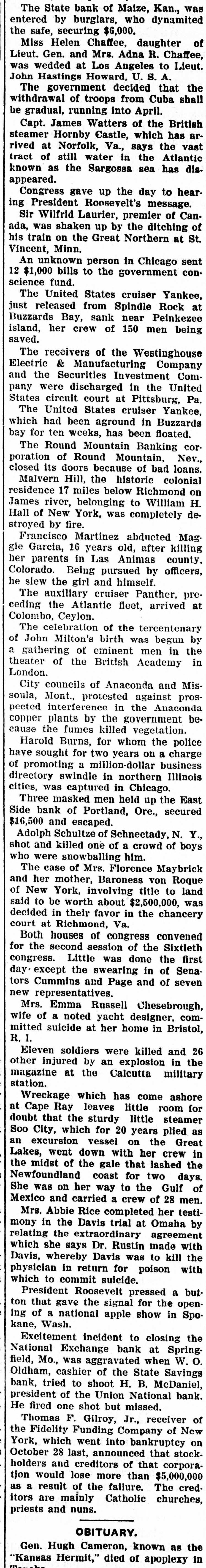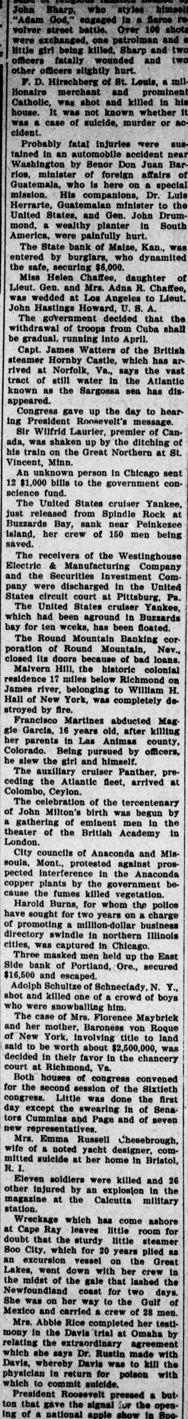 John Sharp. who styles himself "Adam God," engaged in a fierce re volver street battle. Over 100 shots were exchanged, one patrolman and little girl being killed, Sharp and two two pus рерипом Jatally offects other officers slightly hurt. F. D. Hirschberg of St. Louis, a millionaire merchant and prominent Catholic, was shot and killed in his house. It was not known whether it -08 JO mander subtote, JO case B SEM cident. Probably fatal injuries were sustained in an automobile accident near Washington by Senor Don Juan Barrios, minister of foreign affairs of special B uo here sp oum mission. His companions, Dr. Luis Herrarte, Guatemalan minister to the United States, and Gen. John Drummond, a wealthy planter in South America, were painfully hurt. The State bank of Maize, Kan., was entered by burglars, who dynamited the safe, securing $6,000. Miss Helen Chaffee, daughter of Lieut. Gen. and Mrs. Adna R. Chaffee, was wedded at Los Angeles to Lieut. John Hastings Howard, U. S. A. The government decided that the withdrawal of troops from Cuba shall be gradual, running into April. Capt. James Watters of the British steamer Hornby Castle, which has arrived at Norfolk, Va., says the vast tract of still water in the Atlantic known as the Sargossa sea has disappeared. Congress gave up the day to hearing President Roosevelt's message. Sir Wilfrid Laurier, premier of Canada, was shaken up by the ditching of his train on the Great Northern at St. Vincent, Minn. An unknown person in Chicago sent 12 $1,000 bills to the government conscience fund. The United States cruiser Yankee, just released from Spindle Rock at Buzzards Bay, sank near Peinkezee island, her crew of 150 men being saved. The receivers of the Westinghouse Electric & Manufacturing Company and the Securities Investment Company were discharged in the United States circuit court at Pittsburg, Pa. The United States cruiser Yankee, which had been aground in Buzzards bay for ten wceks, has been floated. The Round Mountain Banking corporation of Round Mountain, Nev., closed its doors because of bad loans. Malvern Hill, the historic colonial residence 17 miles below Richmond on James river, belonging to William H. Hall of New York, was completely destroyed by fire. Francisco Martinez abducted Mag. gie Garcia, 16 years old, after killing her parents in Las Animas county, Colorado. Being pursued by officers, he slew the girl and himself. The auxiliary cruiser Panther, preceding the Atlantic fleet, arrived at Colombo, Ceylon. The celebration of the tercentenary of John Milton's birth was begun by our up иәш emithent JO gathering B theater of the British Academy in London. City councils of Anaconda and Missoula, Mont., protested against prospected interference in the Anaconda copper plants by the government because the fumes killed vegetation. Harold Burns, for whom the police have sought for two years on a charge of promoting a million-dollar business directory swindle in northern Illinois cities, was captured in Chicago. Three masked men held up the East Side bank of Portland, Ore., secured $16,500 and escaped. Adolph Schultze of Schnectady, N. Y., shot and killed one of a crowd of boys who were snowballing him. The case of Mrs. Florence Maybrick and her mother, Baroness von Roque of New York, involving title to land said to be worth about $2,500,000, was decided in their favor in the chancery court at Richmond, Va. Both houses of congress convened for the second session of the Sixtieth congress. Little was done the first day except the swearing in of Senators Cummins and Page and of seven new representatives. Mrs. Emma Russell Chesebrough, wife of a noted yacht designer, committed suicide at her home in Bristol, 'I H Eleven soldiers were killed and 26 other injured by an explosion in the magazine at the Calcutta military station. Wreckage which has come ashore at Cape Ray leaves little room for doubt that the sturdy little steamer SB pello years 20 JOJ milch CHIP oog an excursion vessel on the Great Lakes, went down with her crew in the midst of the gale that lashed the Newfoundland coast for two days. She was on her way to the Gulf of Mexico and carried a crew of 28 men. Mrs. Abbie Rice completed her testimony in the Davis trial at Omaha by arreement our relating which she says Dr. Rustin made with UPI 01 SEM DATE mbereby Dates, physician in return for poison with which to commit suicide. President Roosevelt pressed a but-uedo 405 [suS]s the SAUD that not