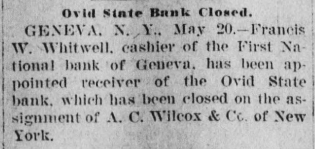 Ovid State Bank Closed. GENEVA. N.Y., May 20.-Francis W. Whitwell. cashier of the First National bank of Geneva, has been appointed receiver of the Ovid State bank, which has been closed on the assignment of A.C. Wilcox & Cc. of New York.