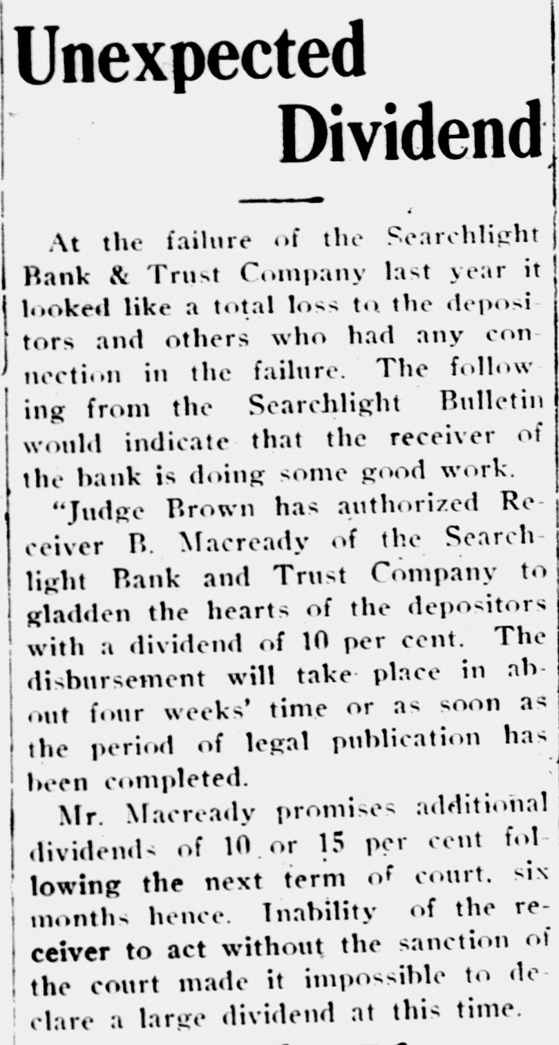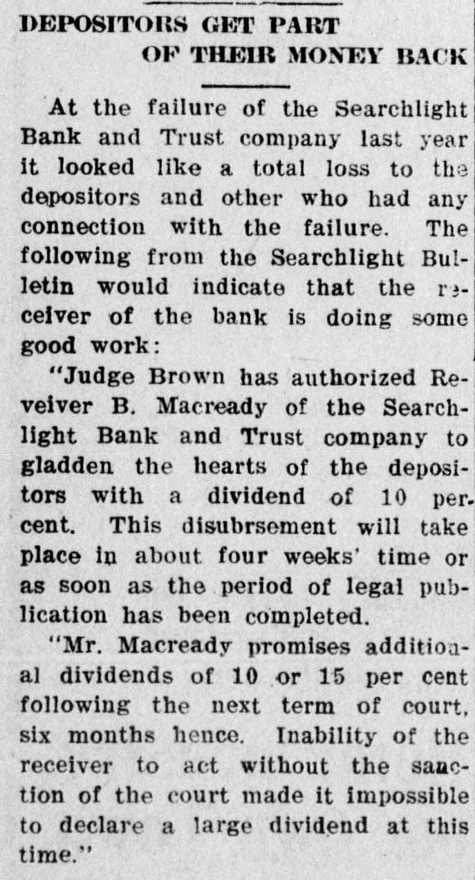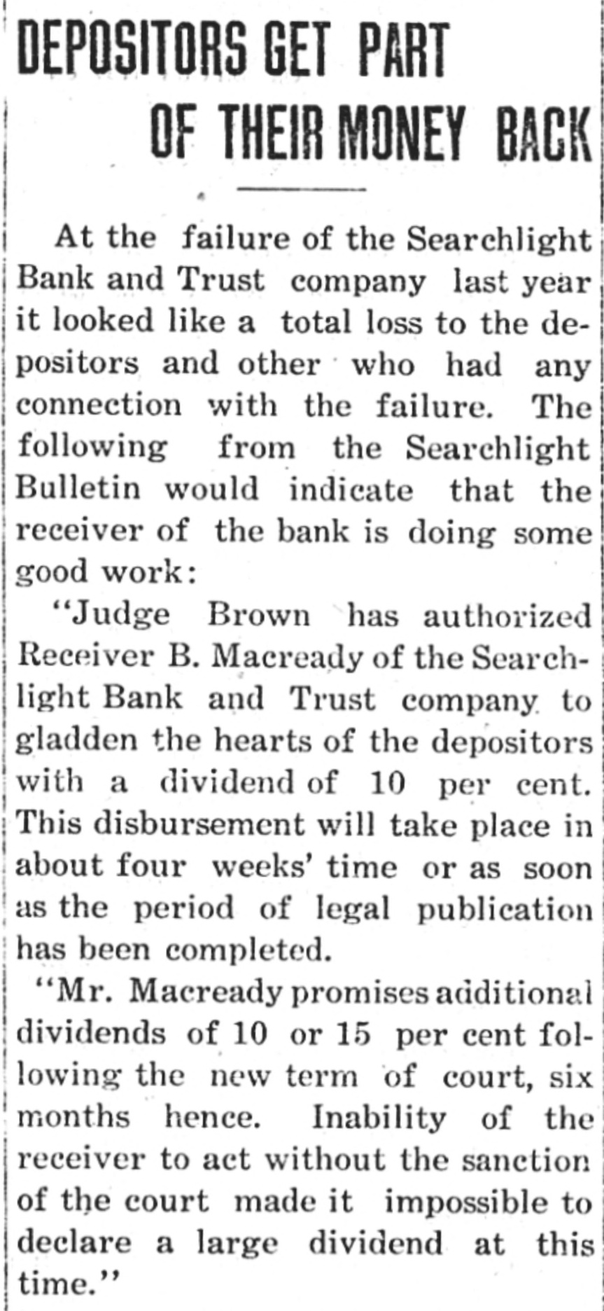 DEPOSITORS GET PART OF THEIR MONEY BACK At the failure of the Searchlight Bank and Trust company last year it looked like a total loss to the depositors and other who had any connection with the failure. The following from the Searchlight Bulletin would indicate that the receiver of the bank is doing some good work: "Judge Brown has authorized Reveiver B. Macready of the Searchlight Bank and Trust company to gladden the hearts of the depositors with a dividend of 10 percent. This disubrsement will take place in about four weeks' time or as soon as the period of legal publication has been completed. "Mr. Macready promises additional dividends of 10 or 15 per cent following the next term of court, six months hence. Inability of the receiver to act without the sanction of the court made it impossible to declare a large dividend at this time."