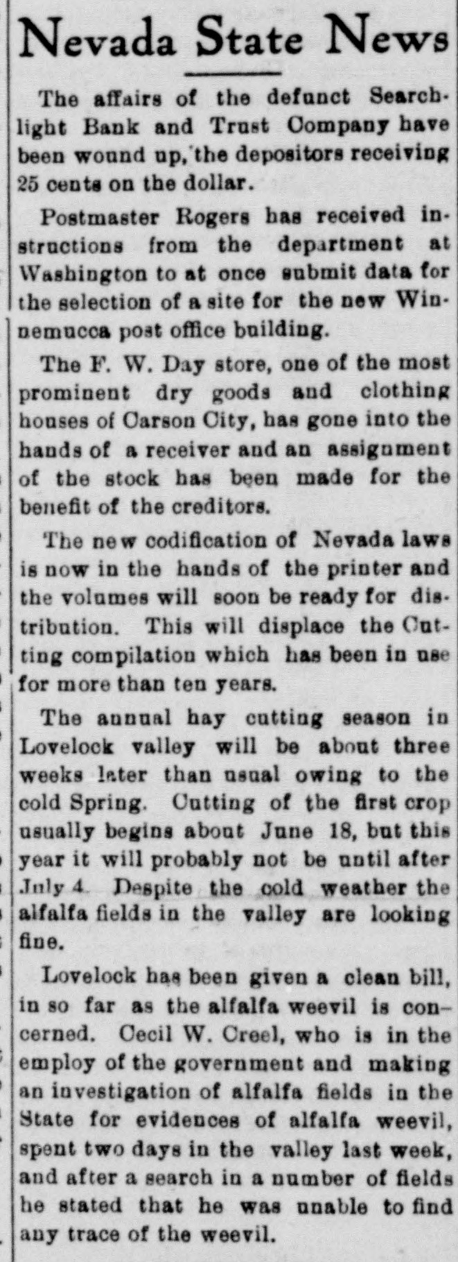 Lovelock has been given a clean bill, in so far as the alfalfa weevil is concerned. Cecil W. Creel, who is in the employ of the government and making an investigation of alfalfa fields in the State for evidences of alfalfa weevil, spent two days in the valley last week, and after a search in a number of fields he stated that he was unable to find any trace of the weevil.
