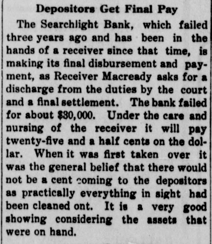 Depositors Get Final Pay The Searchlight Bank, which failed three years ago and has been in the hands of a receiver since that time, is making its final disbursement and payment, as Receiver Macready asks for a discharge from the duties by the court and a final settlement. The bank failed for about $30,000. Under the care and nursing of the receiver it will pay twenty-five and a half cents on the dollar. When it was first taken over it was the general belief that there would not be a cent coming to the depositors as practically everything in sight had been cleaned ont. It is a very good showing considering the assets that were on hand.