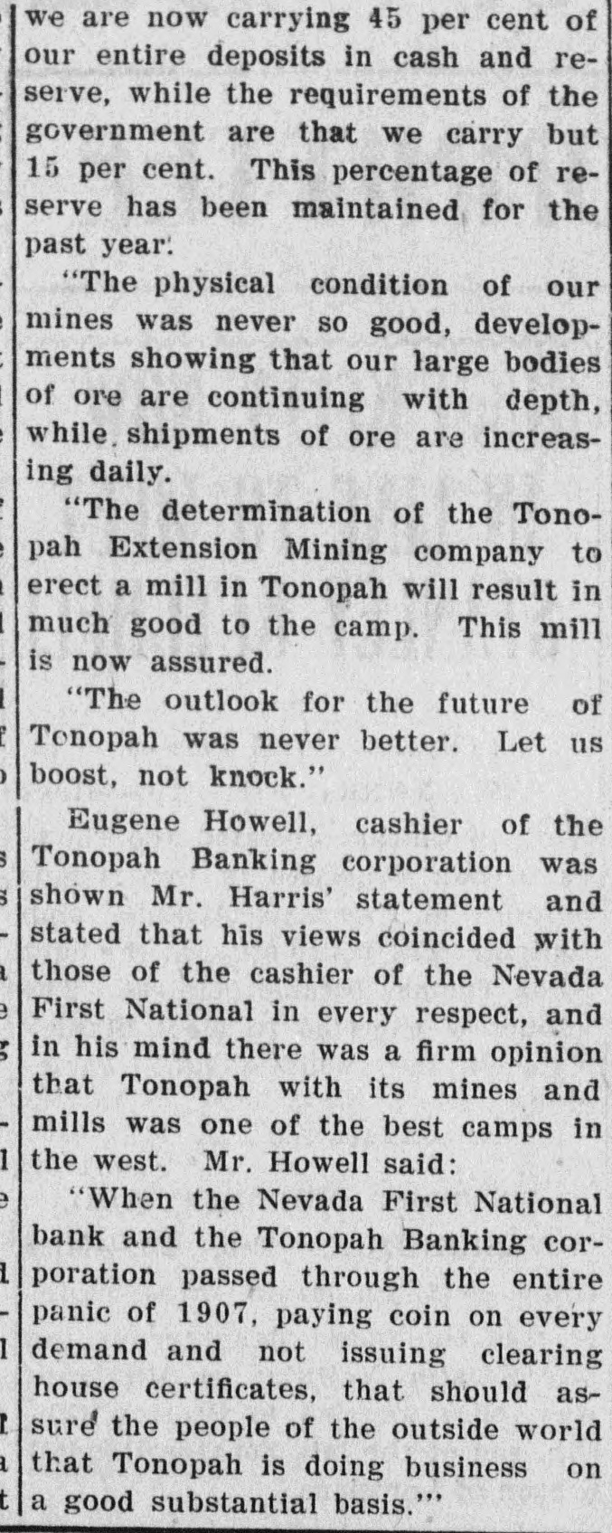 BANKS TO OPEN MONDAY "Whereas, We believe the opening of this bank may tend to ameliothe contrary. and it is evident that the banks will resume tomorrow rate the condition of the community: therefore, be it morning. "Resolved, That the Nevada First National Bank of Tonopah, on Mon. R. C. Moore of the Tonopah Banking Corporation said last night Notwithstanding the Procladay morning, October 28th, 1907, at the hour of 9 o'clock, regularly rethat he was to confer with Mr. Cook today. and that he was of the opinsame and continue its general banking business as in the past." ion from the instructions received that there would be a general resumpmation of Gov. Sparks Detion of the houses controlled by Wingfield and Nixon. With regard to the State Bank and Trust Company. there has been no Cashier Raycraft last night received official notice of the continuance change in the situation locally; but they are pretty busy in Goldfield, and of the holidays. He received notice also that all the banks in Reno would the principal depositors are doing all in their power to prevent the ap. claring Legal Holidays Until resume on Monday. pointment of a receiver, which has been asked for by Attorney Nagle. Two "That will tend to relieve the situation," said he, "and the banks in hundred names, it is said, have been affixed to a petition to Judge LanNovember 4th, Financial Insouthern Nevada will open as fast as they can gather in their reserves gan, which reads as follows: and get into shape to do business. When the banks do open, they must be "To the Hon. F. P. Langan, Judge of the First Judicial District of in shape to continue. I think that the Governor has acted wisely in prostitutions WillResume Busthe State of Nevada, in and for Esmeralda county: longing the holidays." "We, the undersigned depositors and creditors of the Goldfield Mr. Moore of the Tonopah Banking Corporation said that he had not branch of the State Bank and Trust Company, residing in Goldfield, Neiness Tomorrow Morning. been officially informed of the holidays. He thought that the entire situvada, do hereby petition your honor that you refuse the application of ation was looking better than at any time since the trouble began. This the petitioners in the suit which is now before your honor asking that a rewas the case, not only in the East, but in Nevada as well. ceiver be appointed for the State Bank and Trust Company. The Wingfield and Nixon banks will open up for business tomorrow The directors of the Nevada First National Bank held a meeting last "We have full faith and confidence in the bank and its managemorning, notwithstanding that Governor Sparks has declared all next night and passed the following resolutions: ment, and believe that the best results can be obtained by leaving the week a legal holiday. This action was resolved upon at 5:30 o'clock last "Whereas, The Nevada First National Bank of Tonopah, on Thursbank in the same situation as at present and give the managers of the night, when George Wingfield made the announcement. Later in the day, the 24th day of October, 1907, at the hour of 11 o'clock A. M., closed bank the opportunity to regulate their affairs so that they can open the evening John S. Cook was called up by telephone and was asked if this its doors at the request of other banks in the community and out of rebank at the earliest possible moment. report was true. spect for the proclamation of the Governor of this State, proclaiming "We further believe that the appointment of a receiver would only "That is the intention at the present time," said Mr. Cook, "and I Thursday, Friday and Saturday legal holidays; and complicate matters and would be the cause of a large bill of expense cannot see any reason for changing the program." "Whereas, The Directors of this bank have a high regard and rewhich would eventually fall upon the creditors and depositors in the spect for the judgment and discretion of the Governor of Nevada, who Mr. Cook stated that he had, not received official information of the bank. has proclaimed a further six-day period of legal holidays; nevertheless, Governor's proclamation, and that he did not think it would interfere "Hoping that your honor will refuse the application for the appointwith the plan outlined for opening up the Wingfield and Nixon banks. If we believe that a proper consideration for our depositors and a just and ment of a receiver, we remain, proper treatment of them and our clients demands the opening of our there should be any change in the program, he promised to notify the "Respectfully," doors for regular banking business forthwith; and Bonanza. Up to the hour of going to press, nothing had been heard to