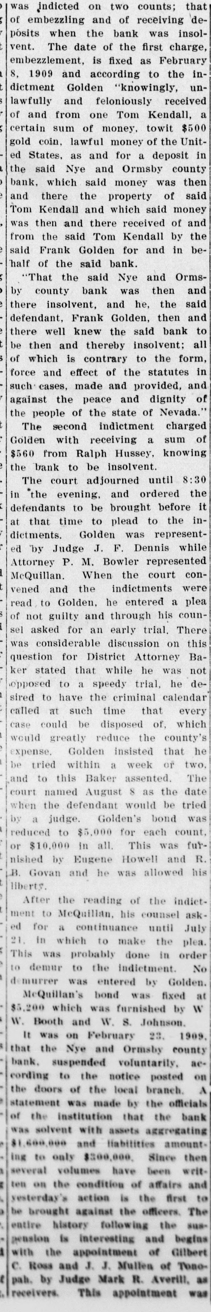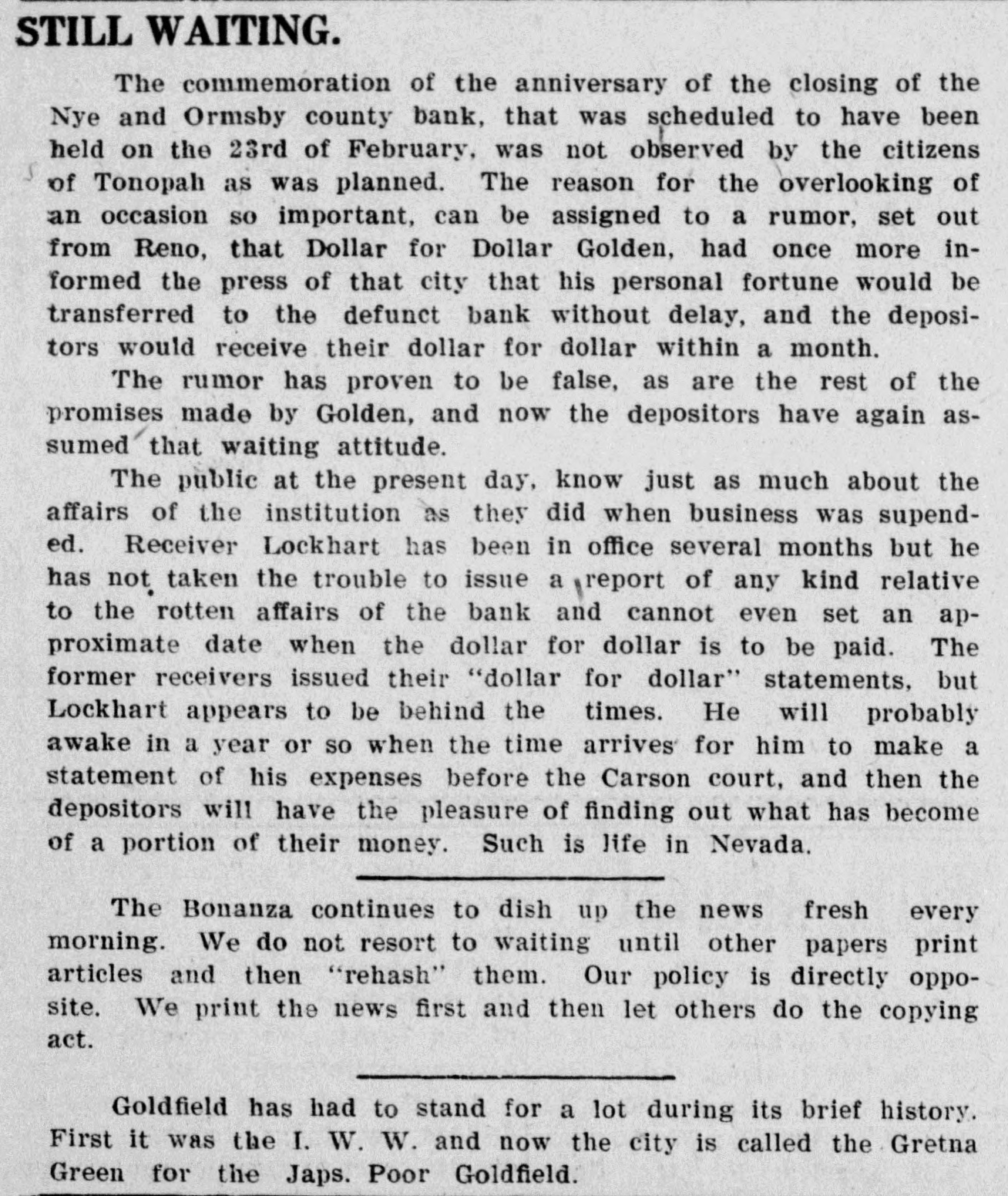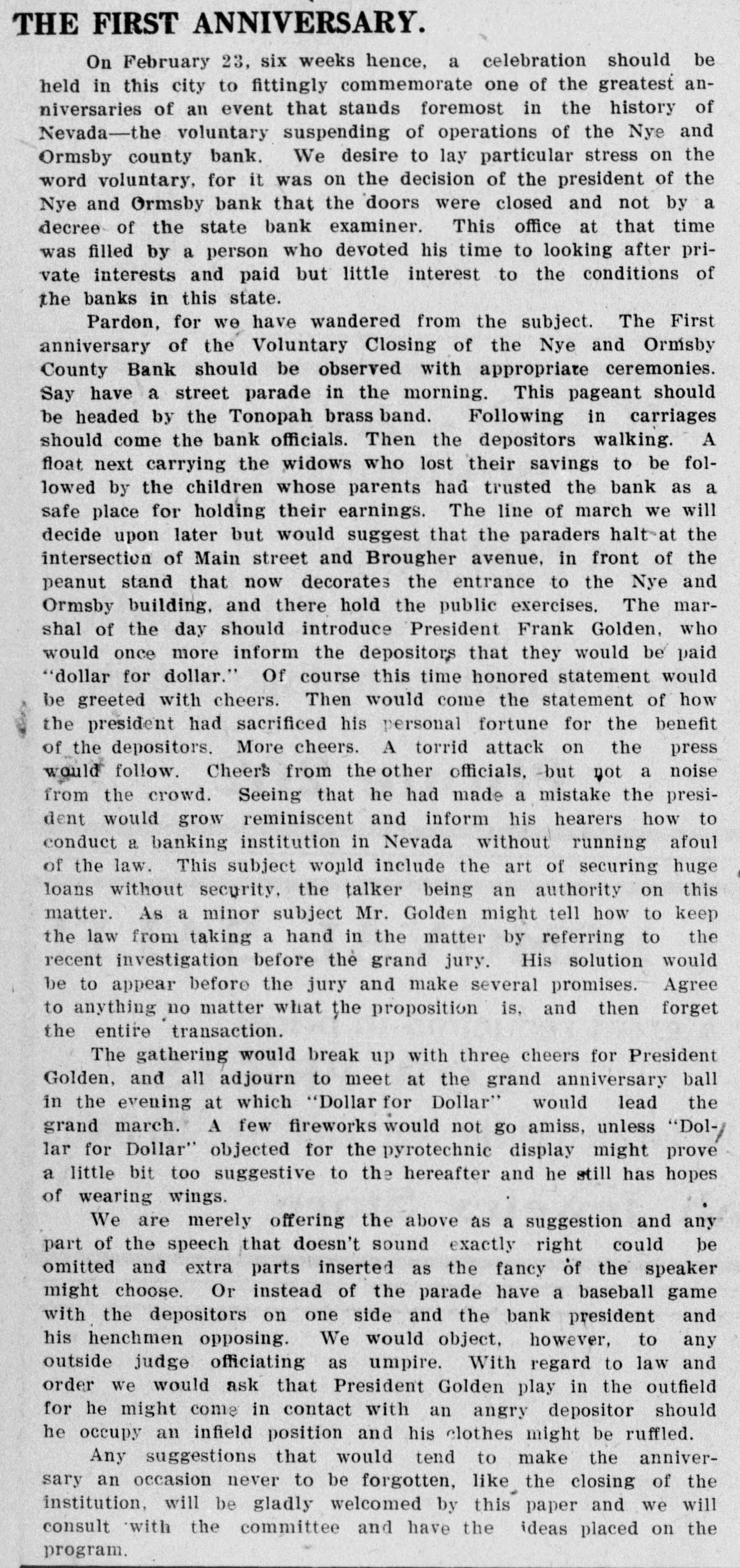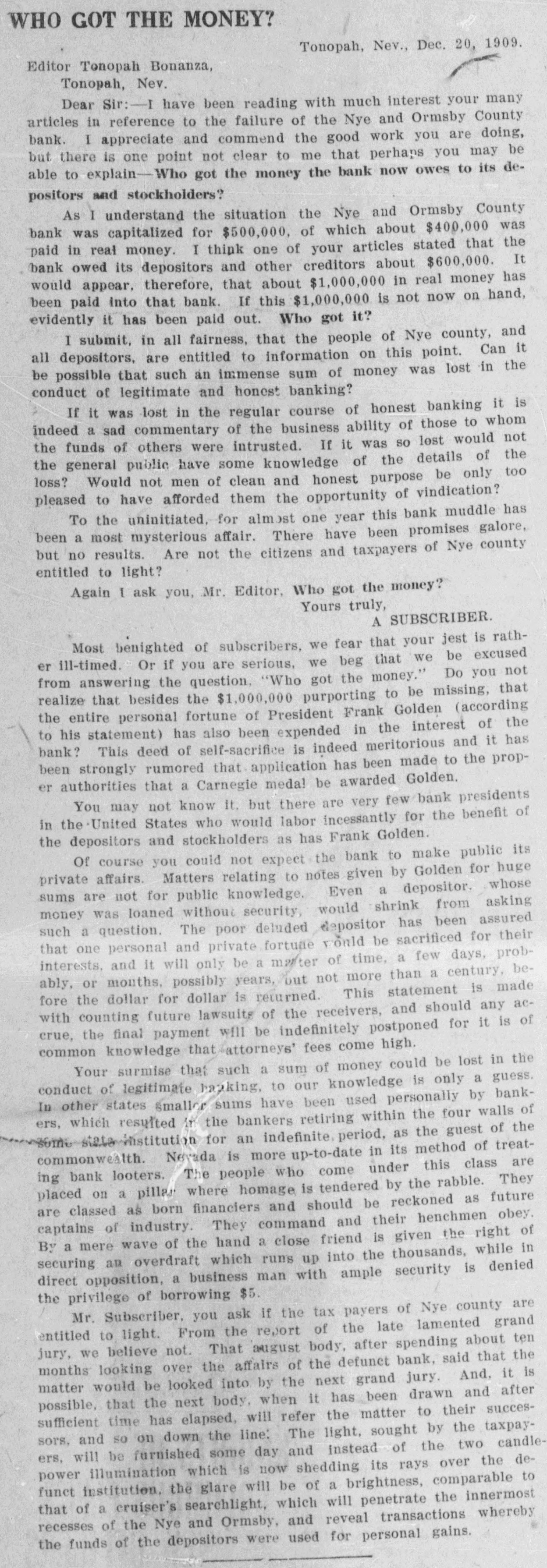 WHO GOT THE MONEY? Tonopah, Nev., Dec. 20, 1909. Editor Tonopah Bonanza, Tonopah, Nev. Dear Sir:-I have been reading with much interest your many articles in reference to the failure of the Nye and Ormsby County bank. I appreciate and commend the good work you are doing, but there is one point not clear to me that perhaps you may be able to explain-Who got the money the bank now owes to its depositors and stockholders? As I understand the situation the Nye and Ormsby County bank was capitalized for $500,000, of which about $400,000 was paid in real money. I think one of your articles stated that the bank owed its depositors and other creditors about $600,000. It would appear. therefore, that about $1,000,000 in real money has been paid into that bank. If this $1,000,000 is not now on hand, evidently it has been paid out. Who got it? I submit, in all fairness, that the people of Nye county, and all depositors, are entitled to information on this point. Can it be possible that such an immense sum of money was lost in the conduct of legitimate and honest banking? If it was lost in the regular course of honest banking it is indeed a sad commentary of the business ability of those to whom the funds of others were intrusted. If it was so lost would not the general public have some knowledge of the details of the loss? Would not men of clean and honest purpose be only too pleased to have afforded them the opportunity of vindication? To the uninitiated. for almost one year this bank muddle has been a most mysterious affair. There have been promises galore, but no results. Are not the citizens and taxpayers of Nye county entitled to light? Again I ask you, Mr. Editor, Who got the money? Yours truly, A SUBSCRIBER. Most benighted of subscribers, we fear that your jest is rather ill-timed. Or if you are serious, we beg that we be excused from answering the question, "Who got the money." Do you not realize that besides the $1,000,000 purporting to be missing, that the entire personal fortune of President Frank Golden (according to his statement) has also been expended in the interest of the bank? This deed of self-sacrifice is indeed meritorious and it has been strongly rumored that application has been made to the proper authorities that a Carnegie medal be awarded Golden. You may not know it. but there are very few bank presidents in the United States who would labor incessantly for the benefit of the depositors and stockholders as has Frank Golden. Of course you could not expect the bank to make public its private affairs. Matters relating to notes given by Golden for huge sums are not for public knowledge. Even a depositor. whose money was loaned without security, would shrink from asking such a question. The poor deluded depositor has been assured that one personal and private fortune would be sacrificed for their interests, and it will only be a mater of time, a few days, probably, or months. possibly years, out not more than a century, before the dollar for dollar is returned. This statement is made with counting future lawsuits of the receivers, and should any accrue, the final payment will be indefinitely postponed for it is of common knowledge that attorneys' fees come high. Your surmise that such a sum of money could be lost in the conduct of legitimate banking, to our knowledge is only a guess. In other states smalle sums have been used personally by bankers, which resulted in the bankers retiring within the four walls of some state institution for an indefinite period, as the guest of the commonwealth. Nevada is more up-to-date in its method of treating bank looters. The people who come under this class They are placed on a pillar where homage is tendered by the rabble. are classed as born financiers and should be reckoned as future captains of industry. They command and their henchmen obey. of By mere wave of the hand a close friend is given the right securing a an overdraft which runs up into the thousands, while in direct opposition, a business man with ample security is denied the privilege of borrowing $5. Mr. Subscriber, you ask if the tax payers of Nye county are entitled to light. From the report of the late lamented grand jury, we believe not. That august body, after spending about the ten months looking over the affairs of the defunct bank, said that is matter would be looked into by the next grand jury. And, it possible, that the next body, when it has been drawn and after sufficient time has elapsed, will refer the matter to their successors. and so on down the line: The light, sought by the taxpaywill be furnished some day and instead of the two candleers, illumination which is now shedding its rays over the defunct power institution, the glare will be of a brightness, comparable to that of a cruiser's searchlight, which will penetrate the innermost recesses of the Nye and Ormsby, and reveal transactions whereby the funds of the depositors were used for personal gains.