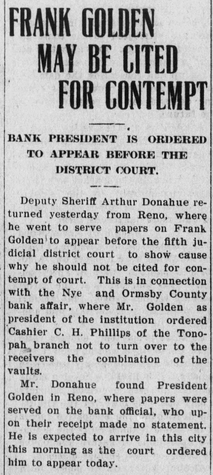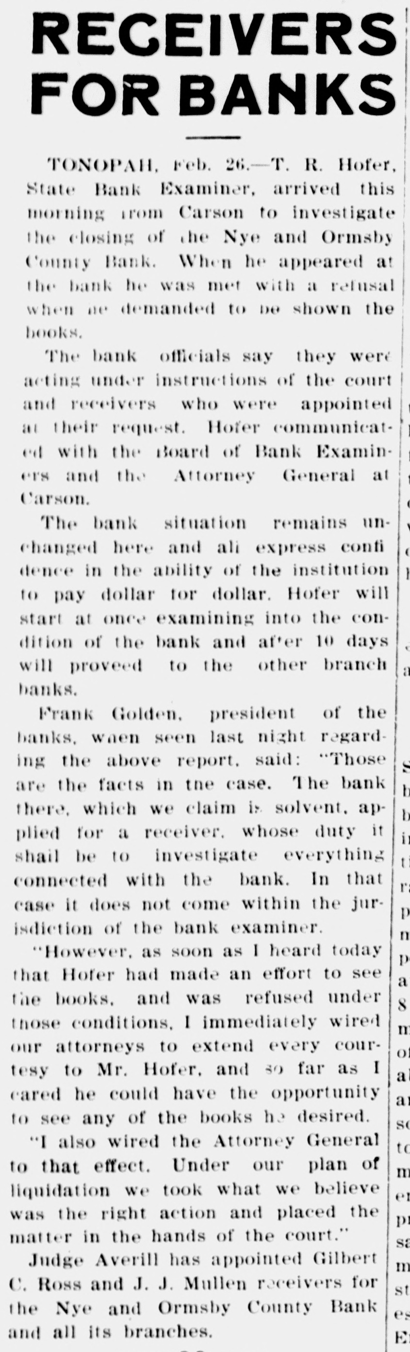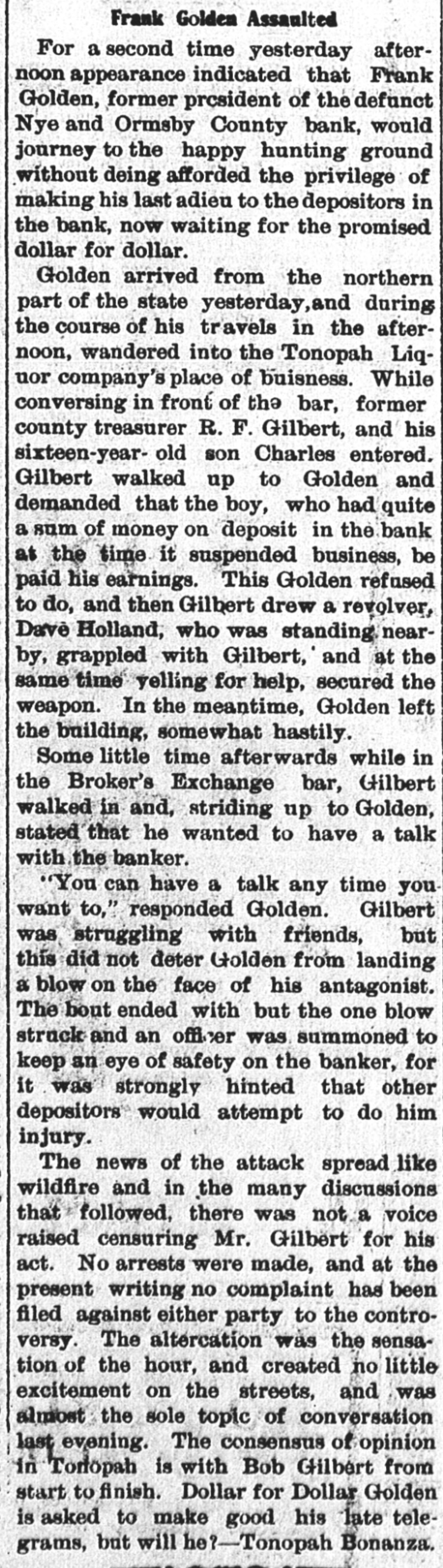 WHO GOT THE MONEY? Tonopah, Nev., Dec. 20, 1909. Editor Tonopah Bonanza, Tonopah, Nev. Dear Sir:-I have been reading with much interest your many articles in reference to the failure of the Nye and Ormsby County bank. I appreciate and commend the good work you are doing, but there is one point not clear to me that perhaps you may be able to explain-Who got the money the bank now owes to its depositors and stockholders? As I understand the situation the Nye and Ormsby County bank was capitalized for $500,000, of which about $400,000 was paid in real money. I think one of your articles stated that the bank owed its depositors and other creditors about $600,000. It would appear. therefore, that about $1,000,000 in real money has been paid into that bank. If this $1,000,000 is not now on hand, evidently it has been paid out. Who got it? I submit, in all fairness, that the people of Nye county, and all depositors, are entitled to information on this point. Can it be possible that such an immense sum of money was lost in the conduct of legitimate and honest banking? If it was lost in the regular course of honest banking it is indeed a sad commentary of the business ability of those to whom the funds of others were intrusted. If it was so lost would not the general public have some knowledge of the details of the loss? Would not men of clean and honest purpose be only too pleased to have afforded them the opportunity of vindication? To the uninitiated. for almost one year this bank muddle has been a most mysterious affair. There have been promises galore, but no results. Are not the citizens and taxpayers of Nye county entitled to light? Again I ask you, Mr. Editor, Who got the money? Yours truly, A SUBSCRIBER. Most benighted of subscribers, we fear that your jest is rather ill-timed. Or if you are serious, we beg that we be excused from answering the question, "Who got the money." Do you not realize that besides the $1,000,000 purporting to be missing, that the entire personal fortune of President Frank Golden (according to his statement) has also been expended in the interest of the bank? This deed of self-sacrifice is indeed meritorious and it has been strongly rumored that application has been made to the proper authorities that a Carnegie medal be awarded Golden. You may not know it. but there are very few bank presidents in the United States who would labor incessantly for the benefit of the depositors and stockholders as has Frank Golden. Of course you could not expect the bank to make public its private affairs. Matters relating to notes given by Golden for huge sums are not for public knowledge. Even a depositor. whose money was loaned without security, would shrink from asking such a question. The poor deluded depositor has been assured that one personal and private fortune would be sacrificed for their interests, and it will only be a mater of time, a few days, probably, or months. possibly years, out not more than a century, before the dollar for dollar is returned. This statement is made with counting future lawsuits of the receivers, and should any accrue, the final payment will be indefinitely postponed for it is of common knowledge that attorneys' fees come high. Your surmise that such a sum of money could be lost in the conduct of legitimate banking, to our knowledge is only a guess. In other states smalle sums have been used personally by bankers, which resulted in the bankers retiring within the four walls of some state institution for an indefinite period, as the guest of the commonwealth. Nevada is more up-to-date in its method of treating bank looters. The people who come under this class They are placed on a pillar where homage is tendered by the rabble. are classed as born financiers and should be reckoned as future captains of industry. They command and their henchmen obey. of By mere wave of the hand a close friend is given the right securing a an overdraft which runs up into the thousands, while in direct opposition, a business man with ample security is denied the privilege of borrowing $5. Mr. Subscriber, you ask if the tax payers of Nye county are entitled to light. From the report of the late lamented grand jury, we believe not. That august body, after spending about the ten months looking over the affairs of the defunct bank, said that is matter would be looked into by the next grand jury. And, it possible, that the next body, when it has been drawn and after sufficient time has elapsed, will refer the matter to their successors. and so on down the line: The light, sought by the taxpaywill be furnished some day and instead of the two candleers, illumination which is now shedding its rays over the defunct power institution, the glare will be of a brightness, comparable to that of a cruiser's searchlight, which will penetrate the innermost recesses of the Nye and Ormsby, and reveal transactions whereby the funds of the depositors were used for personal gains.