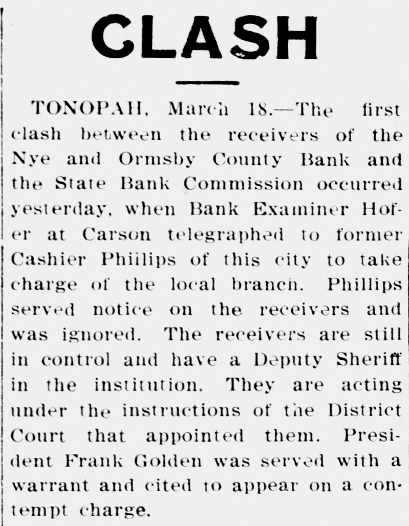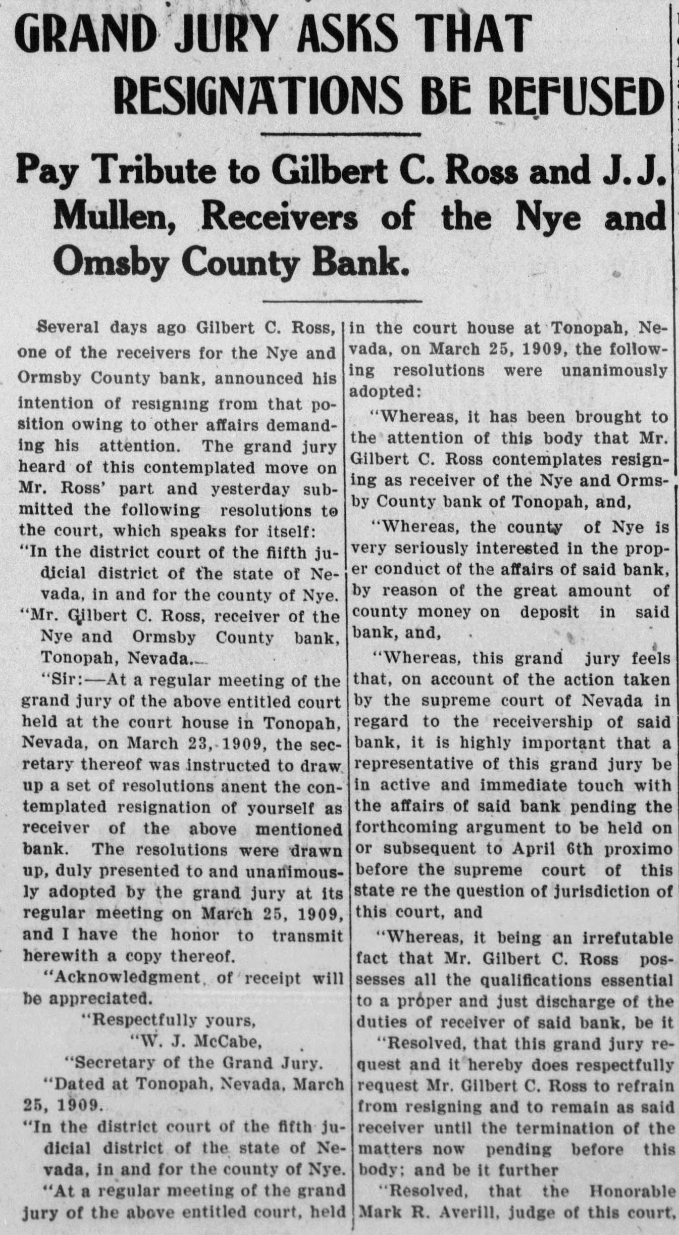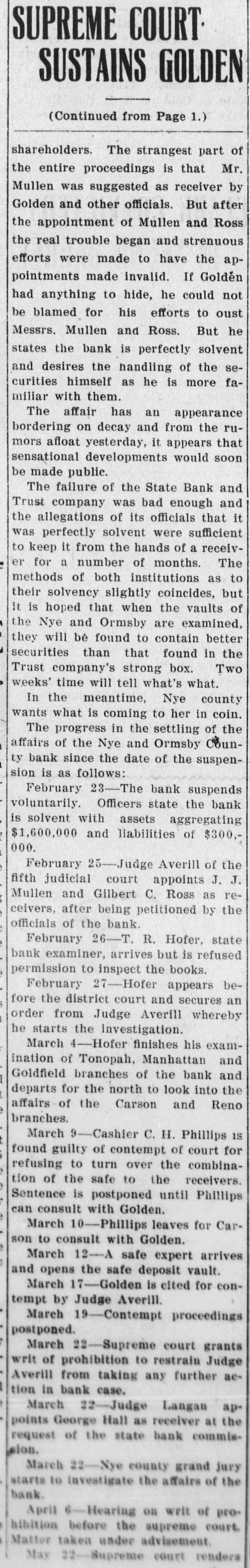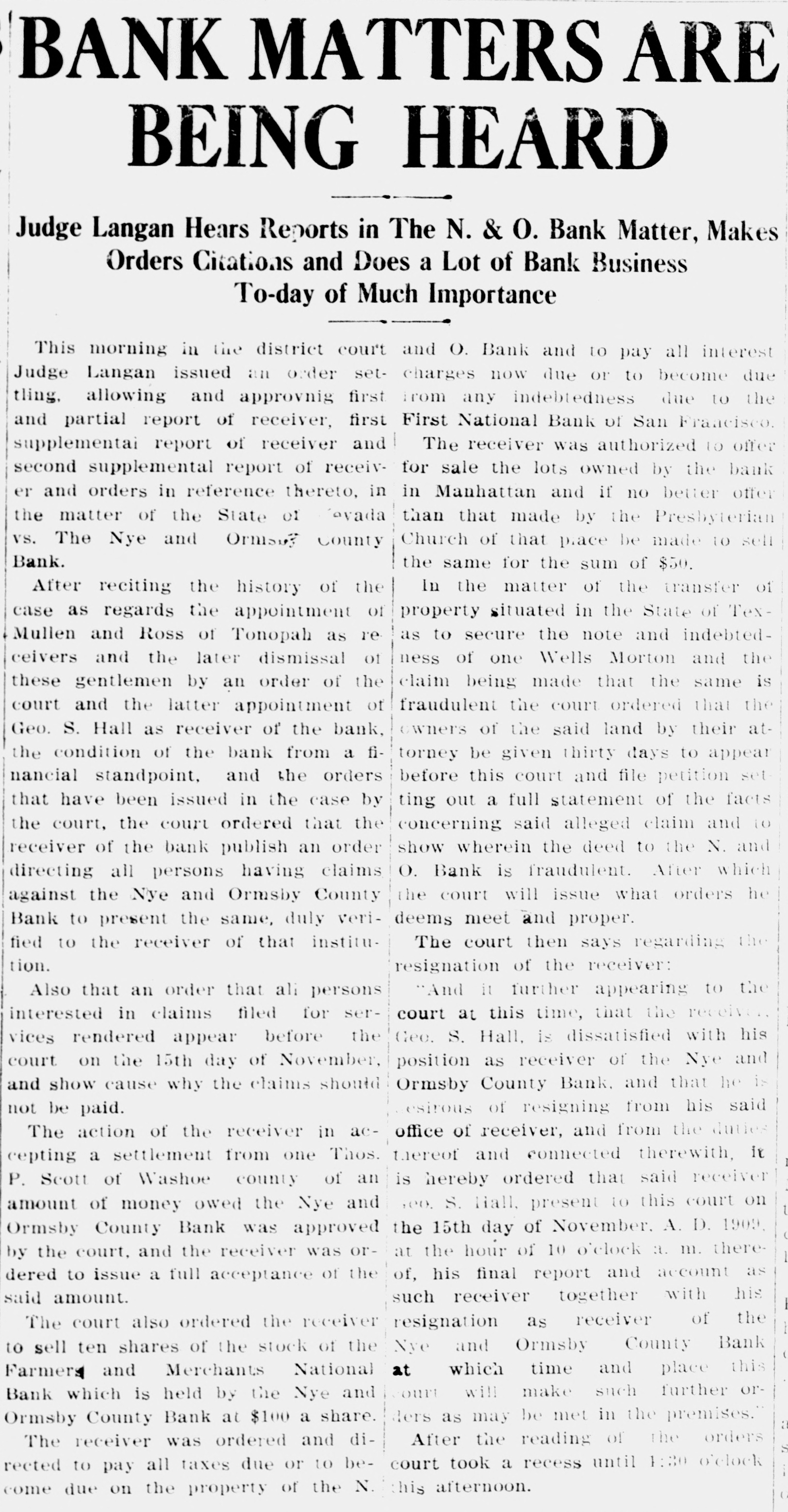 WHO GOT THE MONEY? Tonopah, Nev., Dec. 20, 1909. Editor Tonopah Bonanza, Tonopah, Nev. Dear Sir:-I have been reading with much interest your many articles in reference to the failure of the Nye and Ormsby County bank. I appreciate and commend the good work you are doing, but there is one point not clear to me that perhaps you may be able to explain-Who got the money the bank now owes to its depositors and stockholders? As I understand the situation the Nye and Ormsby County bank was capitalized for $500,000, of which about $400,000 was paid in real money. I think one of your articles stated that the bank owed its depositors and other creditors about $600,000. It would appear. therefore, that about $1,000,000 in real money has been paid into that bank. If this $1,000,000 is not now on hand, evidently it has been paid out. Who got it? I submit, in all fairness, that the people of Nye county, and all depositors, are entitled to information on this point. Can it be possible that such an immense sum of money was lost in the conduct of legitimate and honest banking? If it was lost in the regular course of honest banking it is indeed a sad commentary of the business ability of those to whom the funds of others were intrusted. If it was so lost would not the general public have some knowledge of the details of the loss? Would not men of clean and honest purpose be only too pleased to have afforded them the opportunity of vindication? To the uninitiated. for almost one year this bank muddle has been a most mysterious affair. There have been promises galore, but no results. Are not the citizens and taxpayers of Nye county entitled to light? Again I ask you, Mr. Editor, Who got the money? Yours truly, A SUBSCRIBER. Most benighted of subscribers, we fear that your jest is rather ill-timed. Or if you are serious, we beg that we be excused from answering the question, "Who got the money." Do you not realize that besides the $1,000,000 purporting to be missing, that the entire personal fortune of President Frank Golden (according to his statement) has also been expended in the interest of the bank? This deed of self-sacrifice is indeed meritorious and it has been strongly rumored that application has been made to the proper authorities that a Carnegie medal be awarded Golden. You may not know it. but there are very few bank presidents in the United States who would labor incessantly for the benefit of the depositors and stockholders as has Frank Golden. Of course you could not expect the bank to make public its private affairs. Matters relating to notes given by Golden for huge sums are not for public knowledge. Even a depositor. whose money was loaned without security, would shrink from asking such a question. The poor deluded depositor has been assured that one personal and private fortune would be sacrificed for their interests, and it will only be a mater of time, a few days, probably, or months. possibly years, out not more than a century, before the dollar for dollar is returned. This statement is made with counting future lawsuits of the receivers, and should any accrue, the final payment will be indefinitely postponed for it is of common knowledge that attorneys' fees come high. Your surmise that such a sum of money could be lost in the conduct of legitimate banking, to our knowledge is only a guess. In other states smalle sums have been used personally by bankers, which resulted in the bankers retiring within the four walls of some state institution for an indefinite period, as the guest of the commonwealth. Nevada is more up-to-date in its method of treating bank looters. The people who come under this class They are placed on a pillar where homage is tendered by the rabble. are classed as born financiers and should be reckoned as future captains of industry. They command and their henchmen obey. of By mere wave of the hand a close friend is given the right securing a an overdraft which runs up into the thousands, while in direct opposition, a business man with ample security is denied the privilege of borrowing $5. Mr. Subscriber, you ask if the tax payers of Nye county are entitled to light. From the report of the late lamented grand jury, we believe not. That august body, after spending about the ten months looking over the affairs of the defunct bank, said that is matter would be looked into by the next grand jury. And, it possible, that the next body, when it has been drawn and after sufficient time has elapsed, will refer the matter to their successors. and so on down the line: The light, sought by the taxpaywill be furnished some day and instead of the two candleers, illumination which is now shedding its rays over the defunct power institution, the glare will be of a brightness, comparable to that of a cruiser's searchlight, which will penetrate the innermost recesses of the Nye and Ormsby, and reveal transactions whereby the funds of the depositors were used for personal gains.