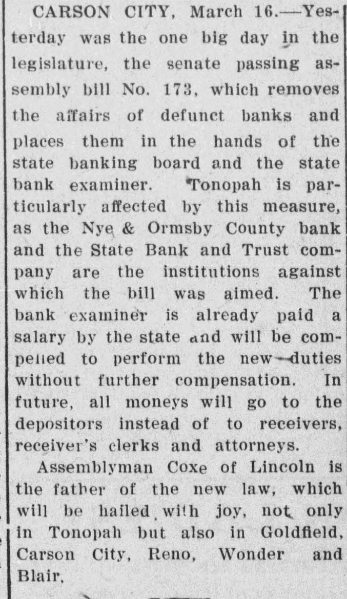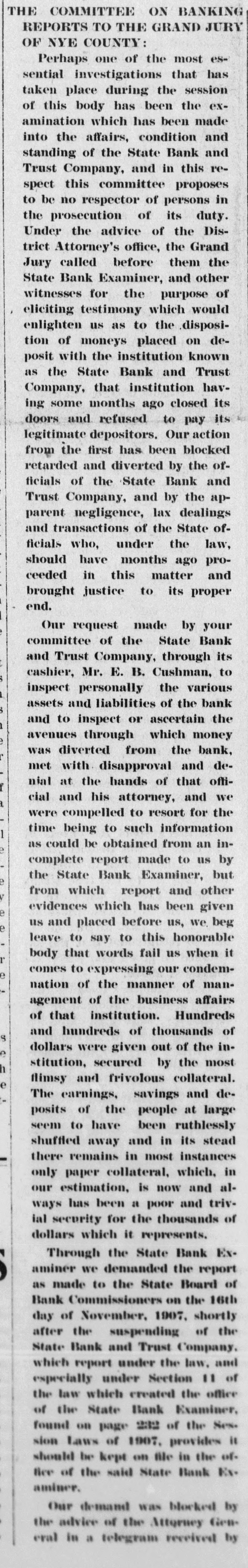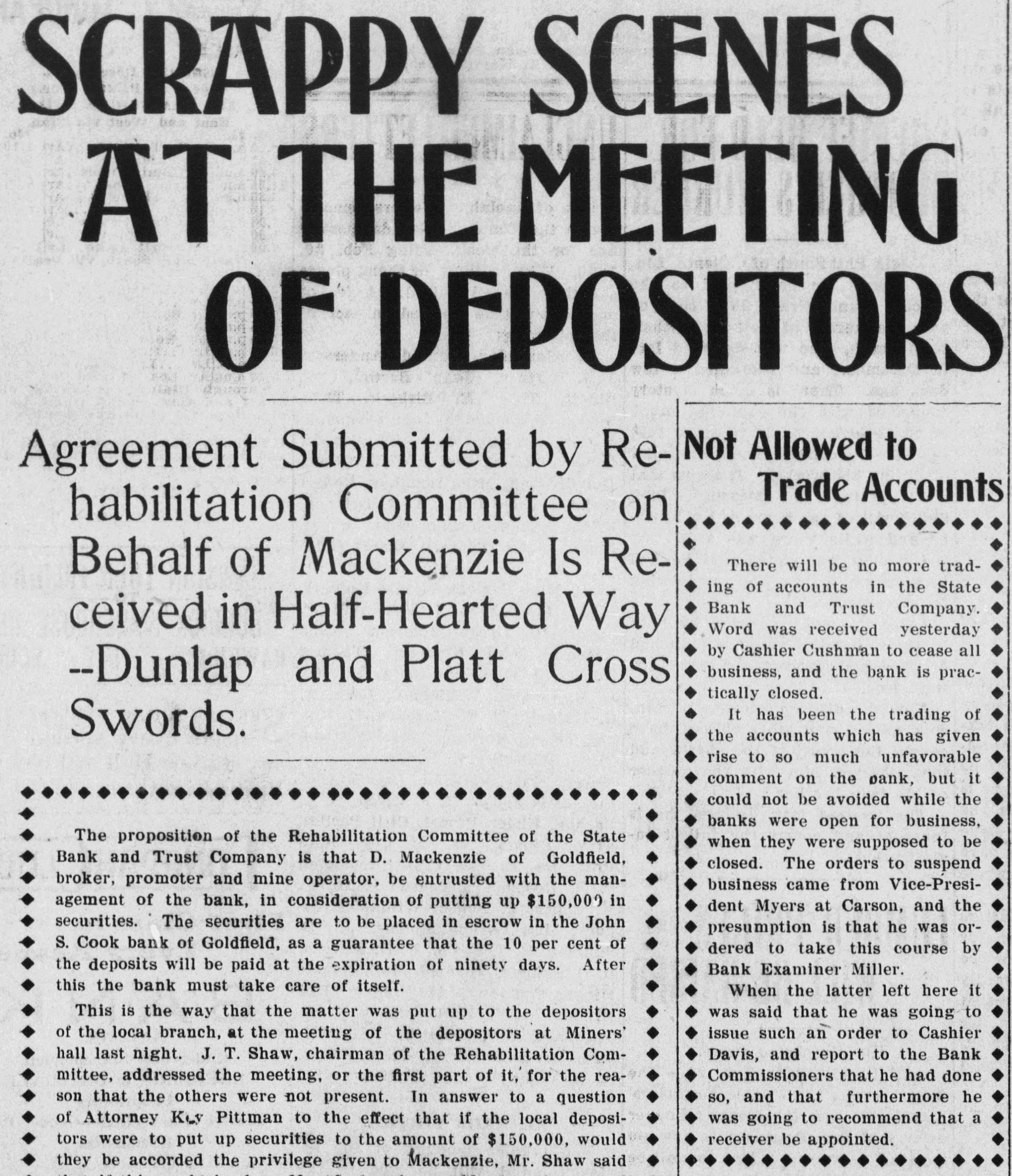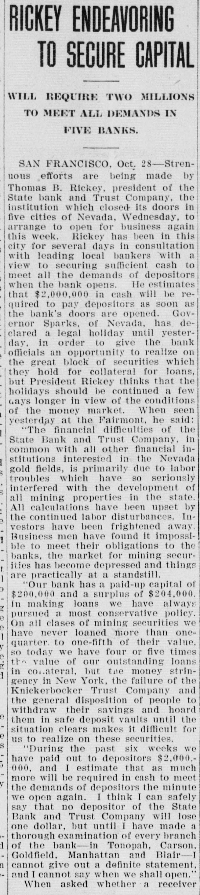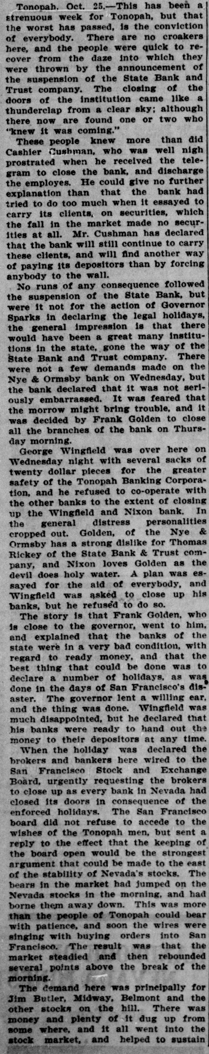 Tonopah. Oct. 25.-This has been a strenuous week for Tonopah, but that the worst has passed, is the conviction of everybody. There are no croakers here, and the people were quick to recover from the daze into which they were thrown by the announcement of the suspension of the State Bank and Trust company. The closing of the doors of the institution came like a thunderclap from a clear sky; although there now are found one or two who "knew it was coming." These people knew more than did Cashier Cushman, who was well nigh prostrated when he received the telegram to close the bank, and discharge the employes. He could give no further explanation than that the bank had tried to do too much when it essayed to carry its clients, on securities, which the fall in the market made no securities at all. Mr. Cushman has declared that the bank will still continue to carry these clients, and will find another way of paying its depositors than by forcing anybody to the wall. No runs of any consequence followed the suspension of the State Bank, but were it not for the action of Governor Sparks in declaring the legal holidays, the general impression is that there would have been a great many institutions in the state, gone the way of the State Bank and Trust company. There were not a few demands made on the Nye & Ormsby bank on Wednesday, but the bank declared that it was not seriously embarrassed. It was feared that the morrow might bring trouble, and it was decided by Frank Golden to close all the branches of the bank on Thursday morning. George Wingfield was over here on Wednesday night with several sacks of twenty dollar pieces for the greater safety of the Tonopah Banking Corporation, and he refused to co-operate with the other banks to the extent of closing up the Wingfield and Nixon bank. In the general distress personalities cropped out. Golden, of the Nye & Ormsby has a strong dislike for Thomas Rickey of the State Bank & Trust company, and Nixon loves Golden as the devil does holy water. A plan was essayed for the aid of everybody, and Wingfield was asked to close up his banks, but he refused to do so. The story is that Frank Golden, who is close to the governor, went to him, and explained that the banks of the state were in a very bad condition, with regard to ready money, and that the best thing that could be done was to declare a number of holidays, as was done in the days of San Francisco's disaster. The governor lent a willing ear. and the thing was done. Wingfield was much disappointed, but he declared that his banks were ready to hand out the money to their depositors at any time. When the holiday was declared the brokers and bankers here wired to the San Francisco Stock and Exchange Board, urgently requesting the brokers to close up as every bank in Nevada had closed its doors in consequence of the enforced holidays. The San Francisco board did not refuse to accede to the wishes of the Tonopah men, but sent a reply to the effect that the keeping of the board open would be the strongest argument that could be made to the east of the stability of Nevada's stocks. The bears in the market had jumped on the Nevada stocks in the morning, and had borne them away down. This was more than the people of Tonopah could bear with patience, and soon the wires were singing with buying orders into San Francisco. The result was that the market steadied and then rebounded several points above the break of the morning. The demand here was principally for Jim Butler, Midway, Belmont and the other stocks on the hill. There was money and plenty of it dug up from some where, and it all went into the stock market, and helped to sustain