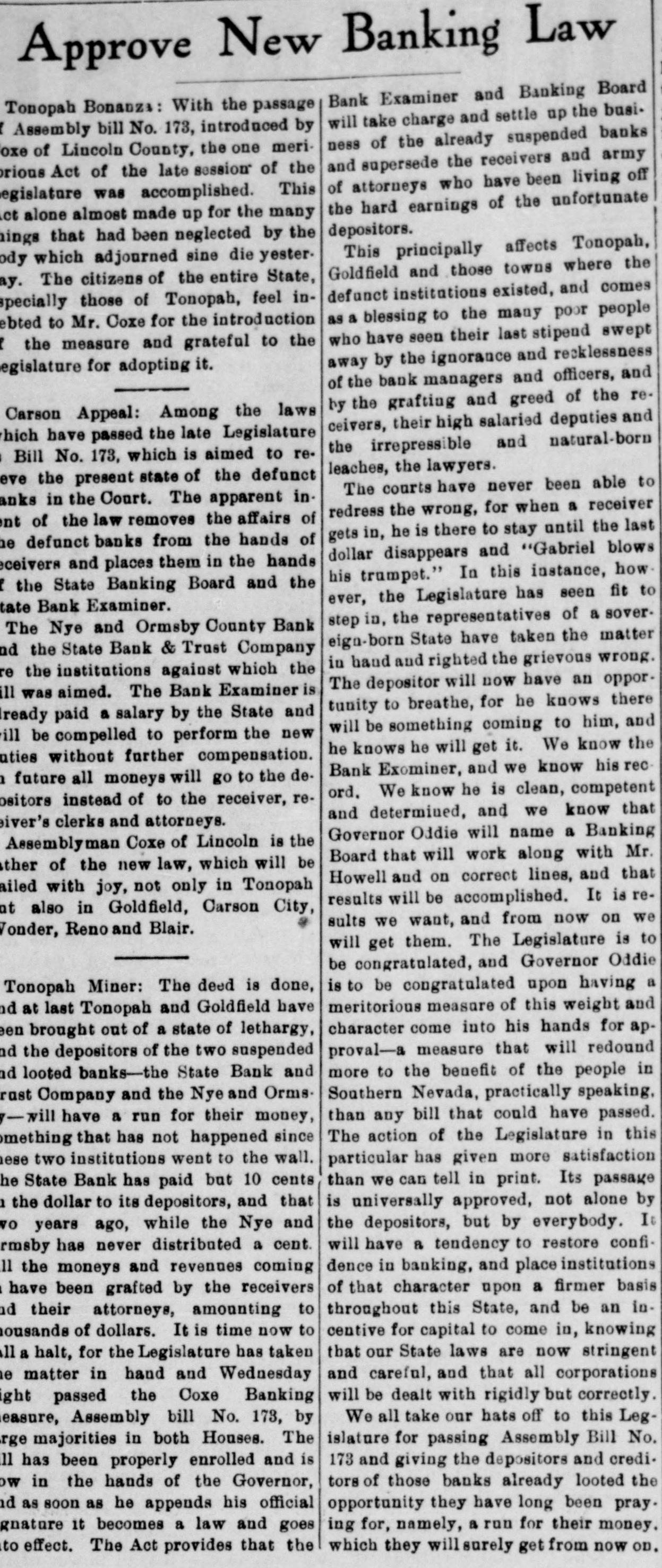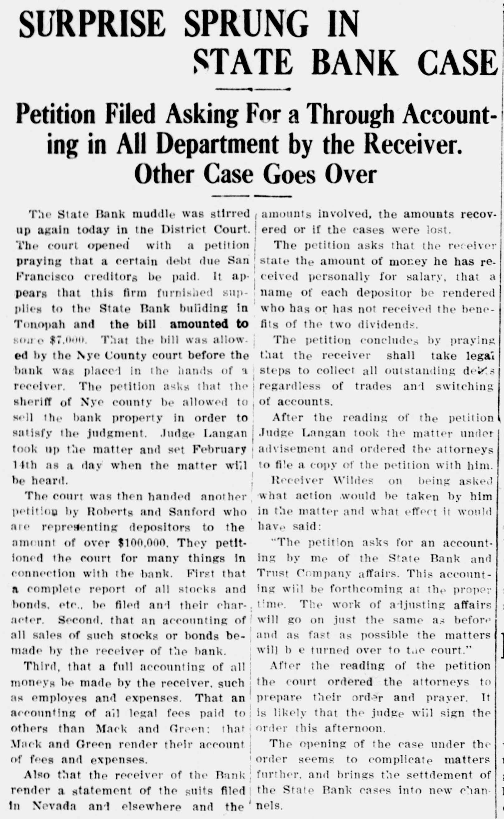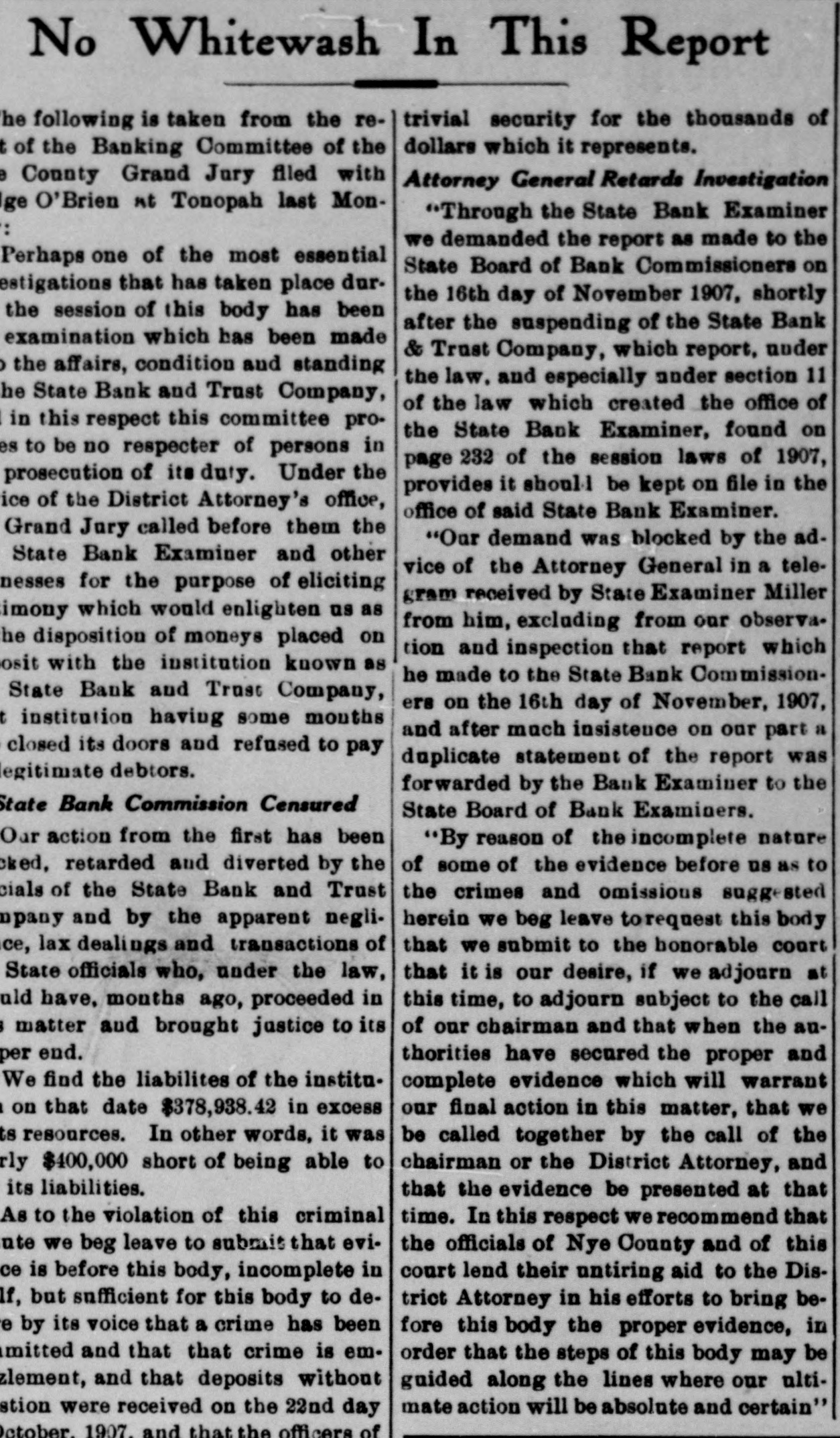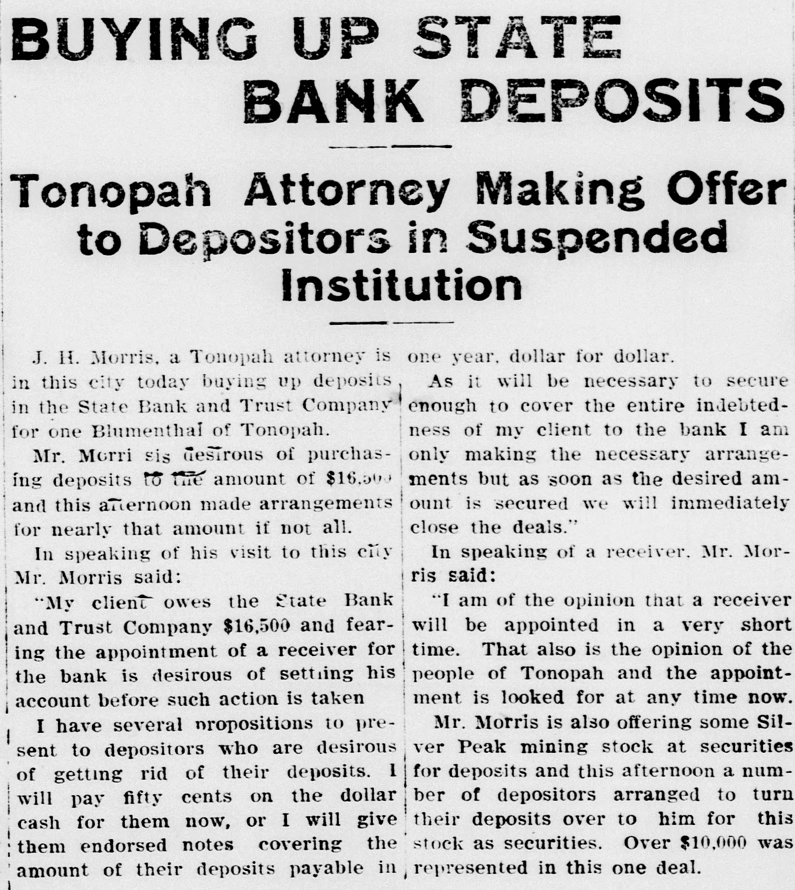Tonopah. Oct. 25.-This has been a strenuous week for Tonopah, but that the worst has passed, is the conviction of everybody. There are no croakers here, and the people were quick to recover from the daze into which they were thrown by the announcement of the suspension of the State Bank and Trust company. The closing of the doors of the institution came like a thunderclap from a clear sky; although there now are found one or two who "knew it was coming." These people knew more than did Cashier Cushman, who was well nigh prostrated when he received the telegram to close the bank, and discharge the employes. He could give no further explanation than that the bank had tried to do too much when it essayed to carry its clients, on securities, which the fall in the market made no securities at all. Mr. Cushman has declared that the bank will still continue to carry these clients, and will find another way of paying its depositors than by forcing anybody to the wall. No runs of any consequence followed the suspension of the State Bank, but were it not for the action of Governor Sparks in declaring the legal holidays, the general impression is that there would have been a great many institutions in the state, gone the way of the State Bank and Trust company. There were not a few demands made on the Nye & Ormsby bank on Wednesday, but the bank declared that it was not seriously embarrassed. It was feared that the morrow might bring trouble, and it was decided by Frank Golden to close all the branches of the bank on Thursday morning. George Wingfield was over here on Wednesday night with several sacks of twenty dollar pieces for the greater safety of the Tonopah Banking Corporation, and he refused to co-operate with the other banks to the extent of closing up the Wingfield and Nixon bank. In the general distress personalities cropped out. Golden, of the Nye & Ormsby has a strong dislike for Thomas Rickey of the State Bank & Trust company, and Nixon loves Golden as the devil does holy water. A plan was essayed for the aid of everybody, and Wingfield was asked to close up his banks, but he refused to do so. The story is that Frank Golden, who is close to the governor, went to him, and explained that the banks of the state were in a very bad condition, with regard to ready money, and that the best thing that could be done was to declare a number of holidays, as was done in the days of San Francisco's disaster. The governor lent a willing ear. and the thing was done. Wingfield was much disappointed, but he declared that his banks were ready to hand out the money to their depositors at any time. When the holiday was declared the brokers and bankers here wired to the San Francisco Stock and Exchange Board, urgently requesting the brokers to close up as every bank in Nevada had closed its doors in consequence of the enforced holidays. The San Francisco board did not refuse to accede to the wishes of the Tonopah men, but sent a reply to the effect that the keeping of the board open would be the strongest argument that could be made to the east of the stability of Nevada's stocks. The bears in the market had jumped on the Nevada stocks in the morning, and had borne them away down. This was more than the people of Tonopah could bear with patience, and soon the wires were singing with buying orders into San Francisco. The result was that the market steadied and then rebounded several points above the break of the morning. The demand here was principally for Jim Butler, Midway, Belmont and the other stocks on the hill. There was money and plenty of it dug up from some where, and it all went into the stock market, and helped to sustain
