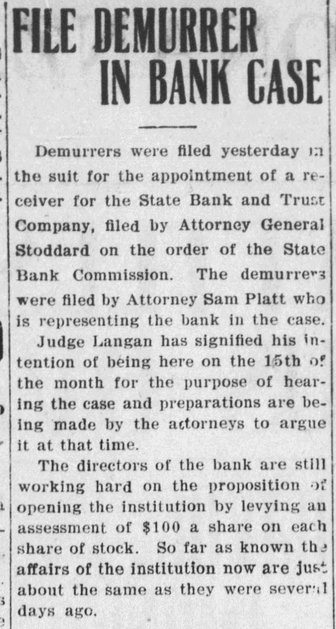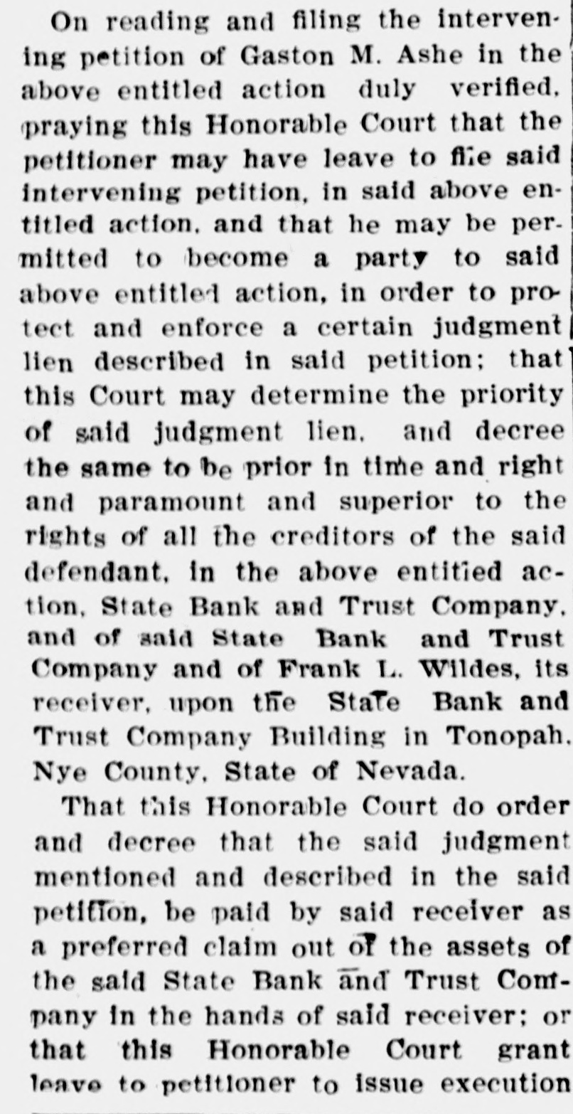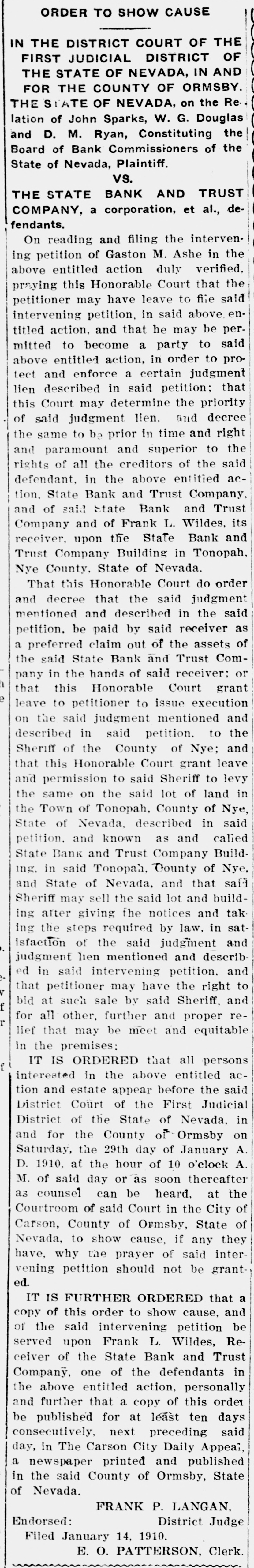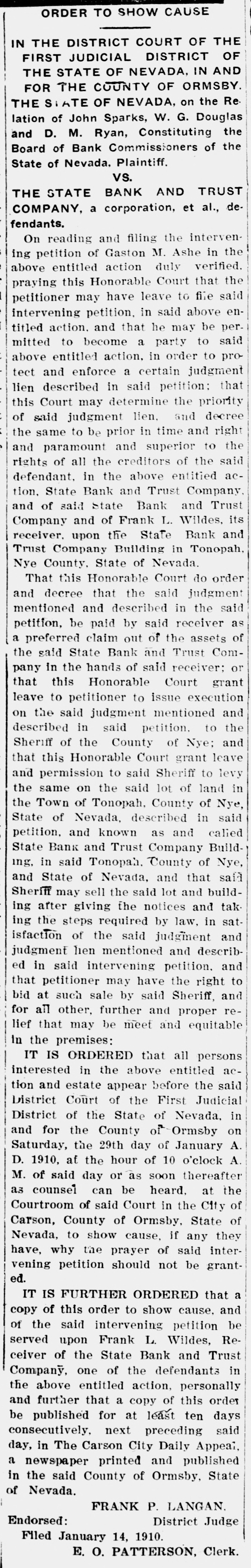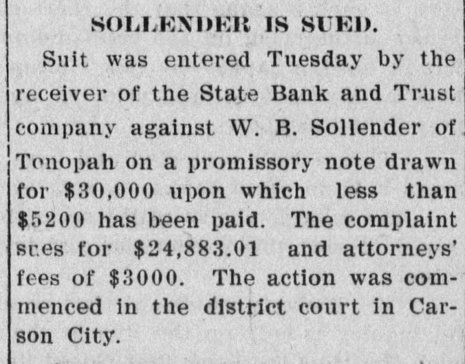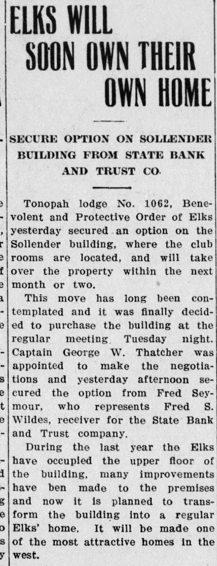 Tonopah. Oct. 25.-This has been a strenuous week for Tonopah, but that the worst has passed, is the conviction of everybody. There are no croakers here, and the people were quick to recover from the daze into which they were thrown by the announcement of the suspension of the State Bank and Trust company. The closing of the doors of the institution came like a thunderclap from a clear sky; although there now are found one or two who "knew it was coming." These people knew more than did Cashier Cushman, who was well nigh prostrated when he received the telegram to close the bank, and discharge the employes. He could give no further explanation than that the bank had tried to do too much when it essayed to carry its clients, on securities, which the fall in the market made no securities at all. Mr. Cushman has declared that the bank will still continue to carry these clients, and will find another way of paying its depositors than by forcing anybody to the wall. No runs of any consequence followed the suspension of the State Bank, but were it not for the action of Governor Sparks in declaring the legal holidays, the general impression is that there would have been a great many institutions in the state, gone the way of the State Bank and Trust company. There were not a few demands made on the Nye & Ormsby bank on Wednesday, but the bank declared that it was not seriously embarrassed. It was feared that the morrow might bring trouble, and it was decided by Frank Golden to close all the branches of the bank on Thursday morning. George Wingfield was over here on Wednesday night with several sacks of twenty dollar pieces for the greater safety of the Tonopah Banking Corporation, and he refused to co-operate with the other banks to the extent of closing up the Wingfield and Nixon bank. In the general distress personalities cropped out. Golden, of the Nye & Ormsby has a strong dislike for Thomas Rickey of the State Bank & Trust company, and Nixon loves Golden as the devil does holy water. A plan was essayed for the aid of everybody, and Wingfield was asked to close up his banks, but he refused to do so. The story is that Frank Golden, who is close to the governor, went to him, and explained that the banks of the state were in a very bad condition, with regard to ready money, and that the best thing that could be done was to declare a number of holidays, as was done in the days of San Francisco's disaster. The governor lent a willing ear. and the thing was done. Wingfield was much disappointed, but he declared that his banks were ready to hand out the money to their depositors at any time. When the holiday was declared the brokers and bankers here wired to the San Francisco Stock and Exchange Board, urgently requesting the brokers to close up as every bank in Nevada had closed its doors in consequence of the enforced holidays. The San Francisco board did not refuse to accede to the wishes of the Tonopah men, but sent a reply to the effect that the keeping of the board open would be the strongest argument that could be made to the east of the stability of Nevada's stocks. The bears in the market had jumped on the Nevada stocks in the morning, and had borne them away down. This was more than the people of Tonopah could bear with patience, and soon the wires were singing with buying orders into San Francisco. The result was that the market steadied and then rebounded several points above the break of the morning. The demand here was principally for Jim Butler, Midway, Belmont and the other stocks on the hill. There was money and plenty of it dug up from some where, and it all went into the stock market, and helped to sustain