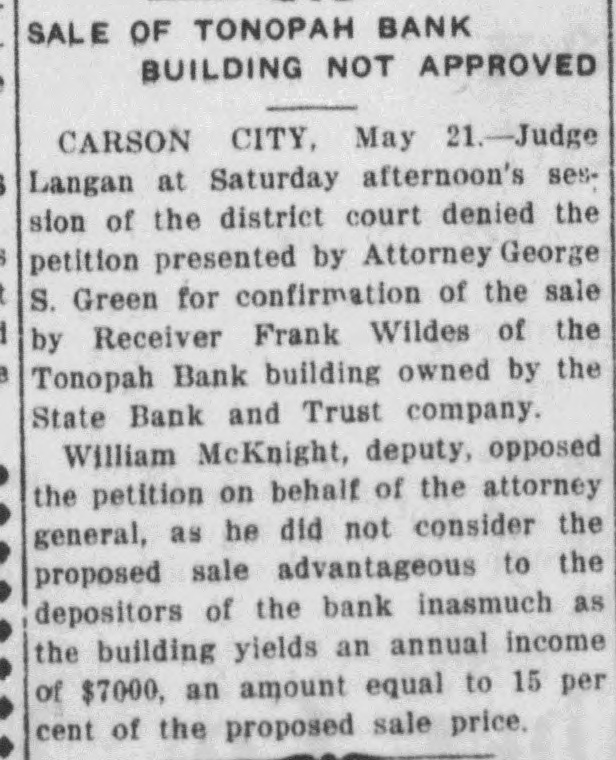 SALE OF TONOPAH BANK BUILDING NOT APPROVED CARSON CITY, May 21.-Judge Langan at Saturday afternoon's session of the district court denied the petition presented by Attorney George S. Green for confirmation of the sale by Receiver Frank Wildes of the Tonopah Bank building owned by the State Bank and Trust company. William McKnight, deputy, opposed the petition on behalf of the attorney general, as he did not consider the proposed sale advantageous to the depositors of the bank inasmuch as the building yields an annual income of $7000, an amount equal to 15 per cent of the proposed sale price.