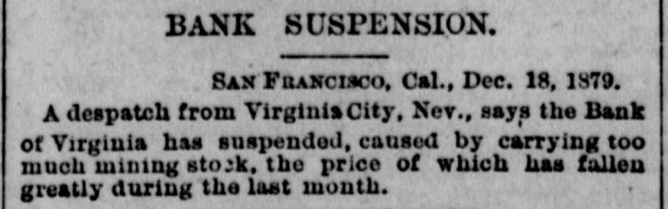 BANK SUSPENSION. SAN FRANCISCO, Cal., Dec. 18, 1879. A despatch from Virginia City, Nev., says the Bank of Virginia has suspended, caused by carrying too much mining stock, the price of which has fallen greatly during the last month.