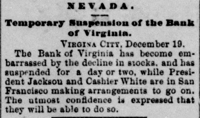 NEVADA. Temporary Suspension of the Bank of Virginia. VIRGINA CITY, December 19. The Bank of Virginia has become embarrassed by the decline in stocks. and has suspended for a day or two, while President Jackson and Cashier White are in San Francisco making arrangements to go on. The utmost confidence is expressed that they will be able to do so.