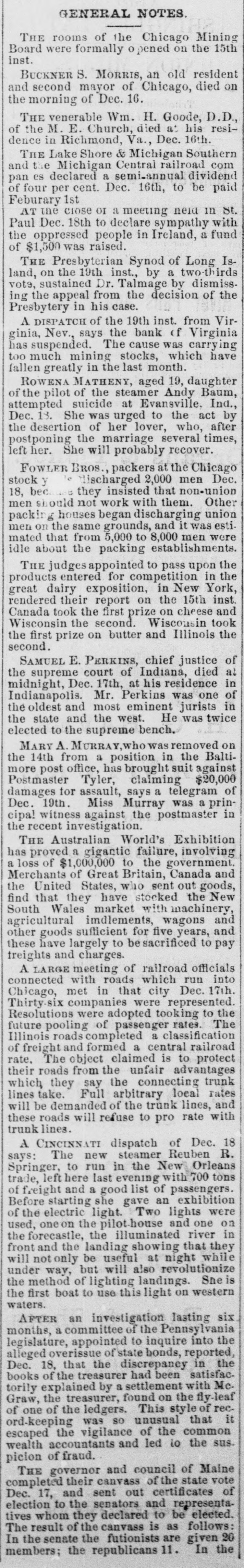 GENERAL NOTES. THE rooms of the Chicago Mining Board were formally o pened on the 15th inst. BUCKNER S. MORRIS, an old resident and second mayor of Chicago, died on the morning of Dec. 16. THE venerable Wm. H. Goode, D.D., of the M. E. Church, died at his residence in Richmond, Va., Dec. 16th. THE Lake Shore & Michigan Southern and the Michigan Central railroad com pan es declared a semi-annual dividend of four per cent. Dec. 16th, to be paid Feburary 1st as UI preu Suneom U 10 cose aul LV Paul Dec. 18th to declare sympathy with the oppressed people in Ireland, a fund of $1,500 was raised. THE Presbyterian Synod of Long Island, on the 19th inst., by a two-thirds vote, sustained Dr. Talmage by dismissing the appeal from the decision of the Presbytery in his case. A DISPATCH of the 19th inst. from Virginia, Nev., says the bank (f Virginia has suspended. The cause was carrying too much mining stocks, which have fallen greatly in the last month. ROWENA MATHENY, aged 19, daughter of the pilot of the steamer Andy Baum, attempted suicide at Evansville. Ind., Dec. 18. She was urged to the act by the desertion of her lover, who, after postponing the marriage several times, left her. She will probably recover. FOWLER BROS., packers at the Chicago discharged 2,000 men Dec. stock y 18, bec they insisted that non-union men should not work with them. Other packir g houses began discharging union men on the same grounds, and it was estimated that from 5,000 to 8,000 men were idle about the packing establishments. THE judges appointed to pass upon the products entered for competition in the great dairy exposition, in New York, rendered their report on the 15th inst. Canada took the first prize on cheese and Wisconsin the second. Wisconsin took the first prize on butter and Illinois the second. SAMUEL E. PERKINS, chief justice of the supreme court of Indiana, died at midnight, Dec. 17th, at his residence in Indianapolis. Mr. Perkins was one of the oldest and most eminent jurists in the state and the west. He was twice elected to the supreme bench. MARY A. MURRAY, who was removed on the 14th from a position in the Baltimore post office, has brought suit against Postmaster Tyler, claiming $20,000 damages for assault, says a telegram of Dec. 19th. Miss Murray was a principa! witness against the postmaster in the recent investigation. THE Australian World's Exhibition has proved a gigantic failure, involving a loss of $1,000,000 to the government. Merchants of Great Britain, Canada and the United States, who sent out goods, find that they have stocked the New South Wales market with machinery, agricultural imdlements, wagons and other goods sufficient for five years, and these have largely to be sacrificed to pay freights and charges. A LARGE meeting of railroad officials connected with roads which run into Chicago, met in that city Dec. 17th. Thirty companies were represented. Resolutions were adopted tooking to the future pooling of passenger rates. The Illinois roads completed a classification of freight and formed a central railroad rate, The object claimed is to protect their roads from the unfair advantages which they say the connecting trunk lines take. Full arbitrary local rates will be demanded of the trunk lines, and these roads will refuse to pro rate with trunk lines. A CINCINNATI dispatch of Dec. 18 says: The new steamer Reuben R. Springer, to run in the New Orleans trade, left here last evening with 700 tons of freight and a good list of passengers. Before starting she gave an exhibition of the electric light. Two lights were used, oneo the pilot-house and one on the forecastle, the illuminated river in front and the landing showing that they will not only be useful at night while under way, but will also revolutionize the method of lighting landings. She is the first boat to use this light on western waters. AFTER an investigation lasting six months, a committee of the Pennsylvania legislature, appointed to inquire into the alleged overissue of state bonds, reported, Dec. 18, that the discrepancy in the books of the treasurer had been satisfactorily explained by a settlement with Mc. Graw, the treasurer, found on the fly-leaf of of the ledgers. This style of rec.