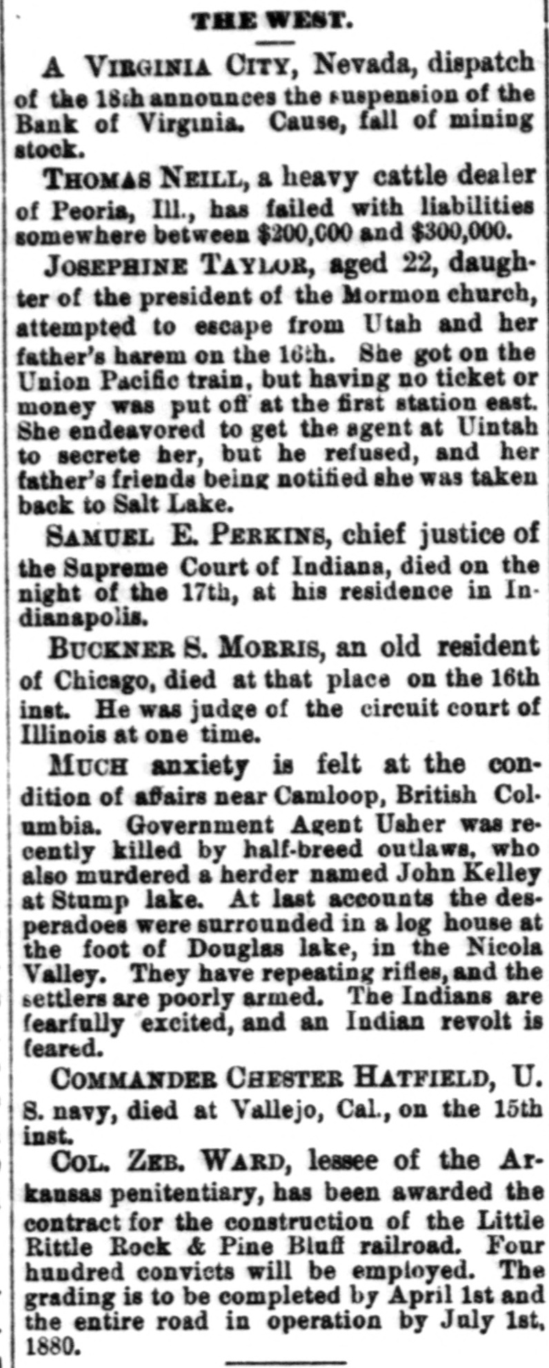 THE WEST. A VIRGINIA CITY, Nevada, dispatch of the 18th announces the suspension of the Bank of Virginia. Cause, fall of mining stock. THOMAS NEILL, a heavy cattle dealer of Peoria, Ill., has failed with liabilities somewhere between $200,000 and $300,000. JOSEPHINE TAYLOR, aged 22, daughter of the president of the Mormon church, attempted to escape from Utah and her father's harem on the 16th. She got on the Union Pacific train, but having no ticket or money was put off at the first station east. She endeavored to get the agent at Uintah to secrete her, but he refused, and her father's friends being notified she was taken back to Salt Lake. SAMUEL E. PERKINS, chief justice of the Supreme Court of Indiana, died on the night of the 17th, at his residence in Indianapolis. BUCKNER S. MORRIS, an old resident of Chicago, died at that place on the 16th inst. He was judge of the circuit court of Illinois at one time. MUCH anxiety is felt at the condition of afairs near Camloop, British Col. umbia. Government Agent Usher was recently killed by half-breed outlaws, who also murdered a herder named John Kelley at Stump lake. At last accounts the desperadoes were surrounded in a log house at the foot of Douglas lake, in the Nicola Valley. They have repeating rifles, and the settlers are poorly armed. The Indians are (earfully excited, and an Indian revolt is feared. COMMANDEE CHESTER HATFIELD, U. S. navy, died at Vallejo, Cal., on the 15th inst. CoL. ZEB. WARD, lessee of the Arkansas penitentiary, has been awarded the contract for the construction of the Little Rittle Rock & Pine Bluff railroad. Four hundred convicts will be employed. The grading is to be completed by April 1st and the entire road in operation by July 1st, 1880.